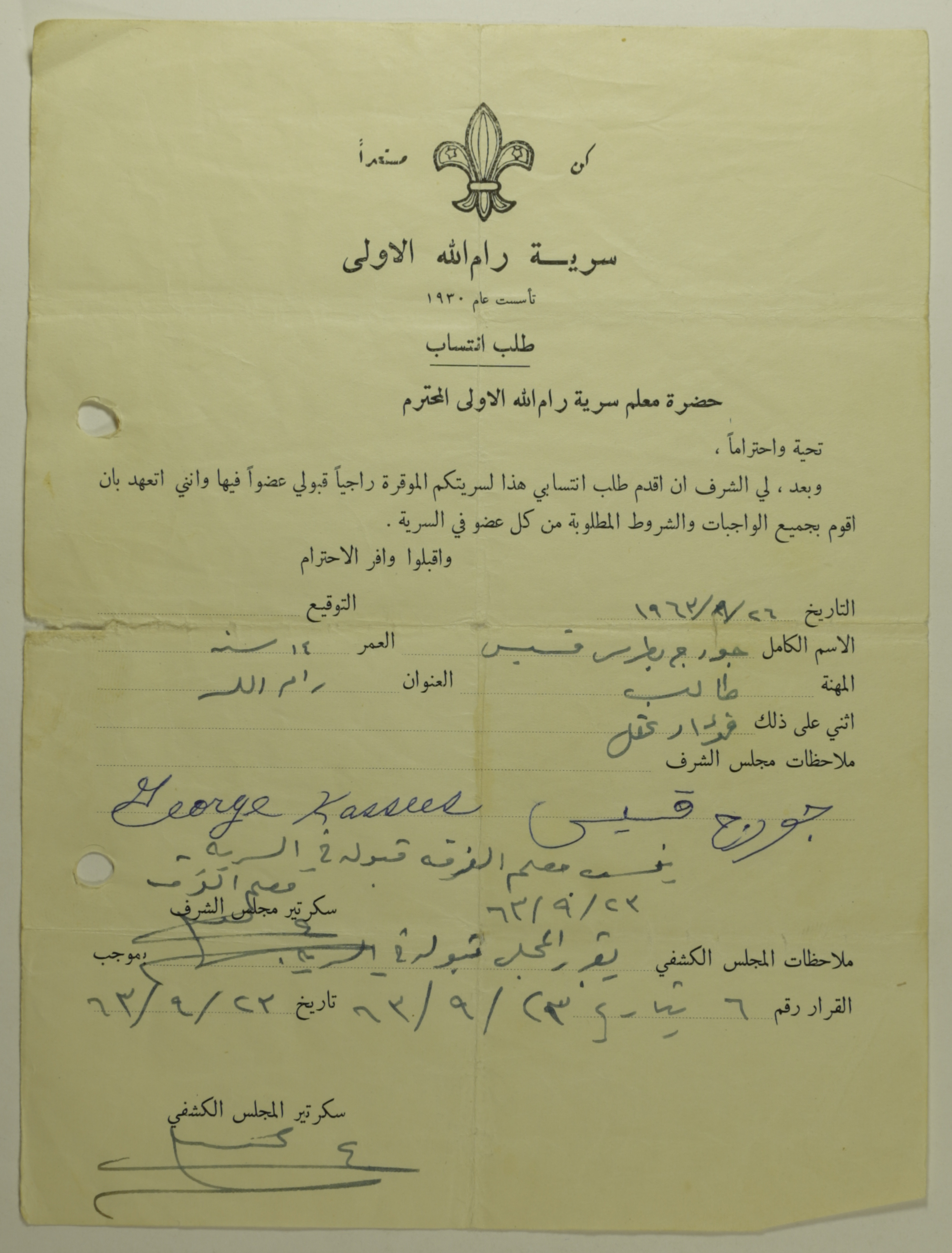 Printed in Arabic, this membership application was submitted by George Qissis in 1963 to join Sareyyet Ramallah pledging to meet all the requirements.