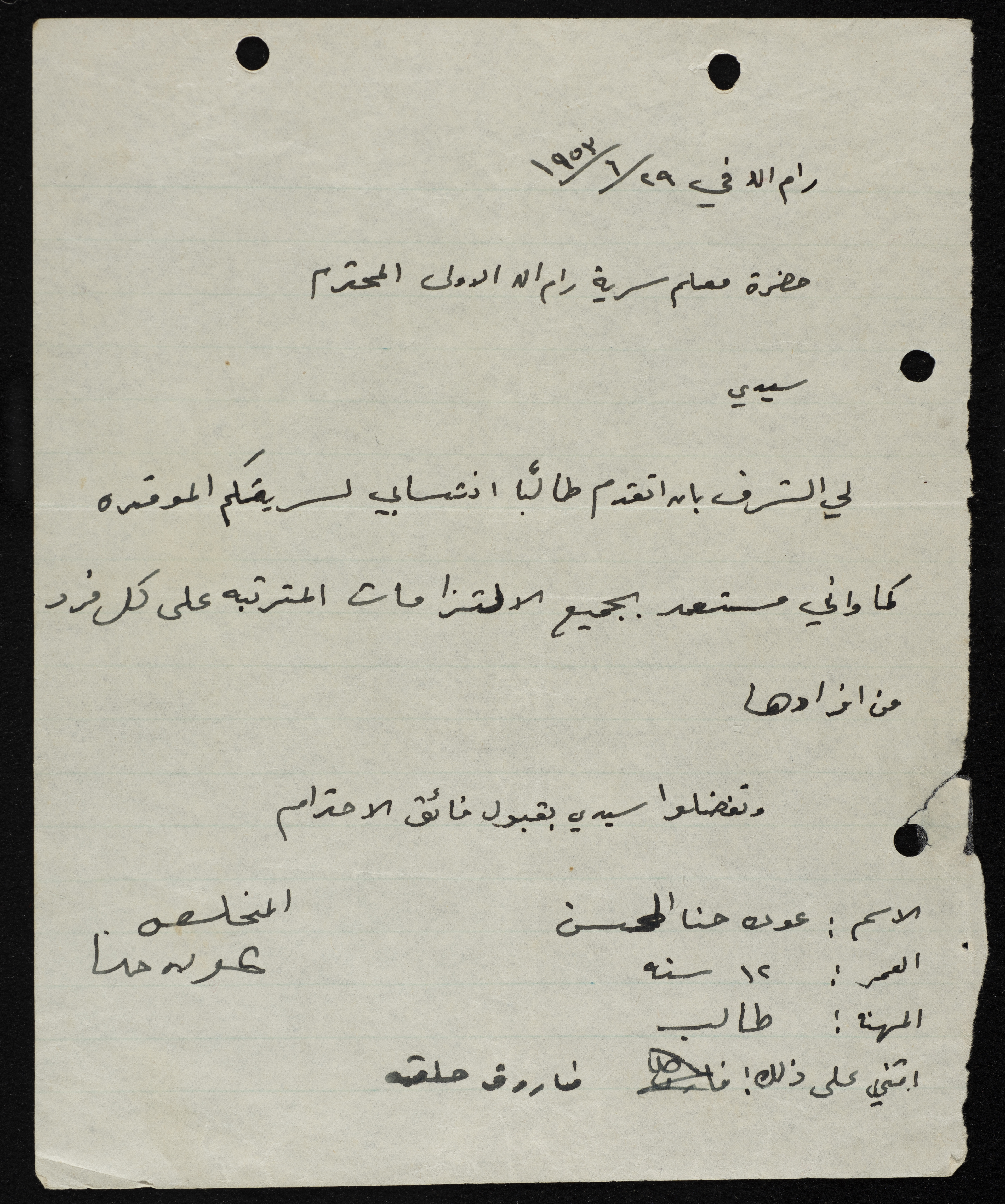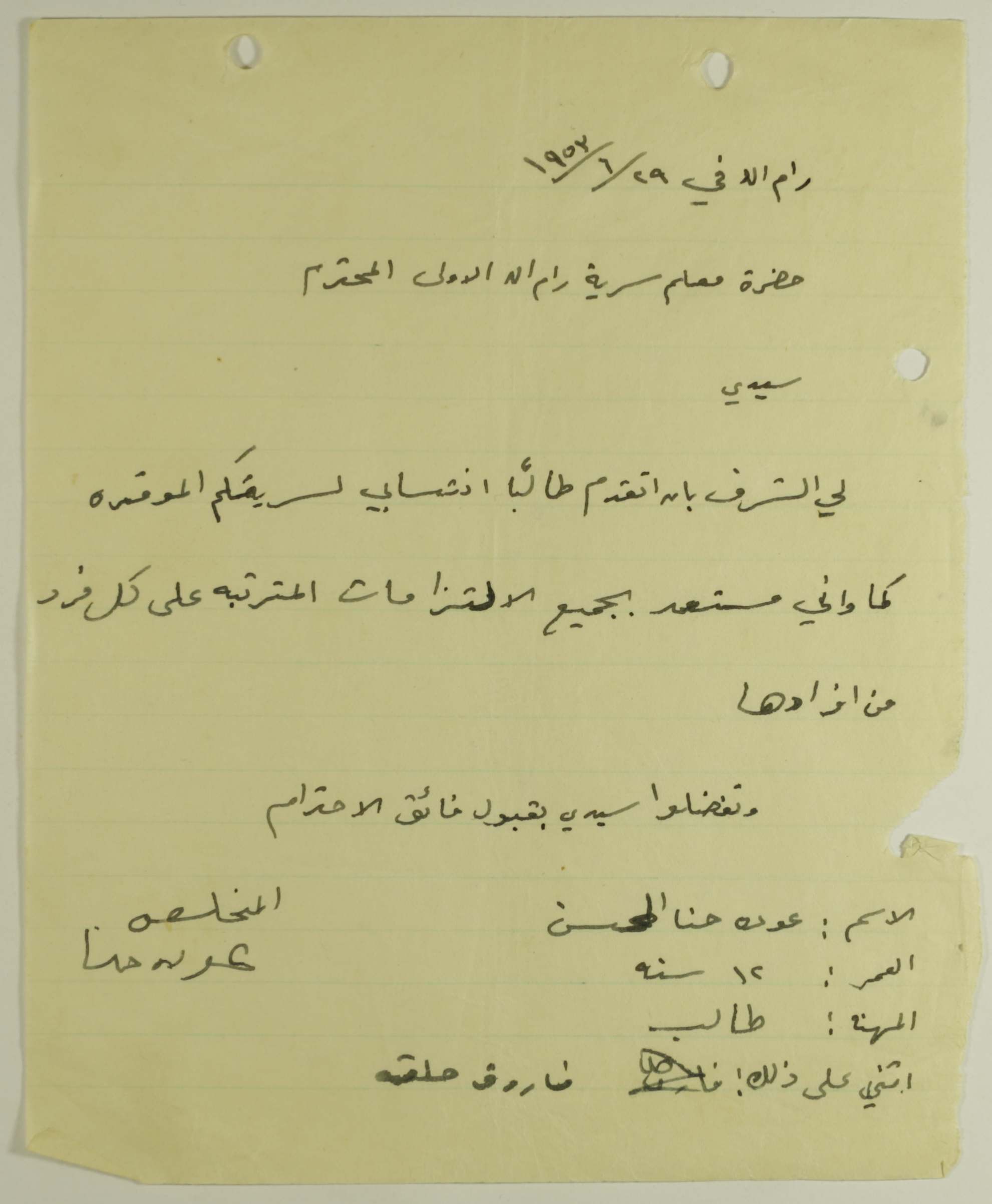 طلب انتساب الى سرية رام الله الاولى عام 1953