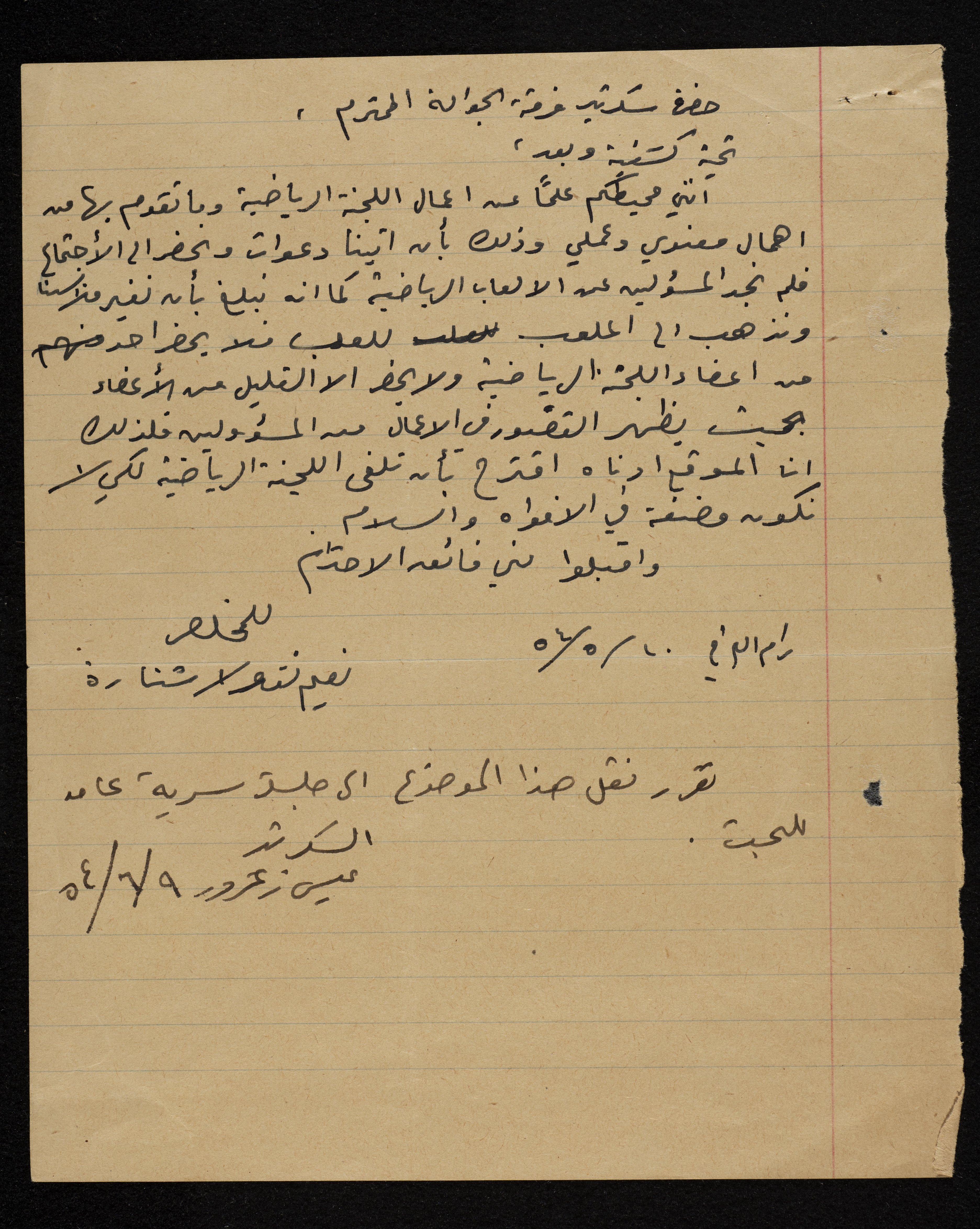وثيقة مكتوبة باللغة العربية، تتضم رسالة الى سكرتير فرقة كشافة رام الله عيسى زعرور عام 1954
