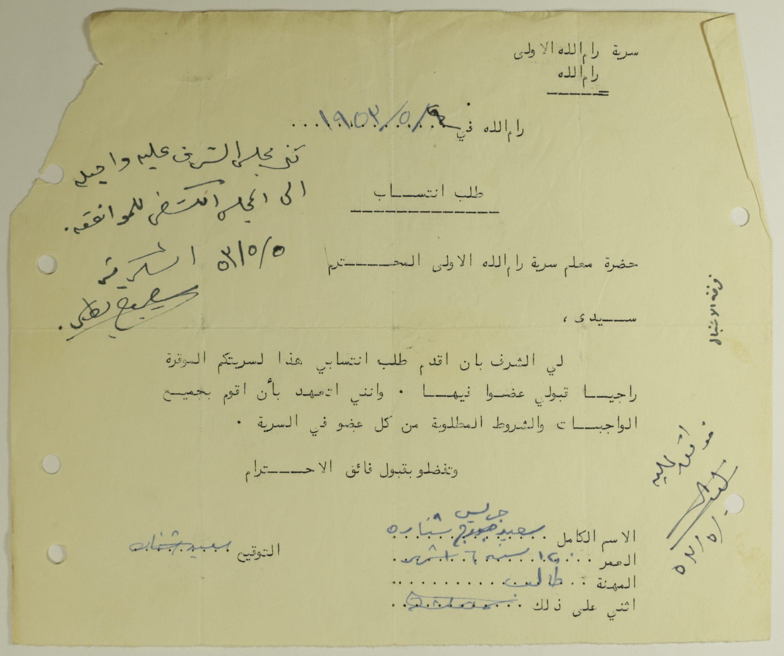 طلب انتساب الى سرية رام الله الاولى عام 1953