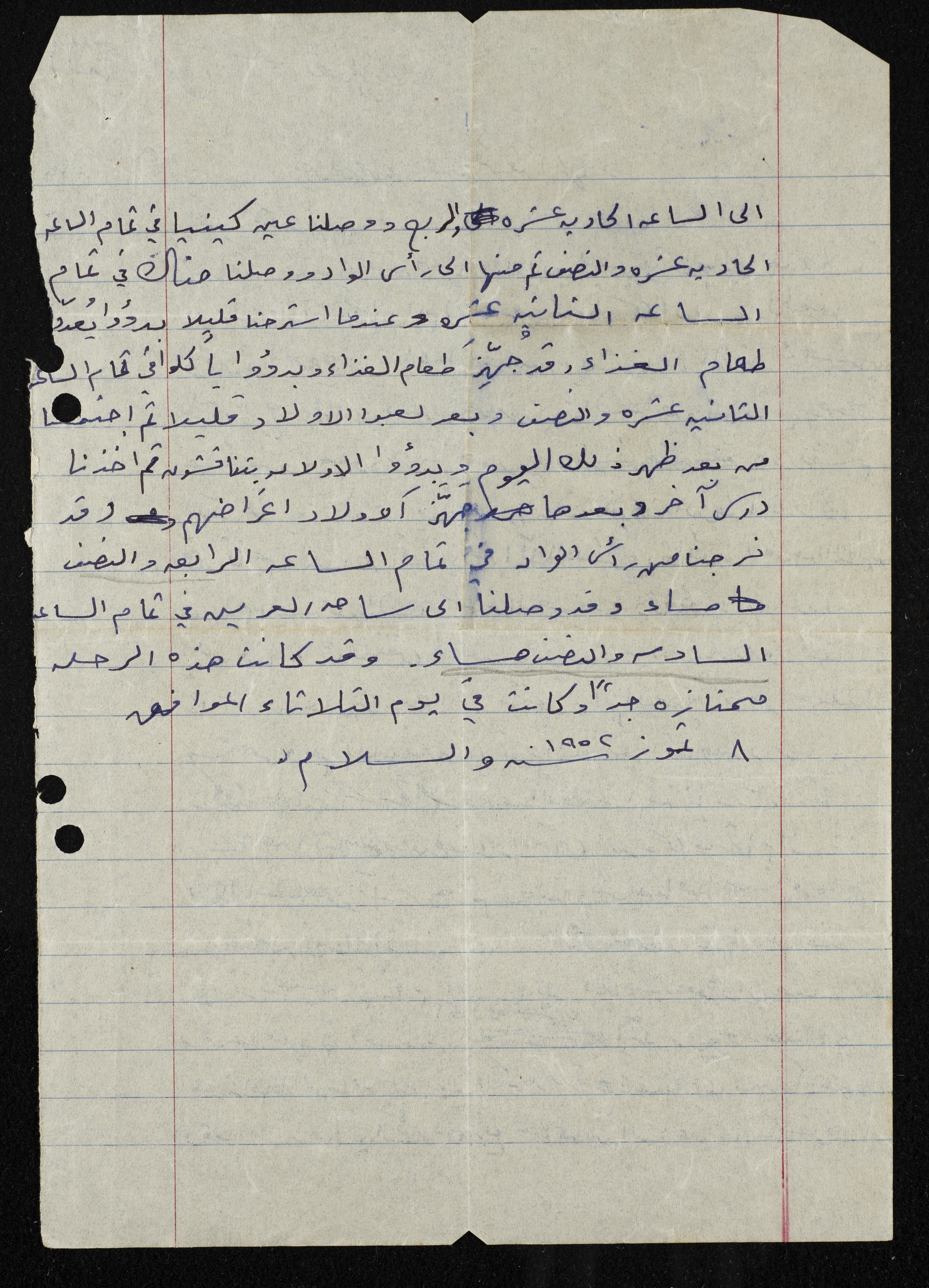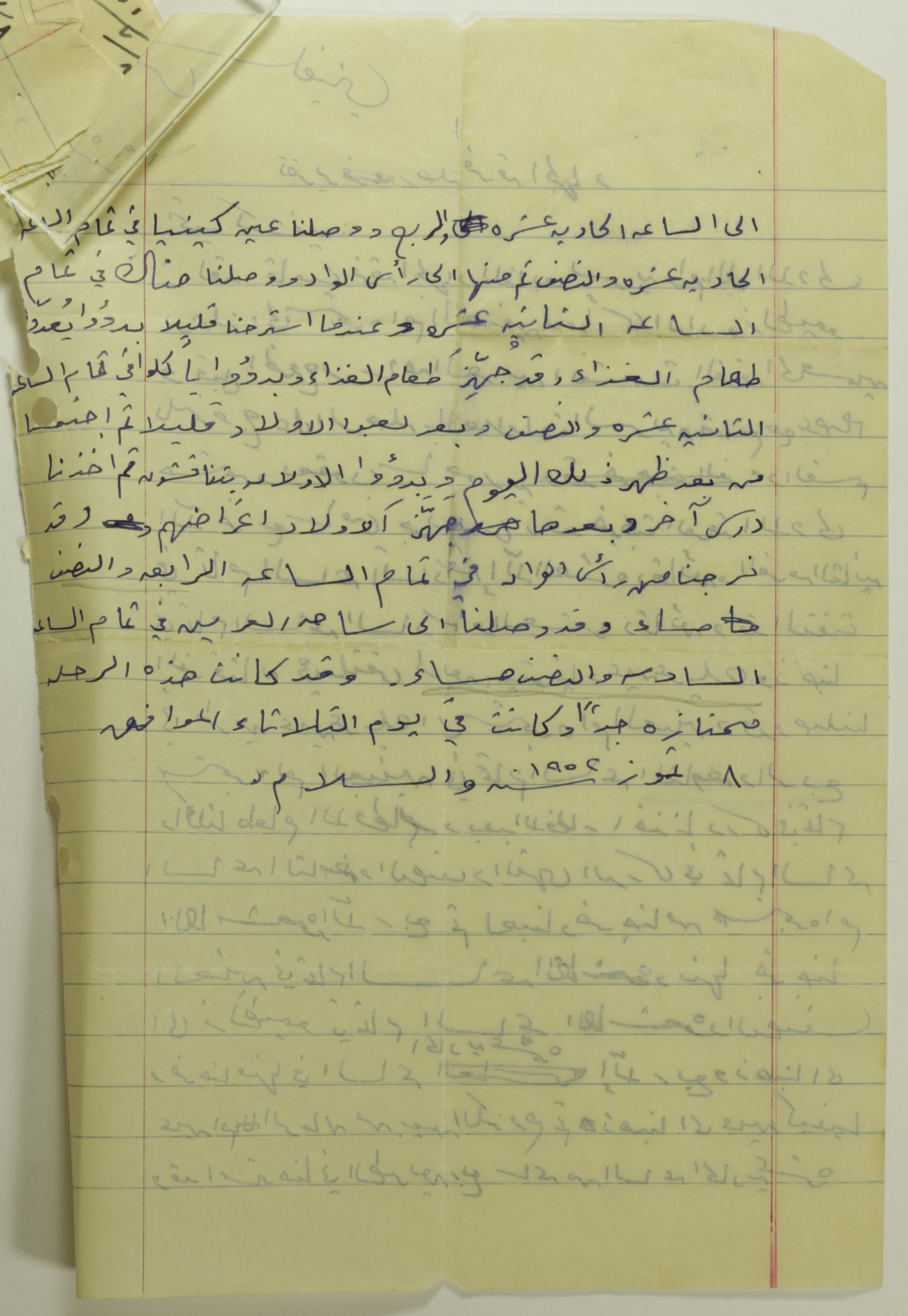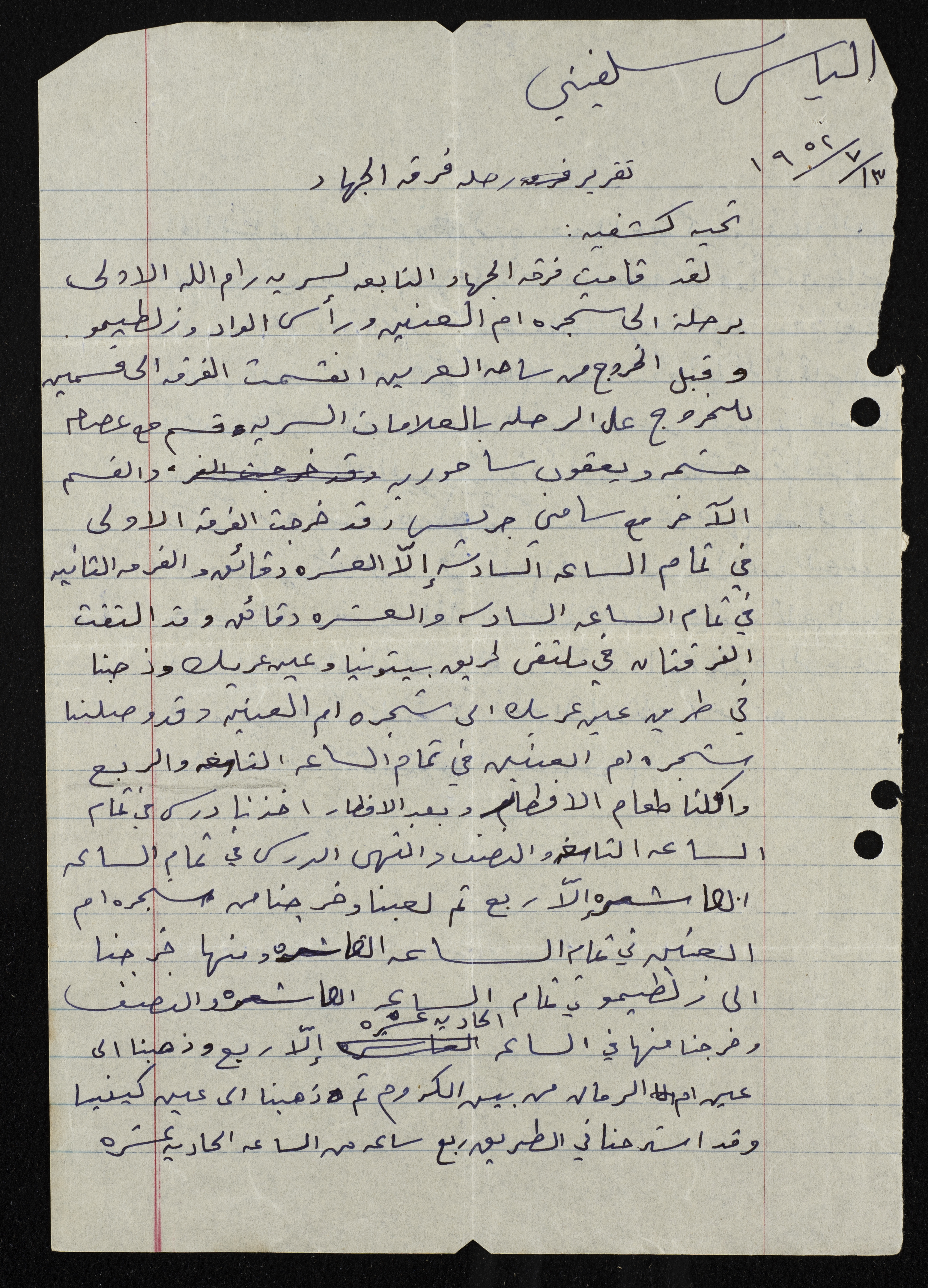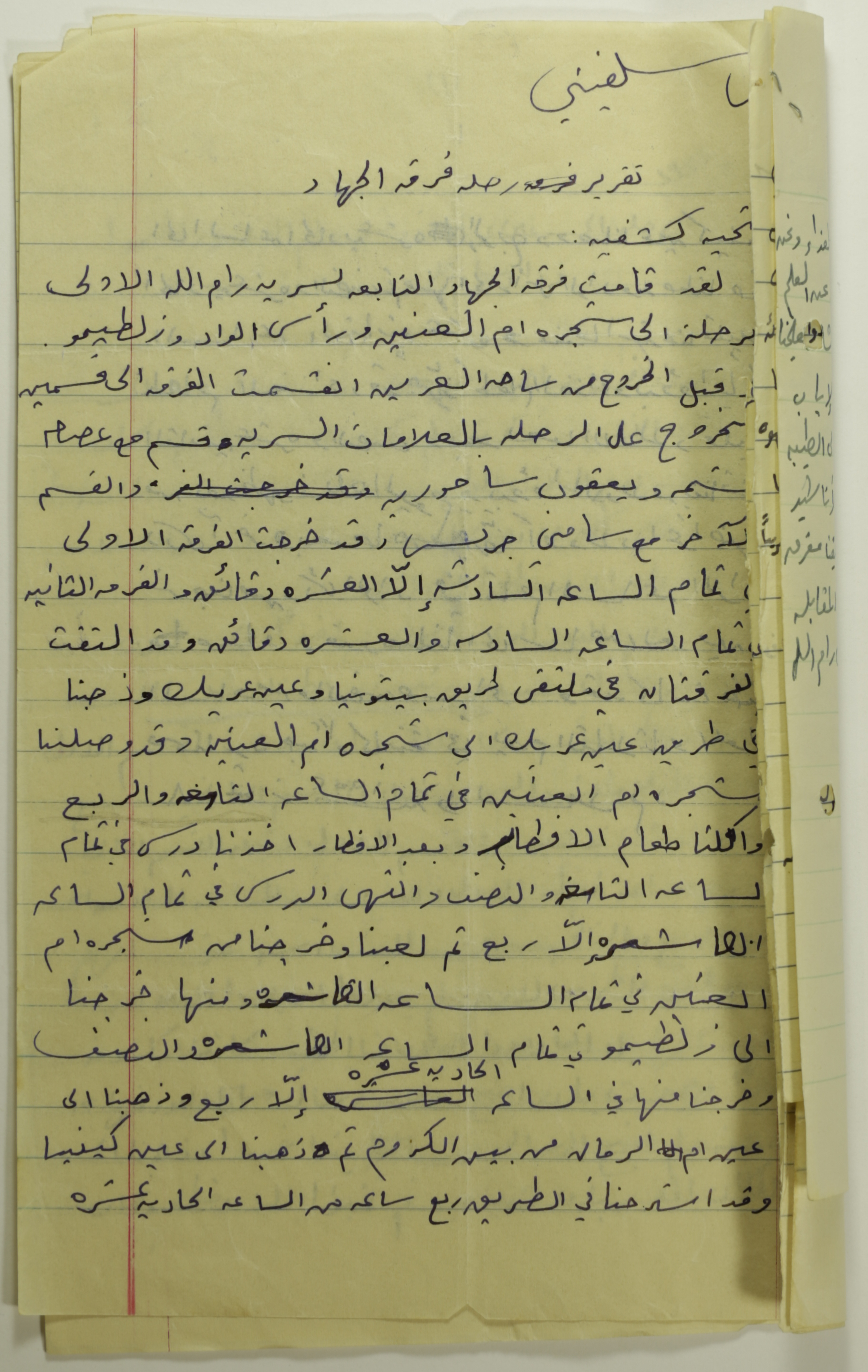 Handwritten in Arabic, this report is on Sareyyet Ramallah Diligence Group's field trip to Shajaret Em el-ʿinain, the head of the valley, and Zalatimo on July 8, 1952.