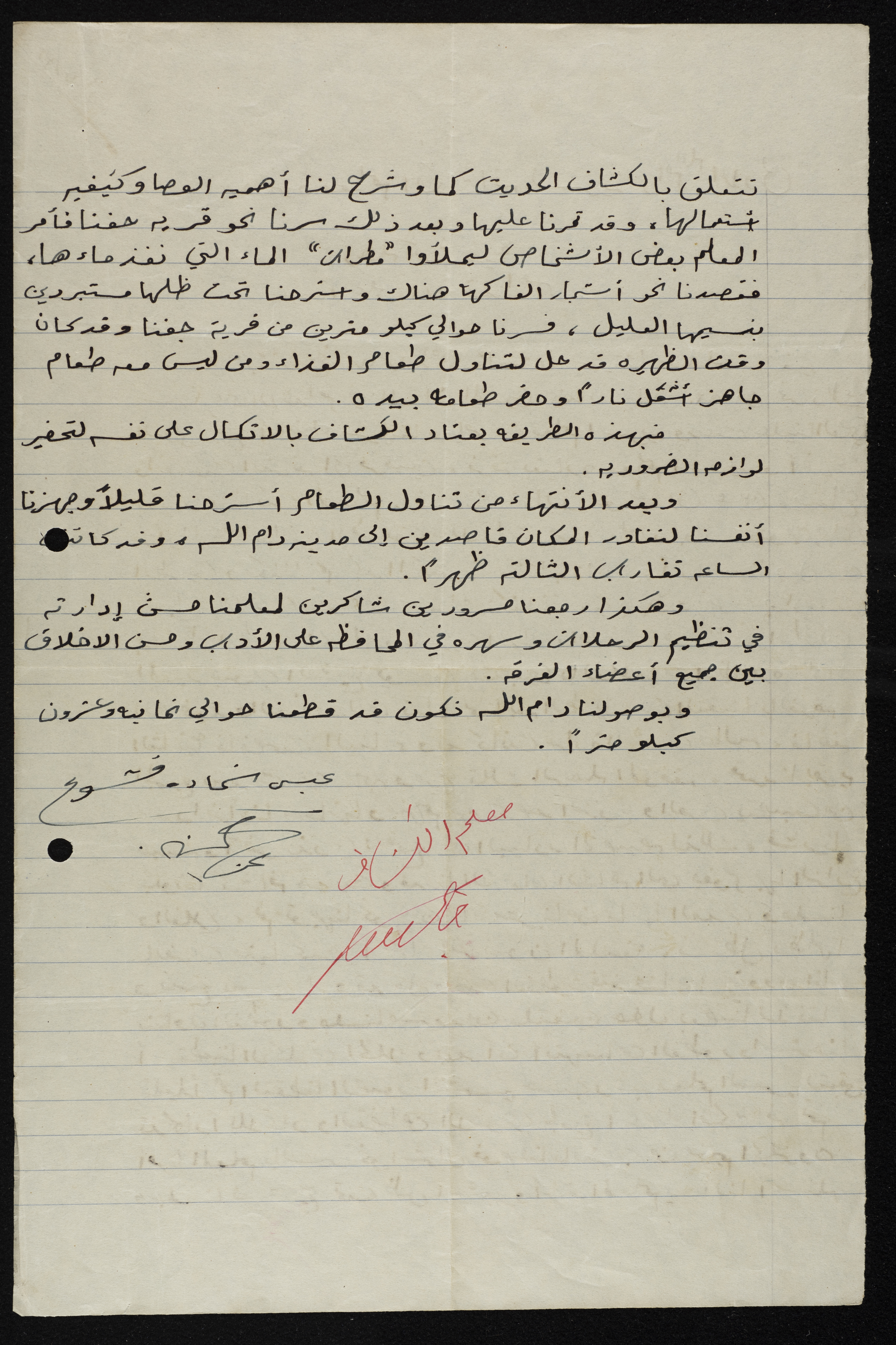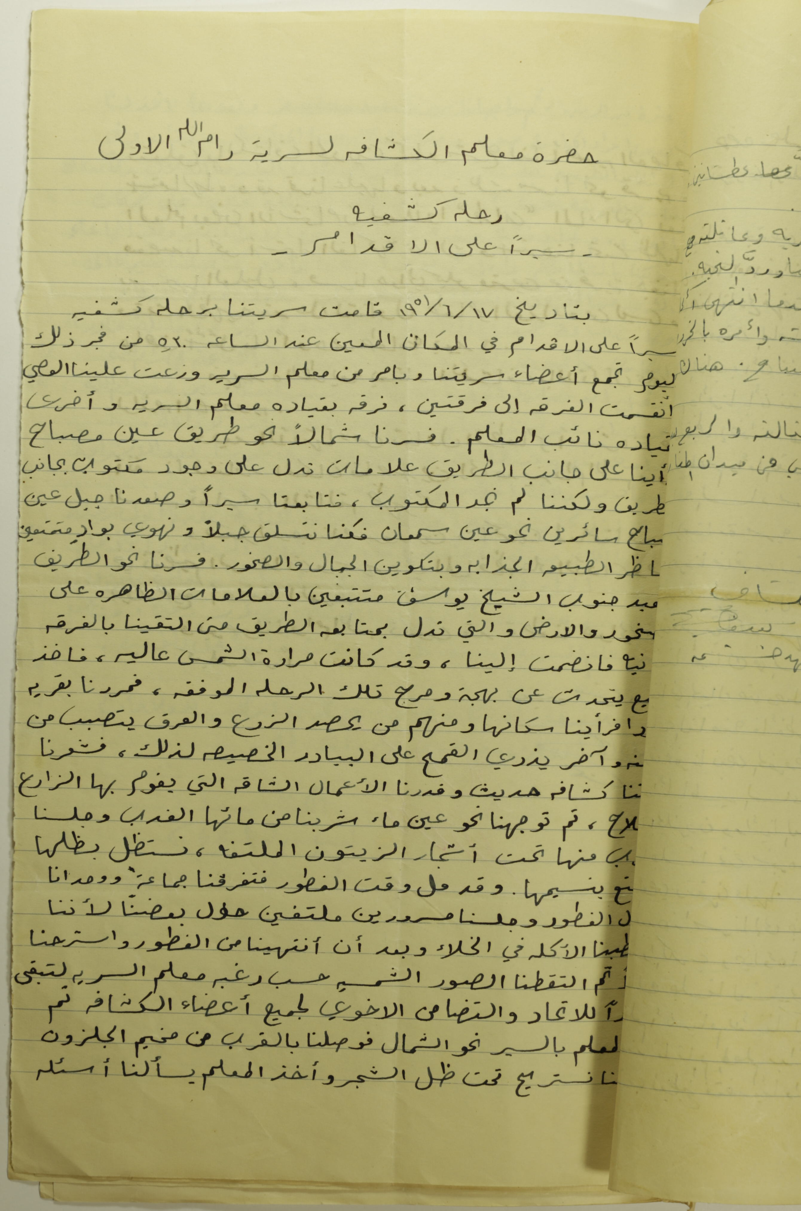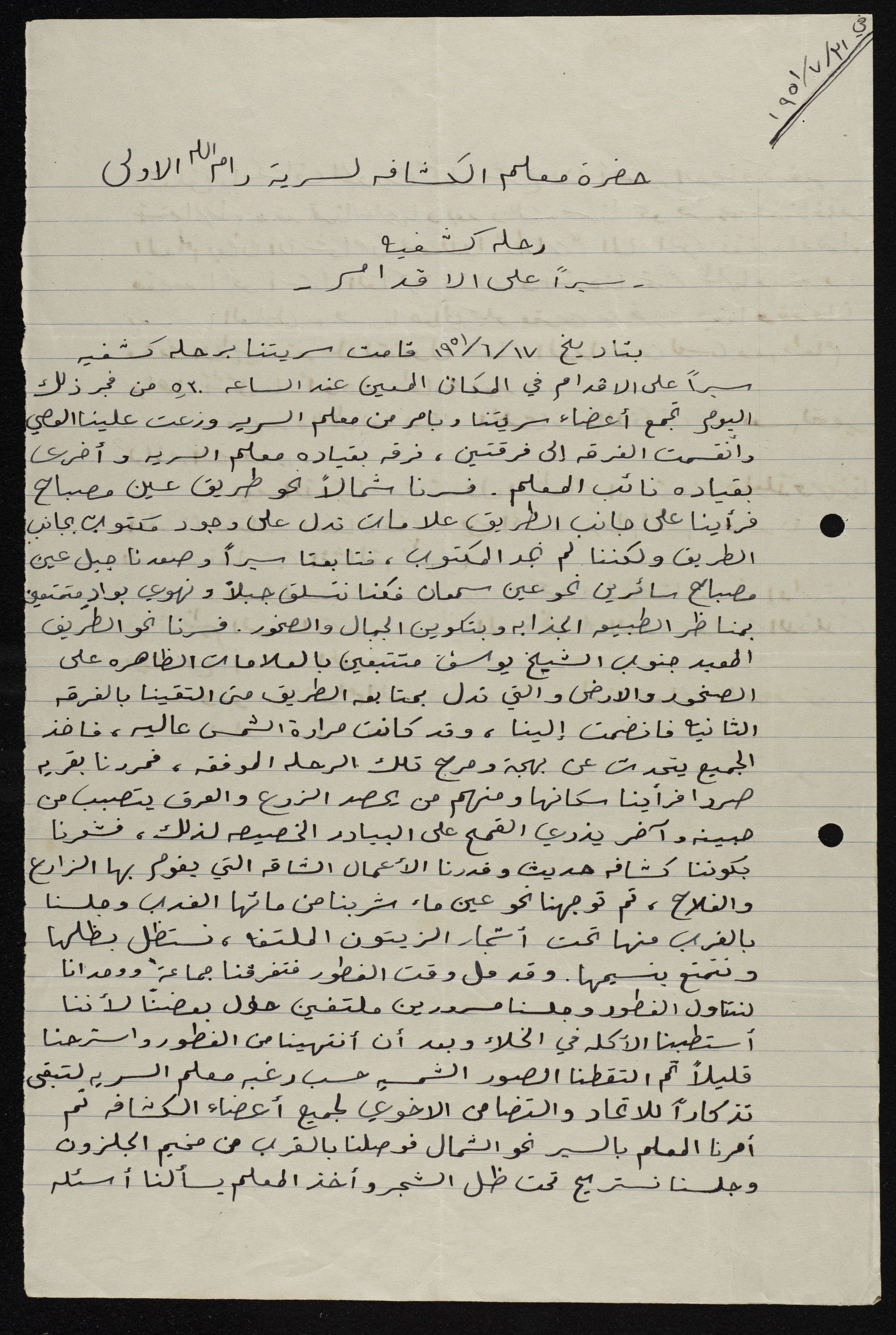 وثيقة مطبوعةة باللغة العربيه، تتضمن تقرير عن رحله كشفيه لسرية رام الله الاولى سرا على الاقدام بتاريخ 17/6/1951 تم التوجه في البدايه نحو طريق عين مصباح ثم نحو عين معان .وتم التسلق الجبال ثم الى جنوب الشيخ يوسف وتم متابع الطريق