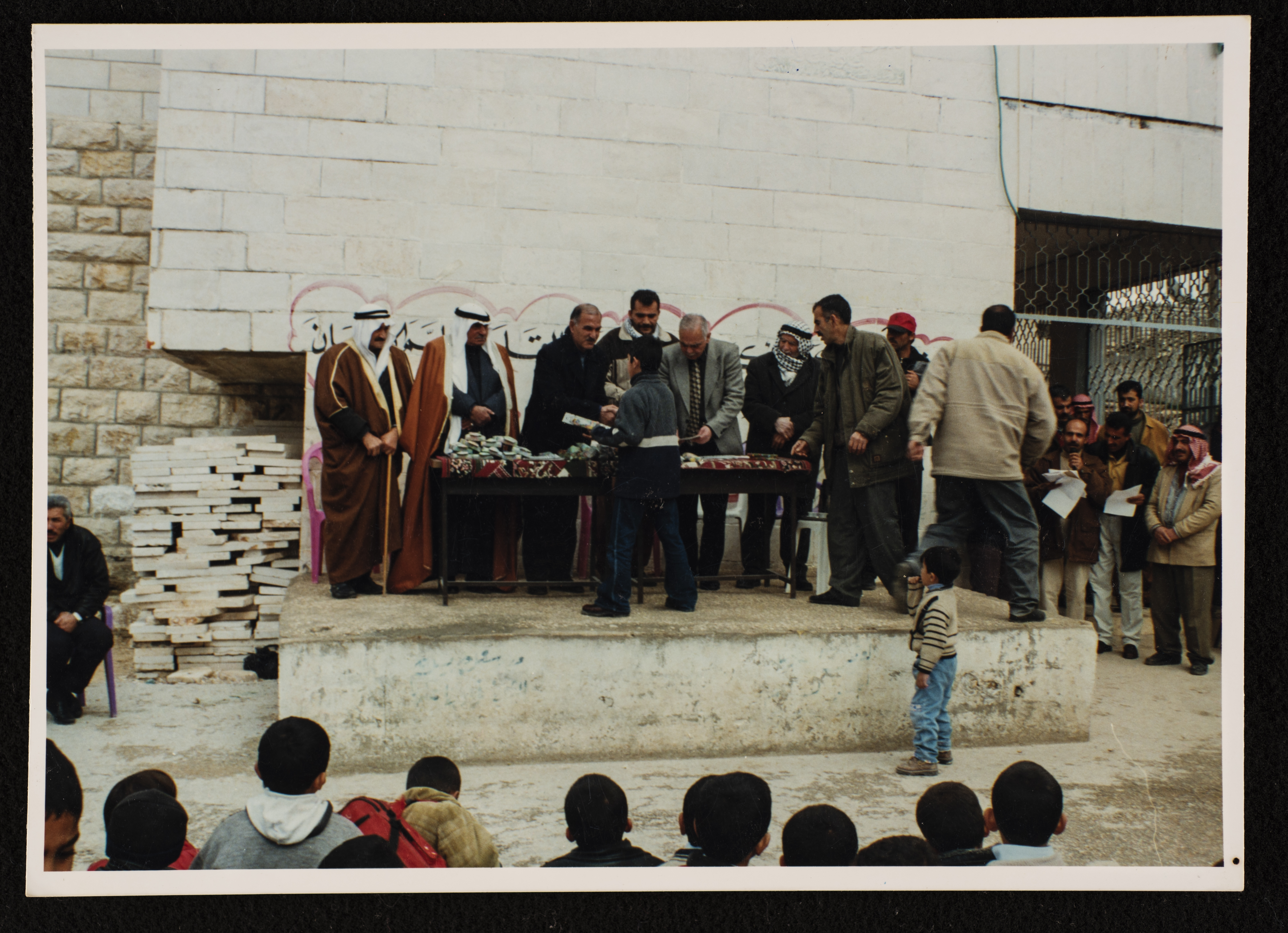 Taken in 2001, this colour photograph was taken at an honouring ceremony for outstanding students at Ash-Shuyukh Primary Boys' School. Muhammad Imran al-Qawasmy, Head of the Hebron Education Directorate at the time, attended the ceremony.