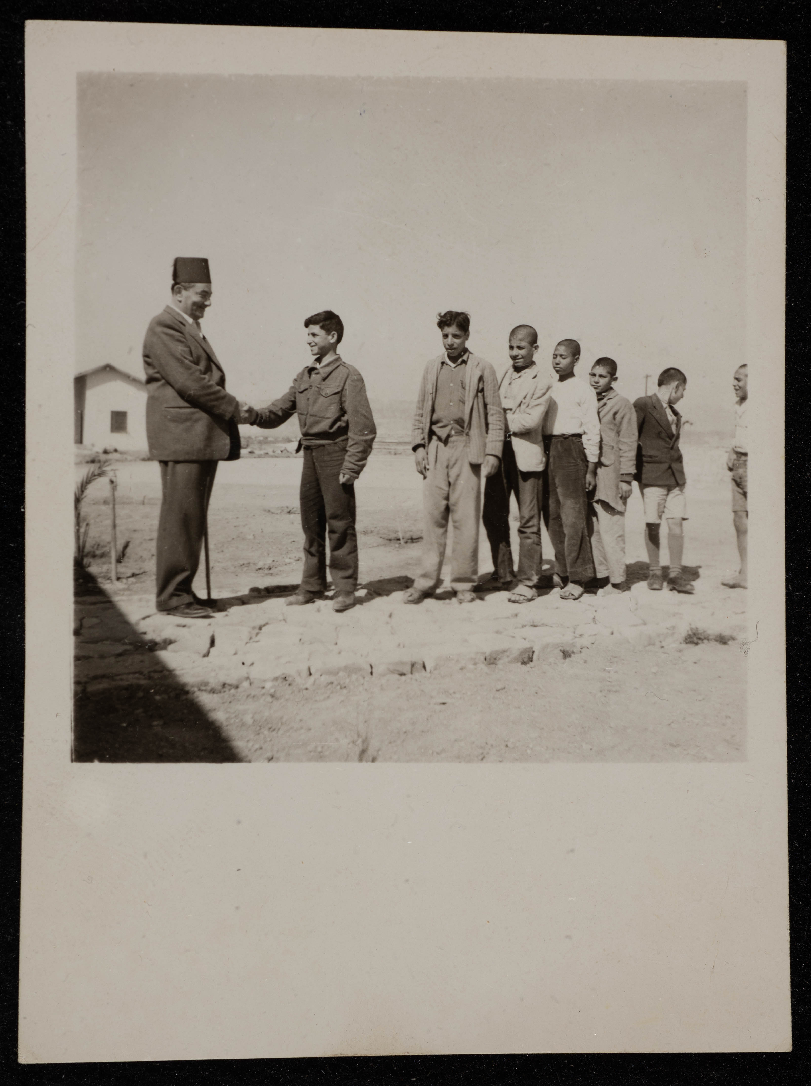 صورة غير ملونة، يظهر فيها طلاب مدرسة المشروع الانشائي العربي مع موسى العلمي. وجدت في مجموعة المشروع الانشائي العربي