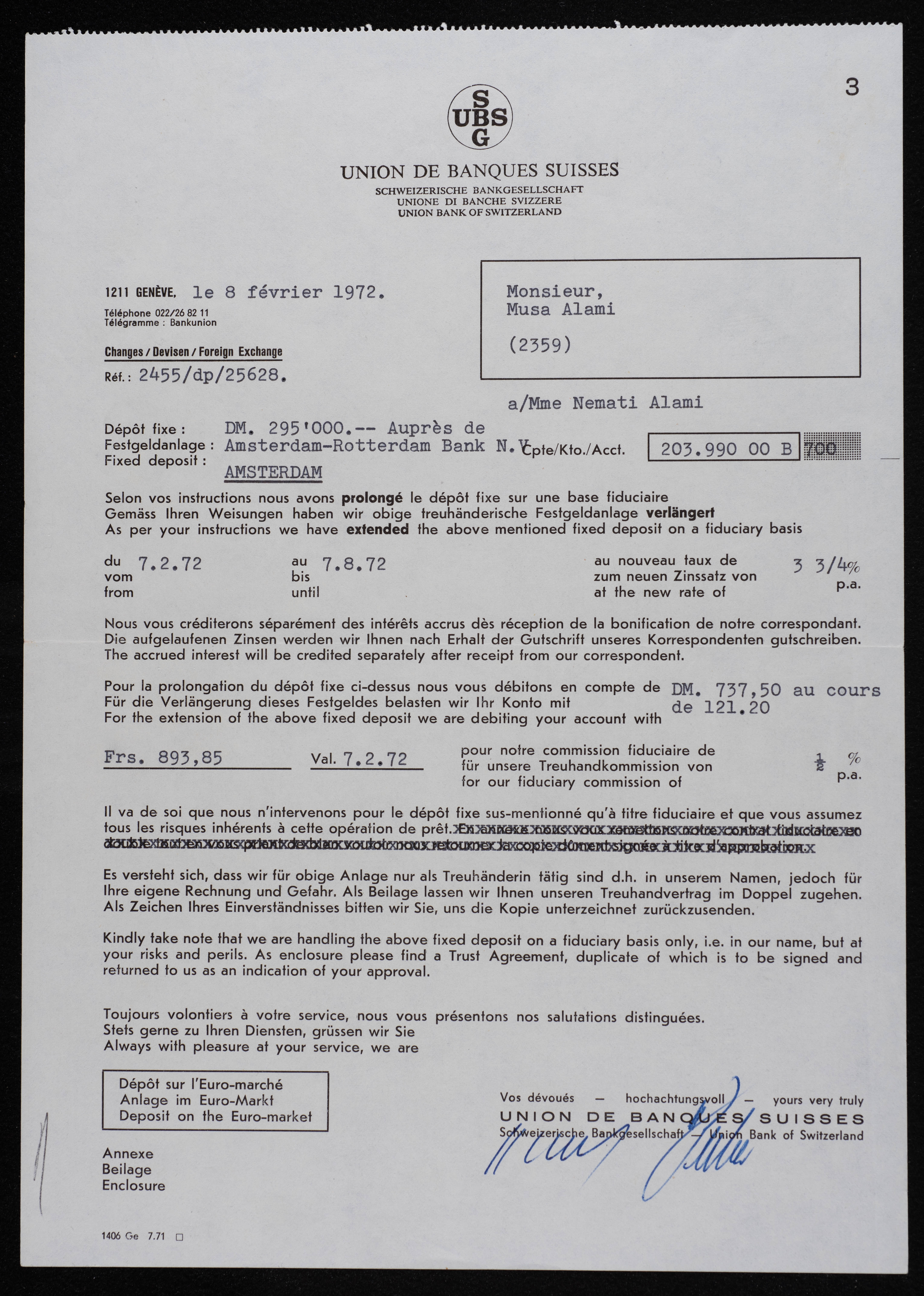 Found in the Arab Development Society Collection, this document shows securities between Musa al-ʿalamy and the Union Bank of Switzerland on 8/02/1972.