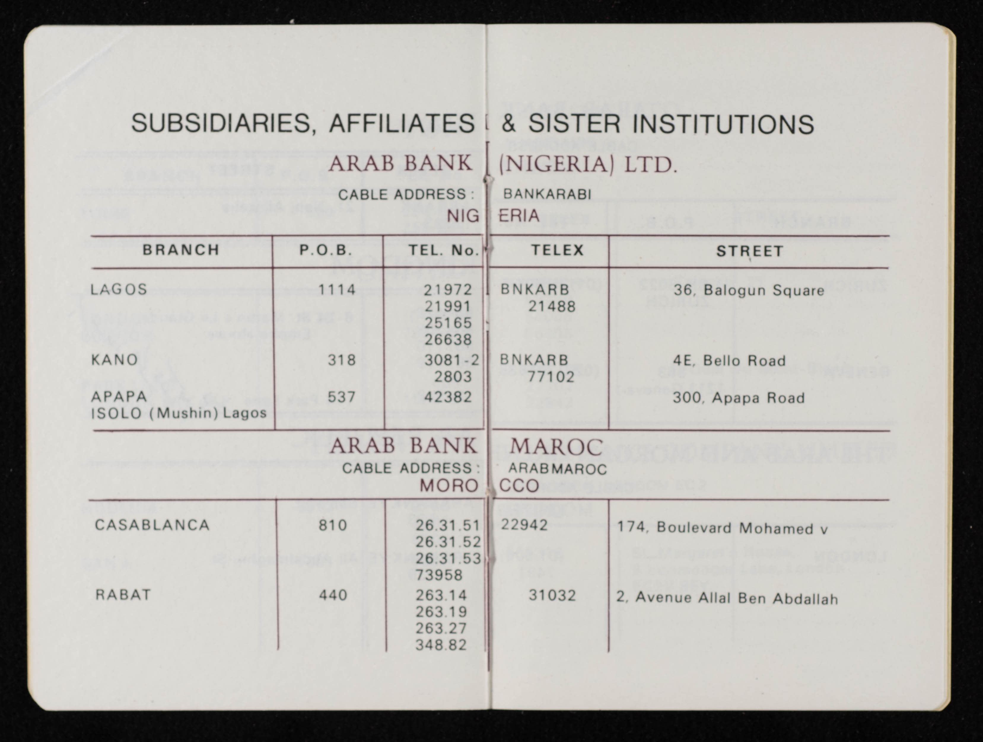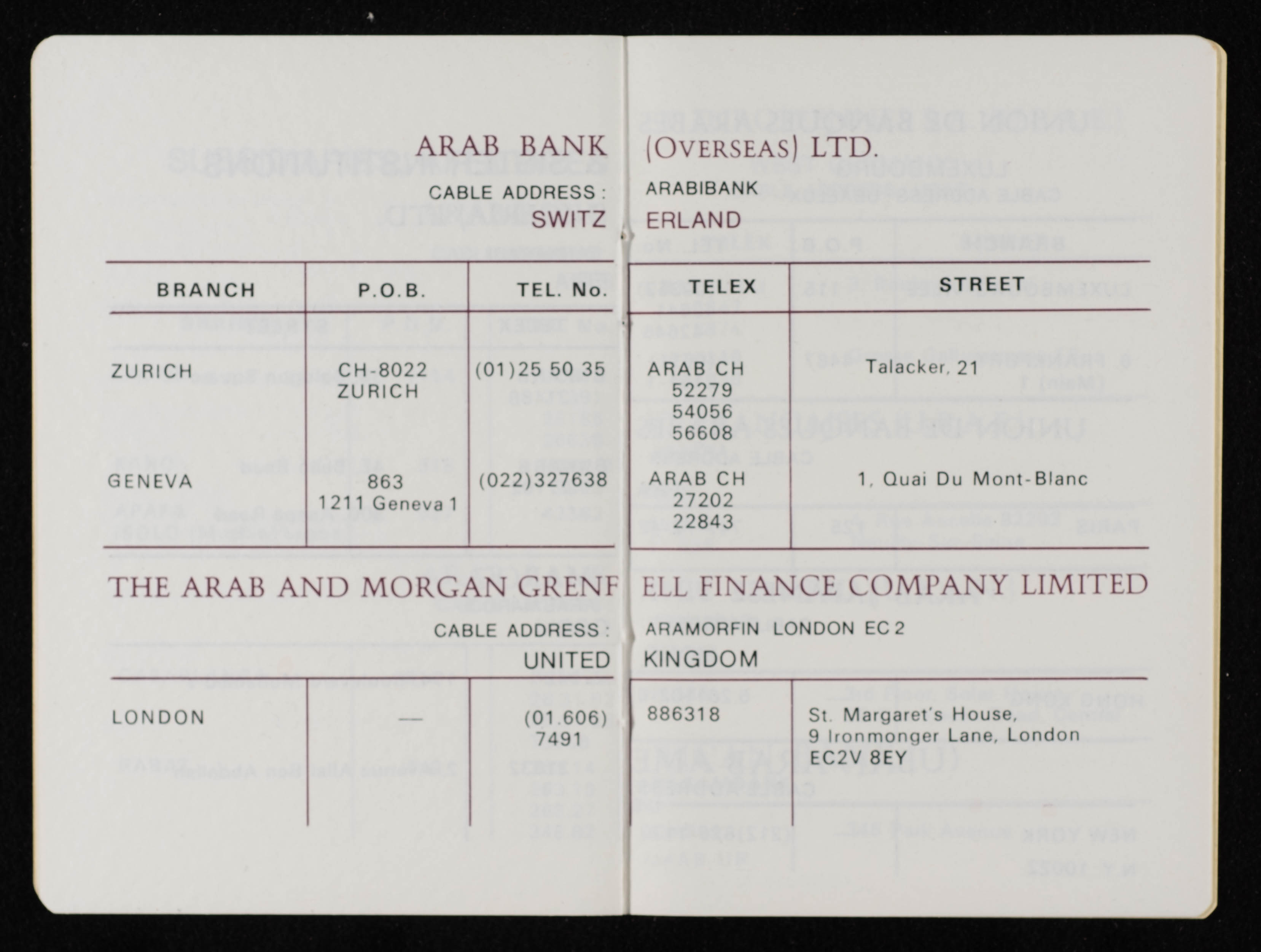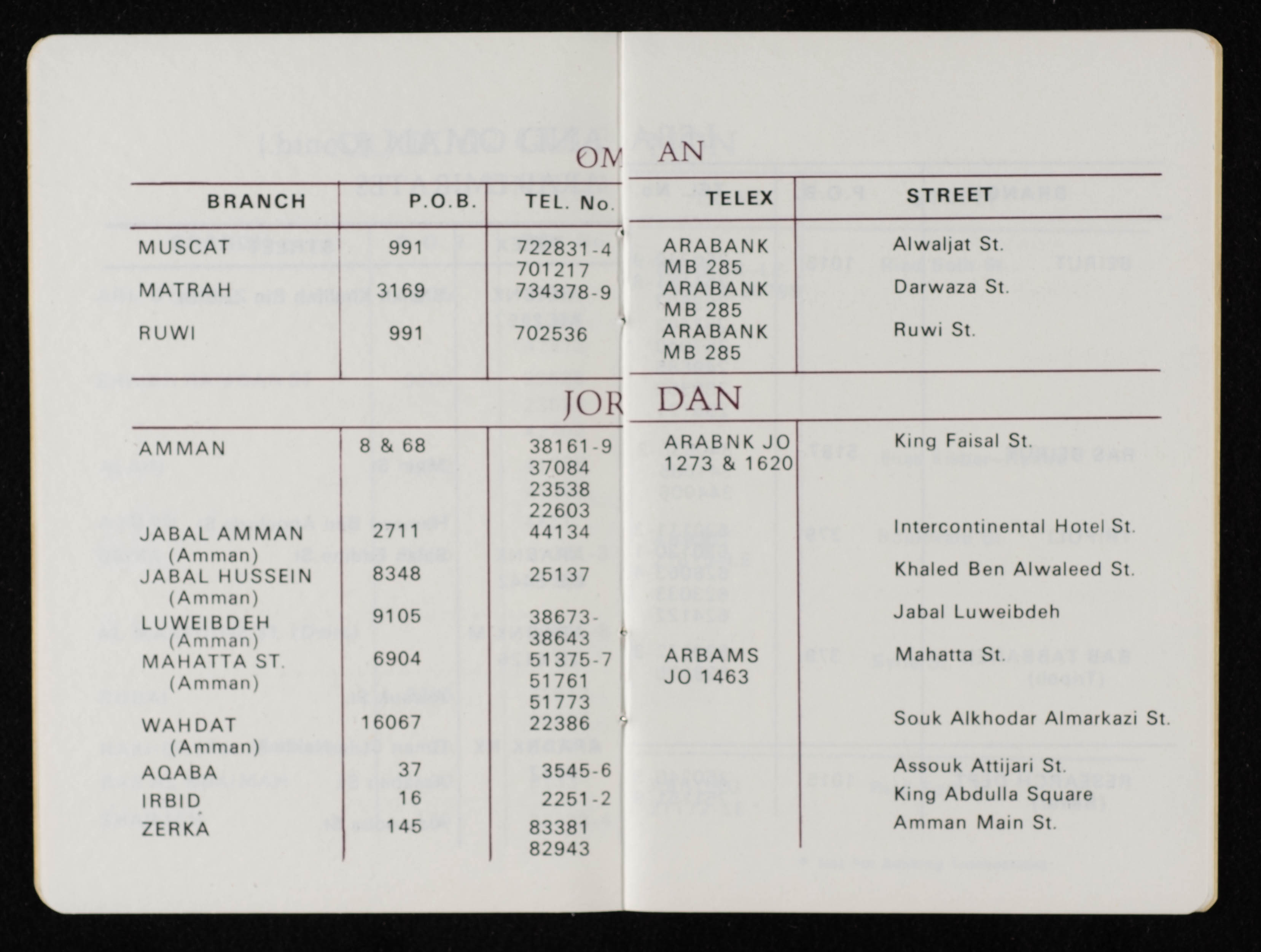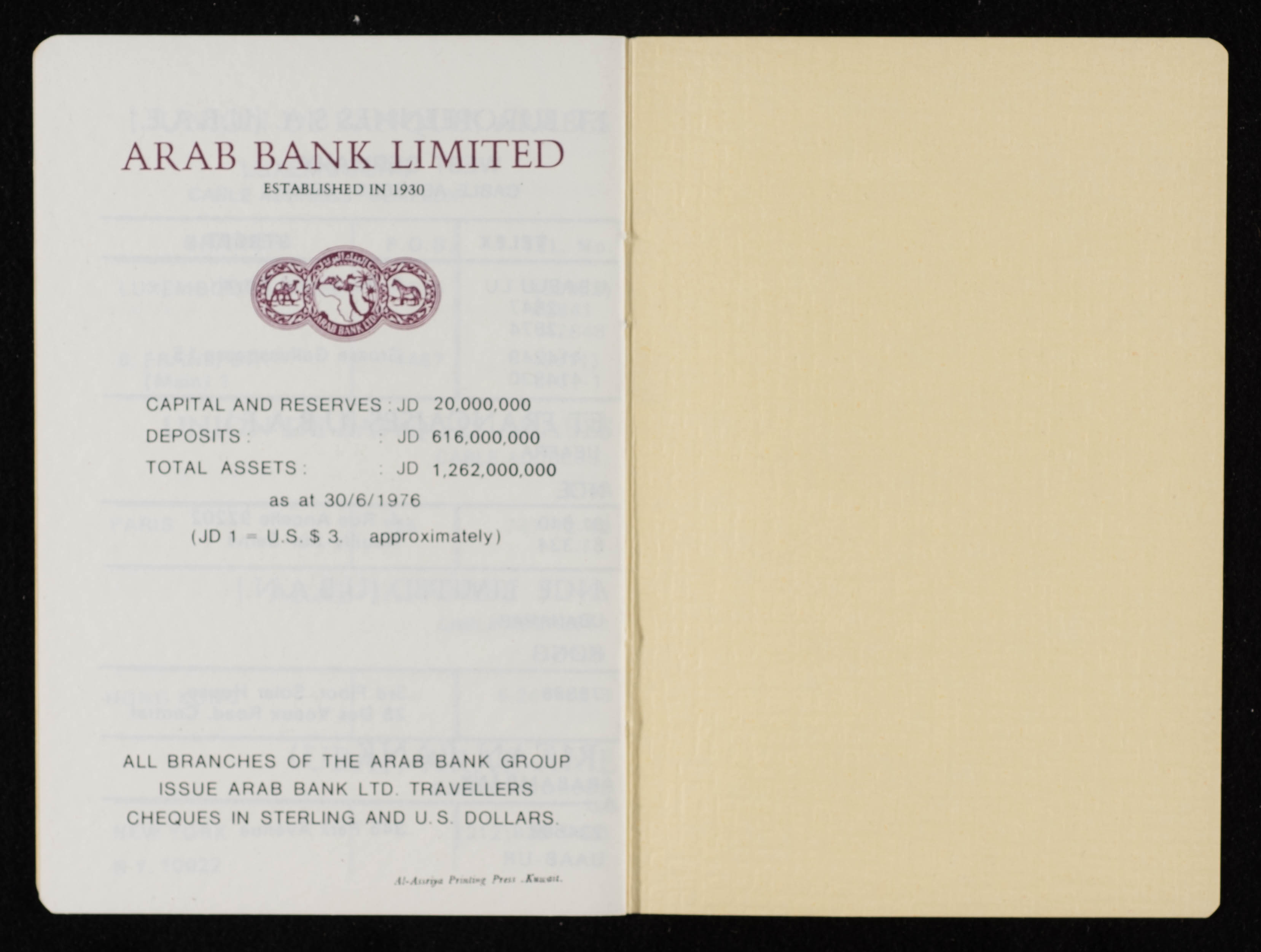 .وثيقة مطبوعة باللغة الانجليزية، تتضمن دفتر خاص دون عليه حسابات موسى العلمي من بنك العربي عام 1976. وجدت في مجموعة المشرع الانشائي العربي