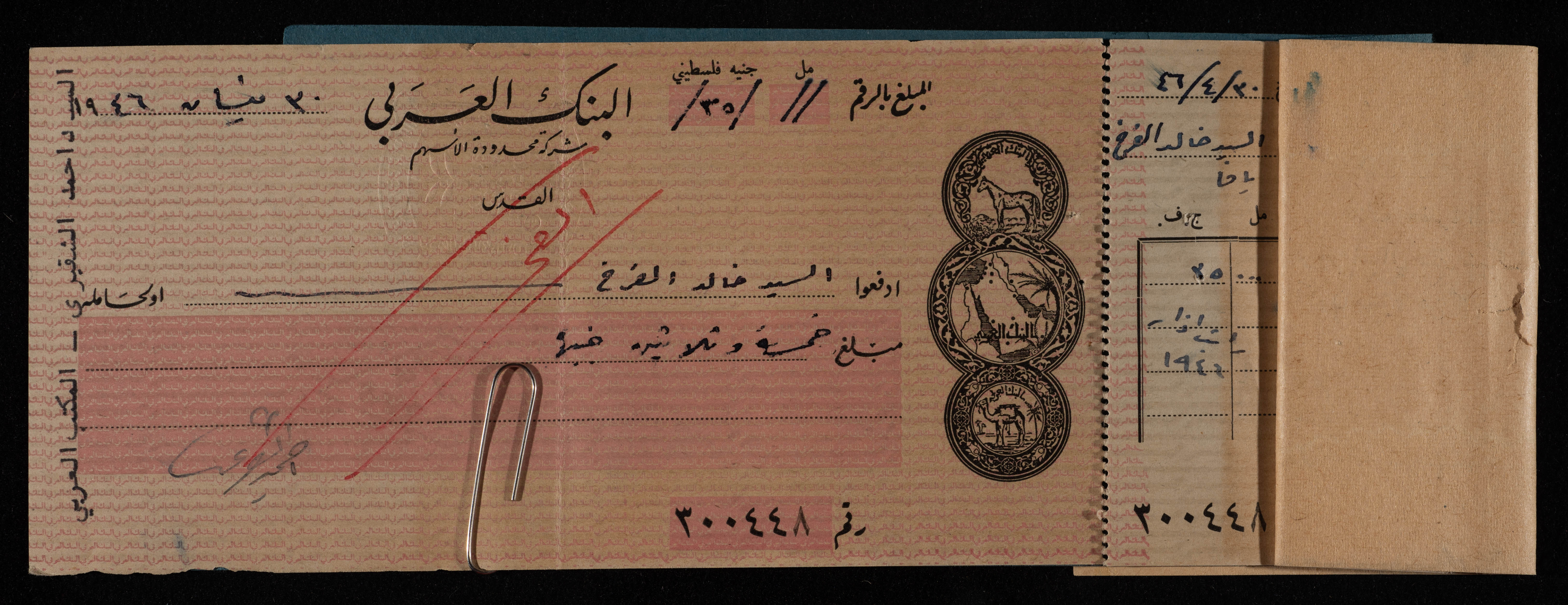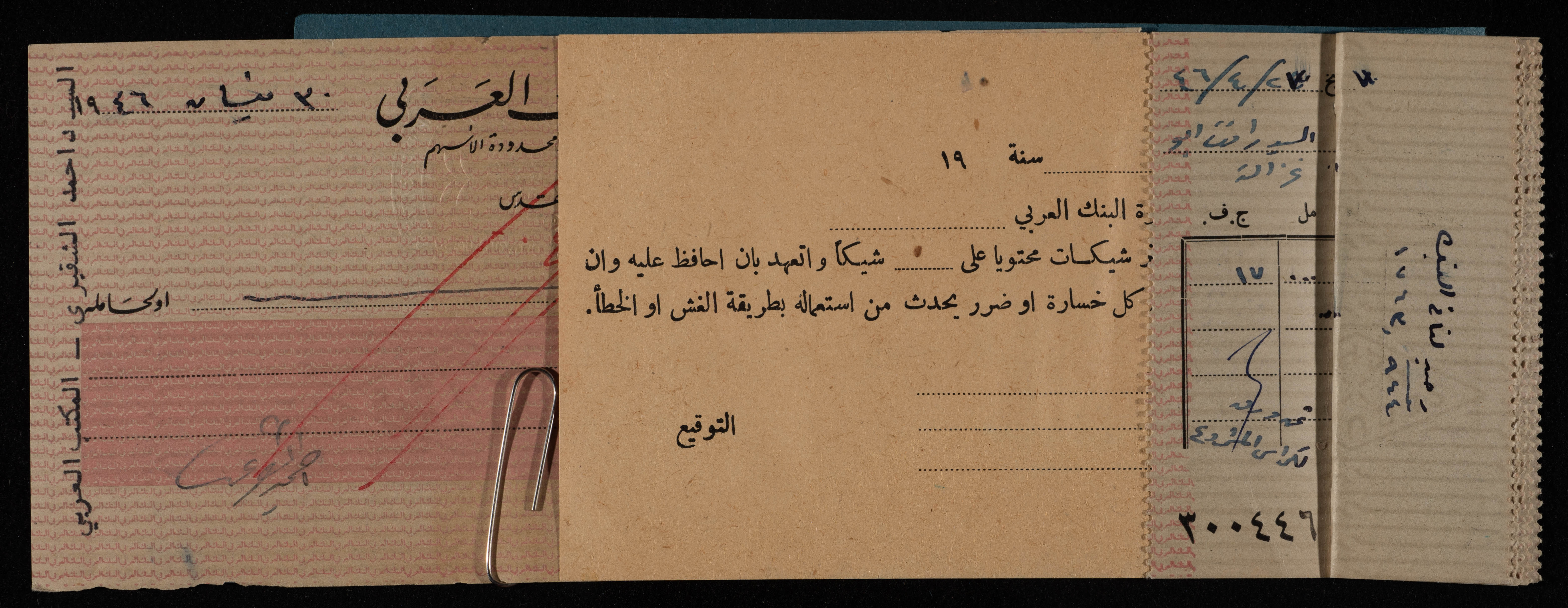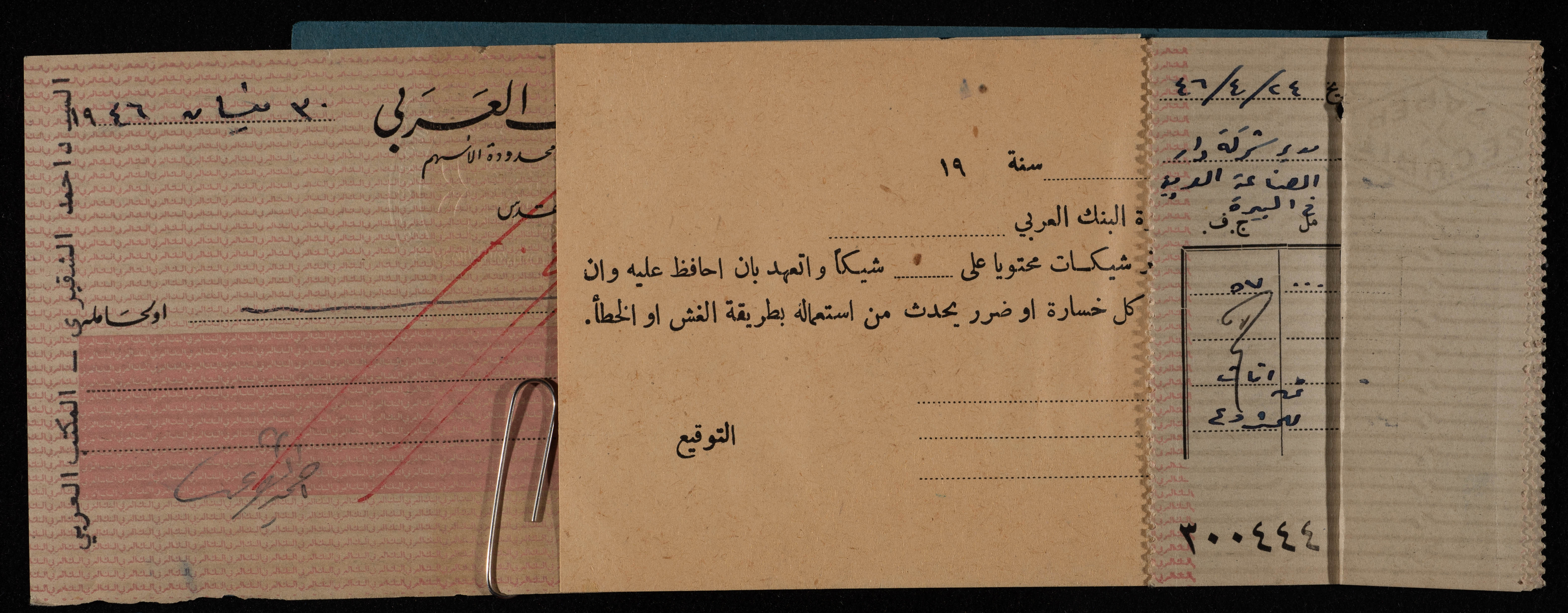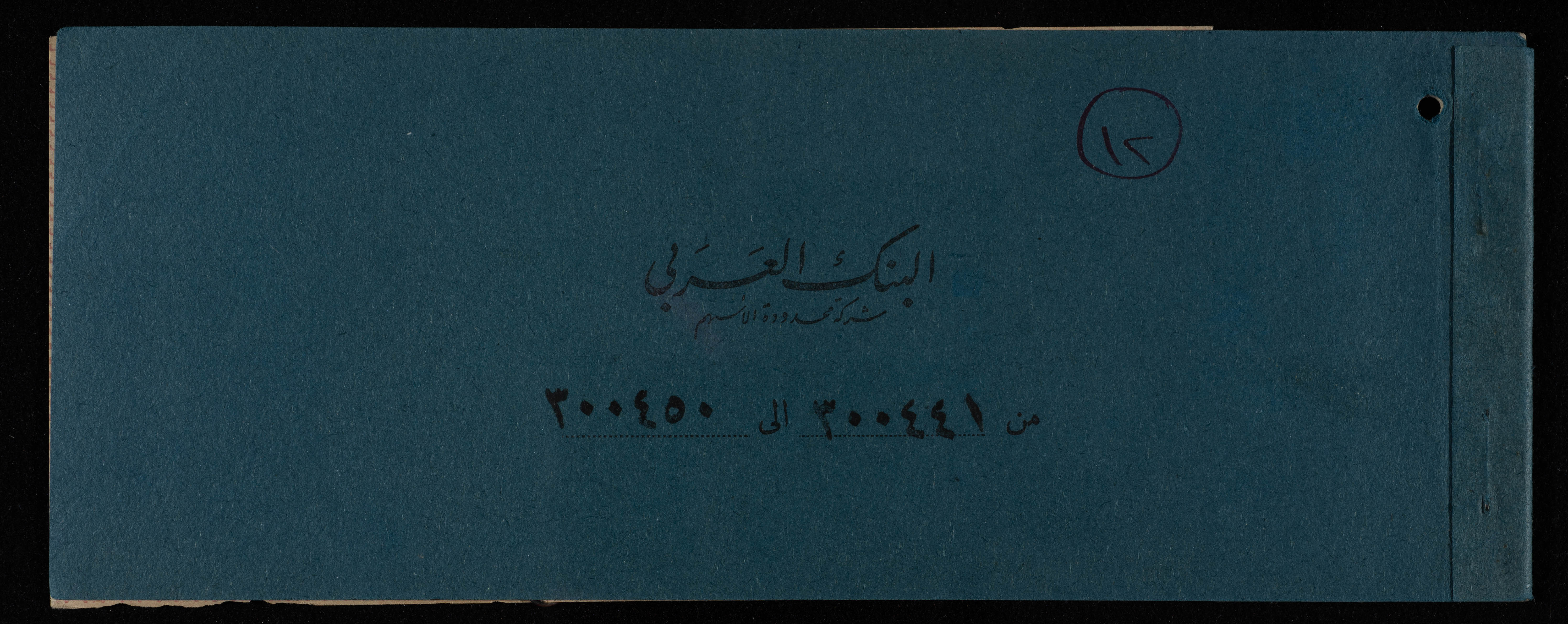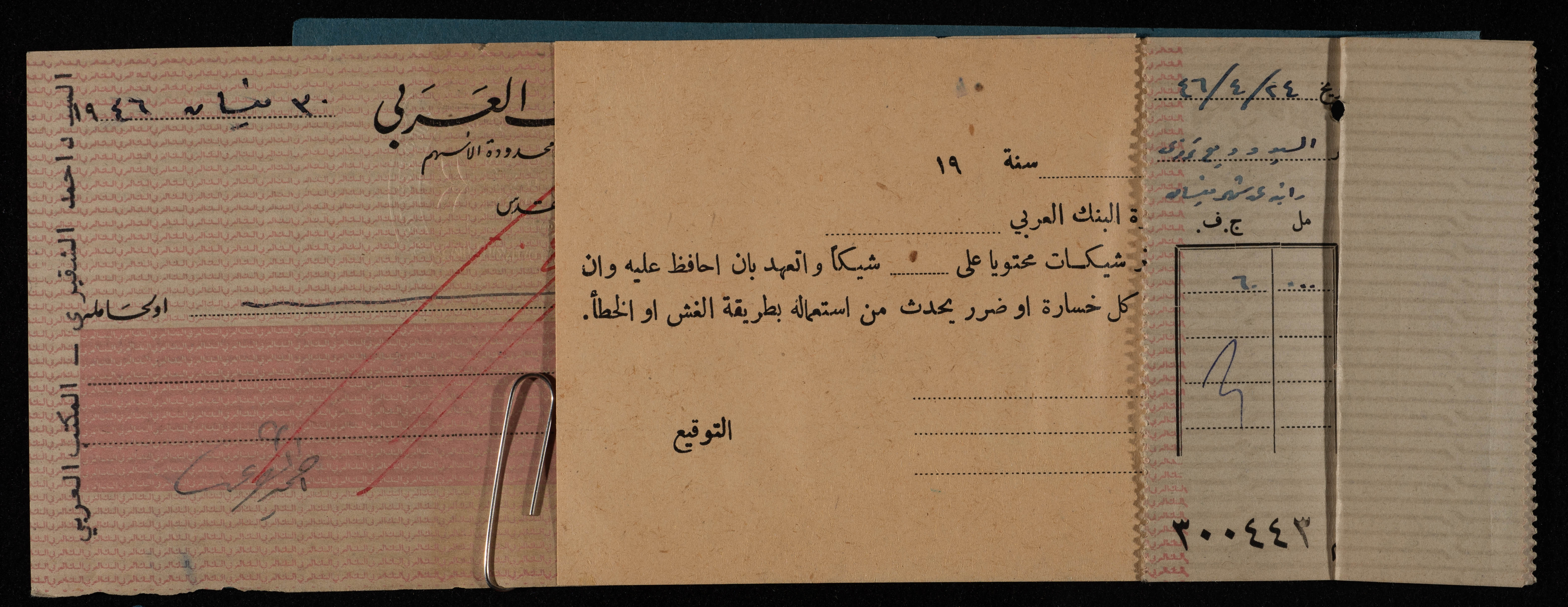 Found in Arab Development Society collection, this is a cheque book issued by the Arab Bank in al-Quds (Jerusalem) to the Arab Office.
