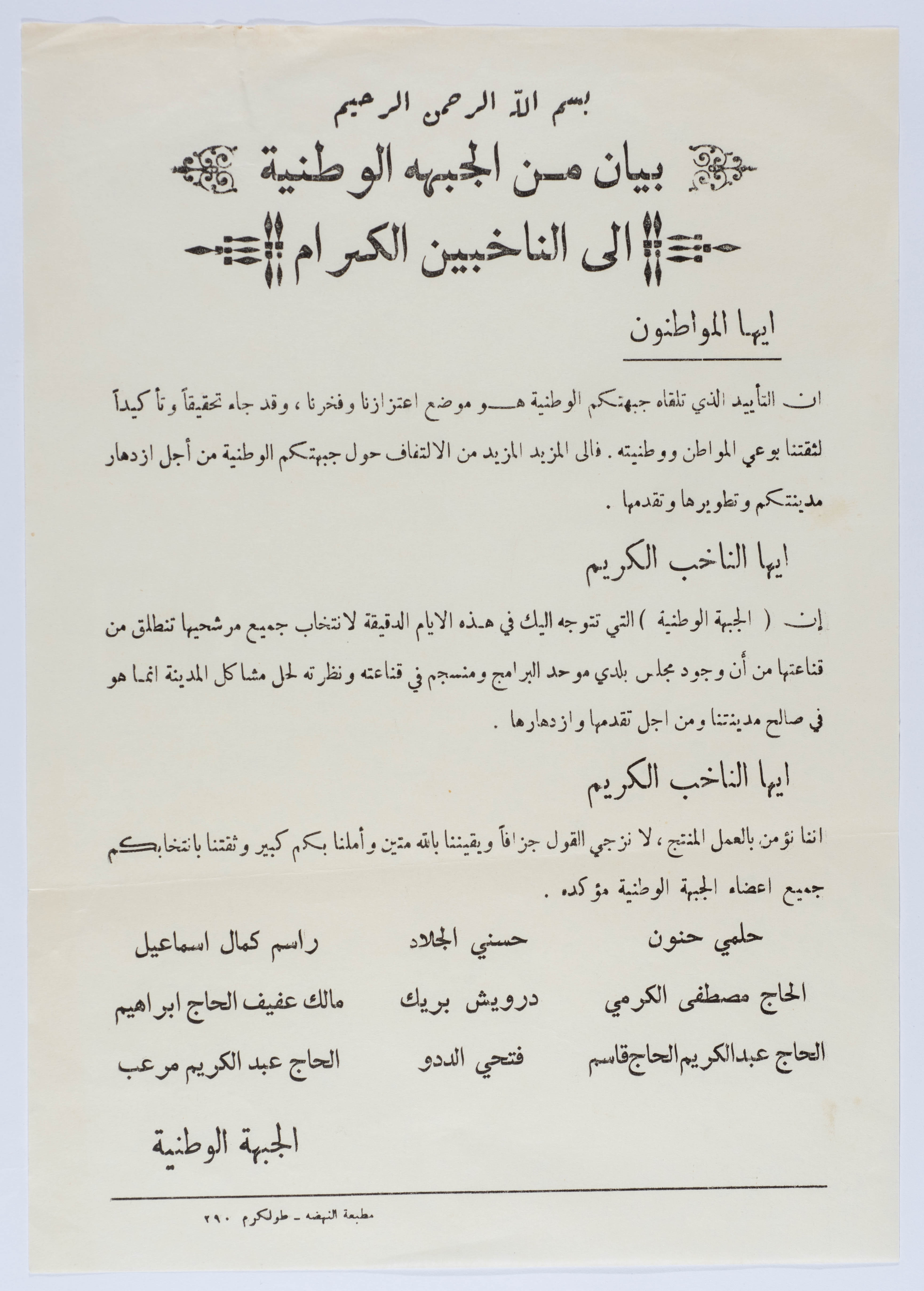 .وثيقة مطبوعة باللغة العربية، تتضمن بيان صادر من الجبهة الوطنية الى المواطنين، طبع في مطبعة النهضة - طولكرم