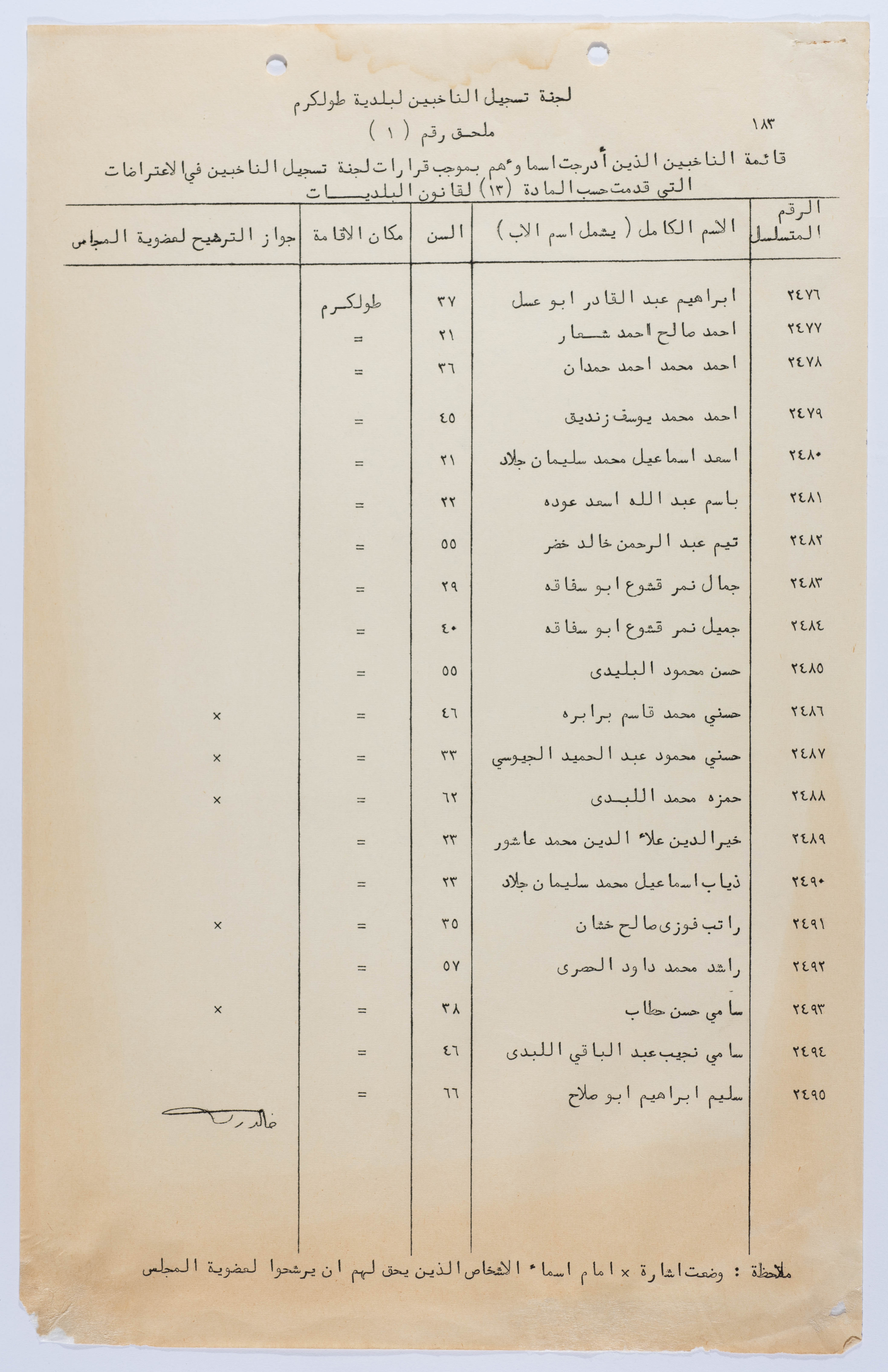 وثيقة مطبوعة باللغة العربية، تتضمن قائمة الناخبين الذين شطبت اسماؤهم من الجدول بموجب قرارات لجنة الناخبين في الاعتراضات التي قدمت حسب المادة 13 لقانون البلديات