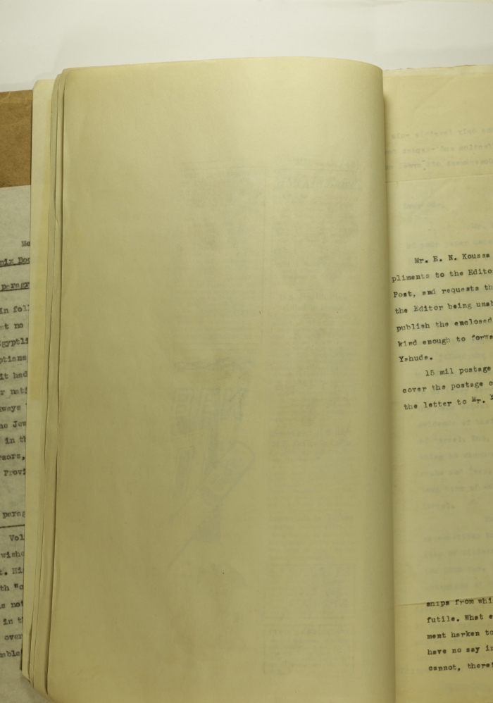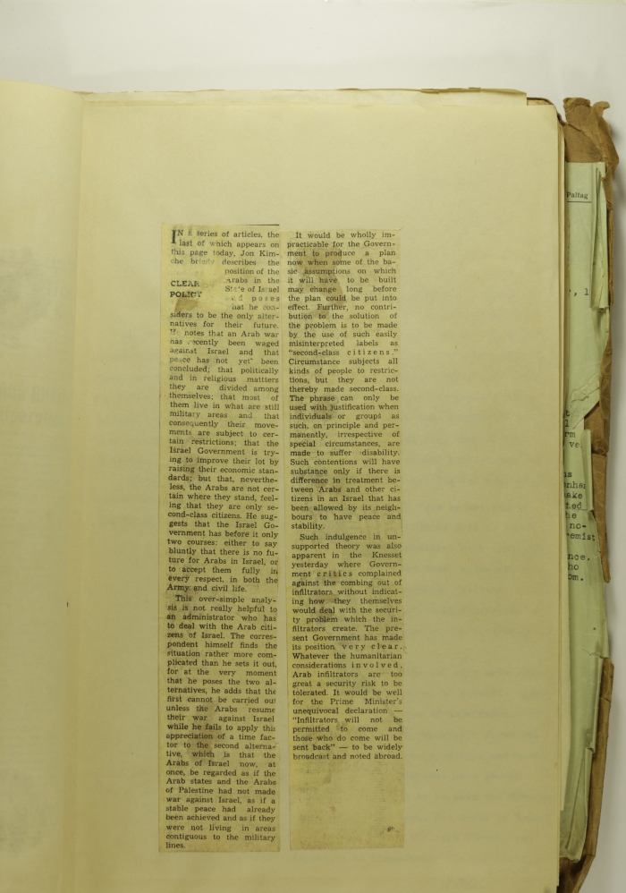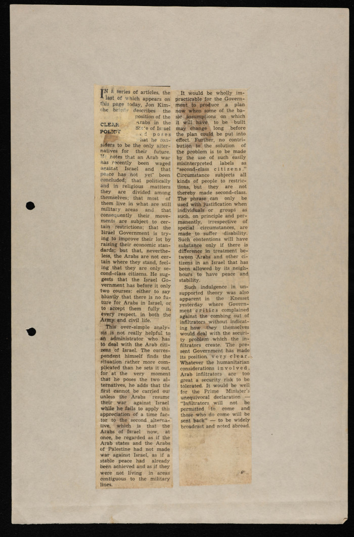 قصاصة من جريدة تتضمن مقال حول وضع العرب في اسرائيل في صحيفة الجيروسالم يوست خلال الخمسينات رداً على سلسلة مقالات نُشرت في الصحيفة حول العرب في اسرائيل للكاتب جون كيمتشي.