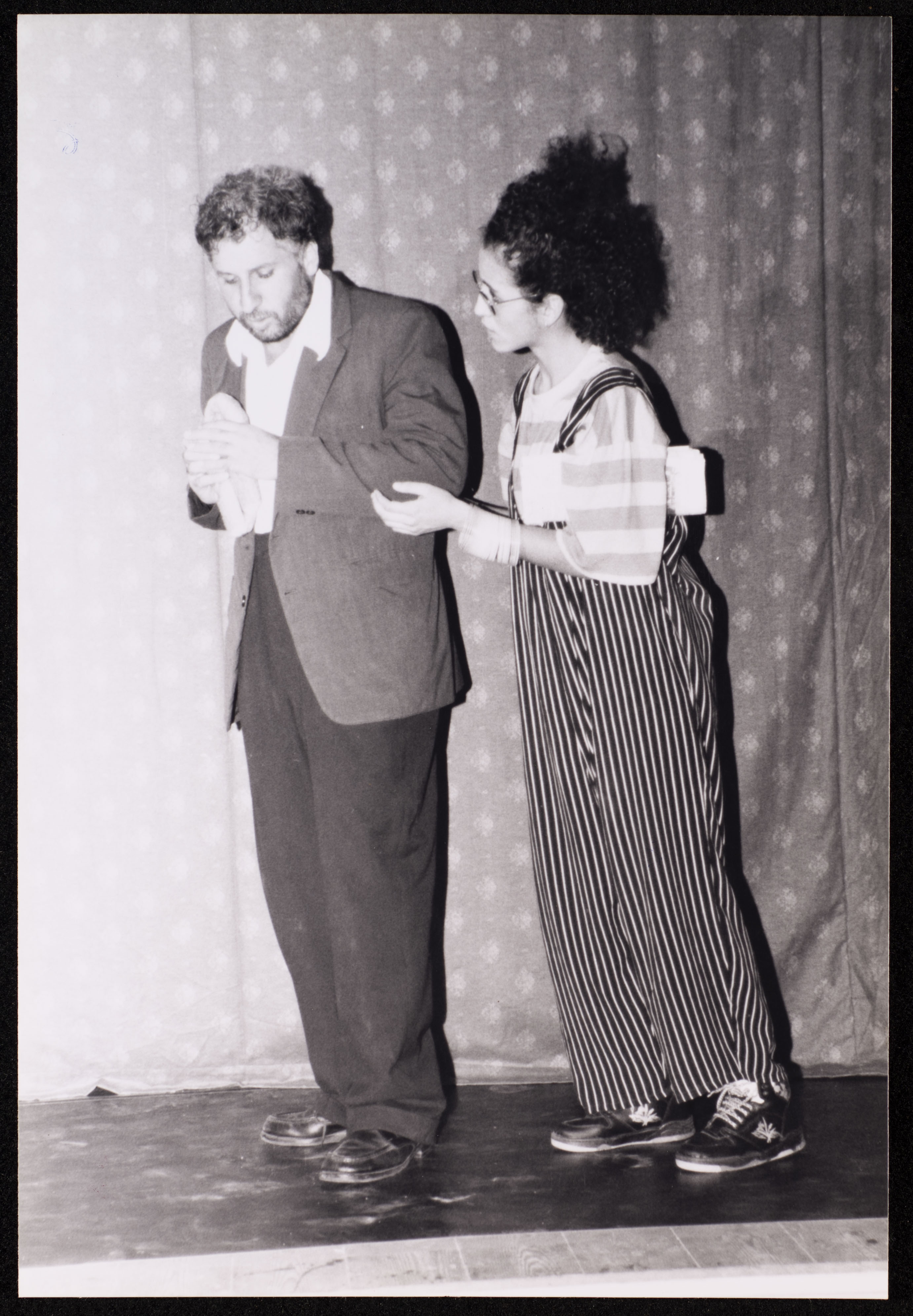 A photograph of Ashtar Theatre Productions and Training's performance, "Kul Ishy Tamam" in 1994. Adapted from a work by Coline Serreau and directed by Peter Braschler, the play ran at the Latin Patriarchate Schools in the Israeli-occupied city of Ramallah.