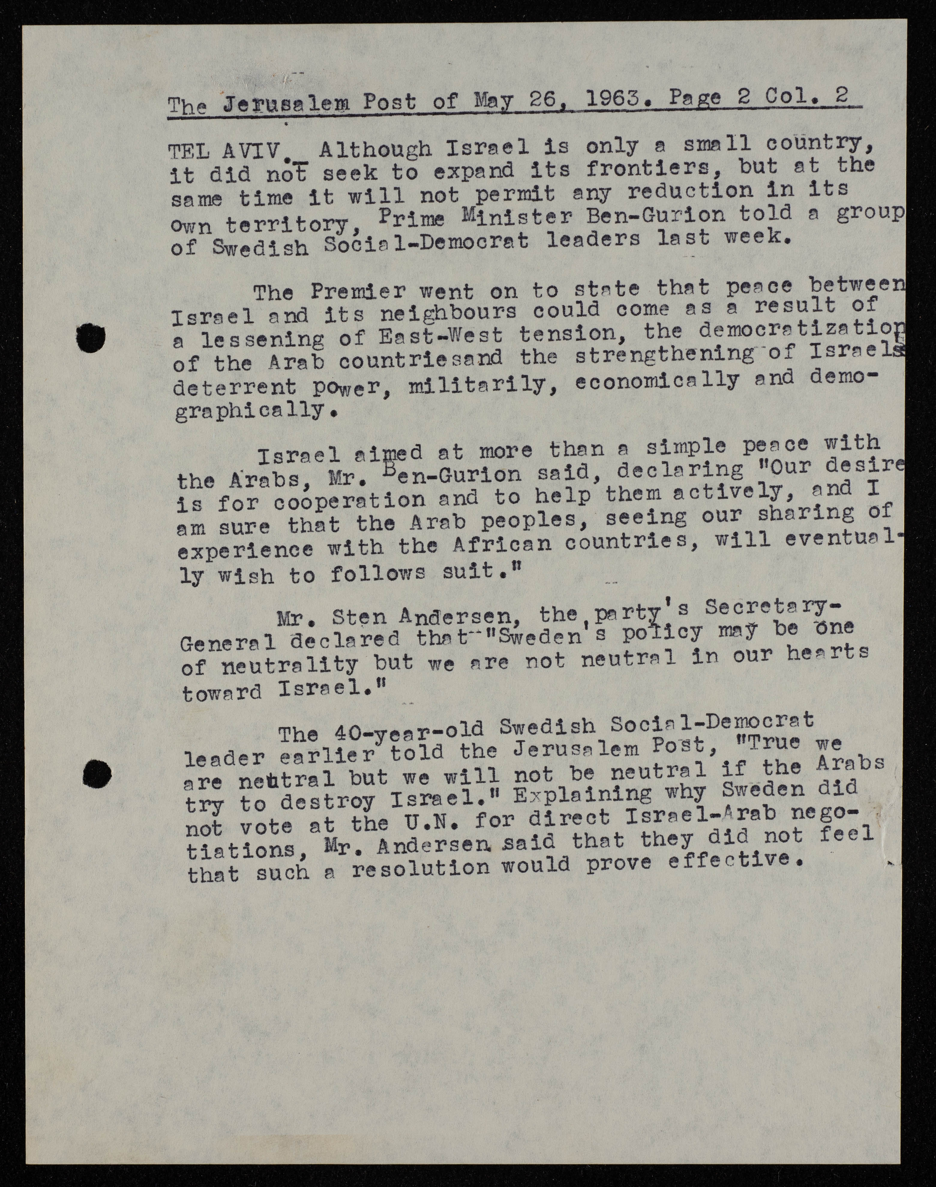 وثيقة مطبوعة باللغة الانجليزية تتضمن مقال من عدد صحيفة جيروسالم بوست الصادر في 26 أيار 1963، يتناول المقال خطاب بن غوريون أمام مجموعة من القادة الاشتراكيين الديمقراطيين حول موقف اسرائيل من السلام مع الدول العربية، والذي يتطلب برأيه زياة قوة اسرائيل ودمقرطة الدول العربية. وموقف السويد غير الحيادي من السلام بين الدول العربية واسرائيل.