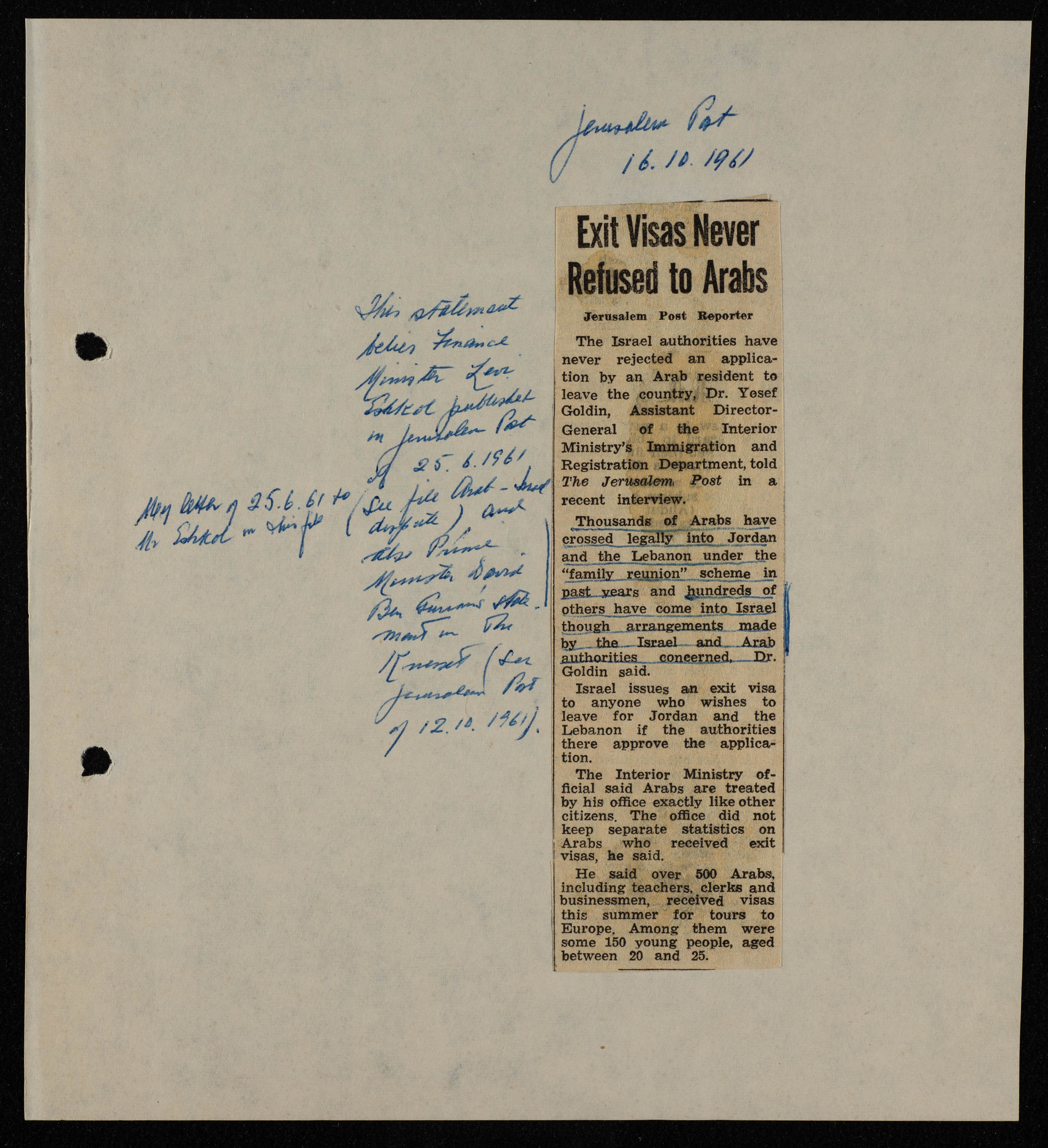 "Exis Visas Never Refused to Arabs", a Newspaper Clipping from the Jerusalem Post, October 1961
