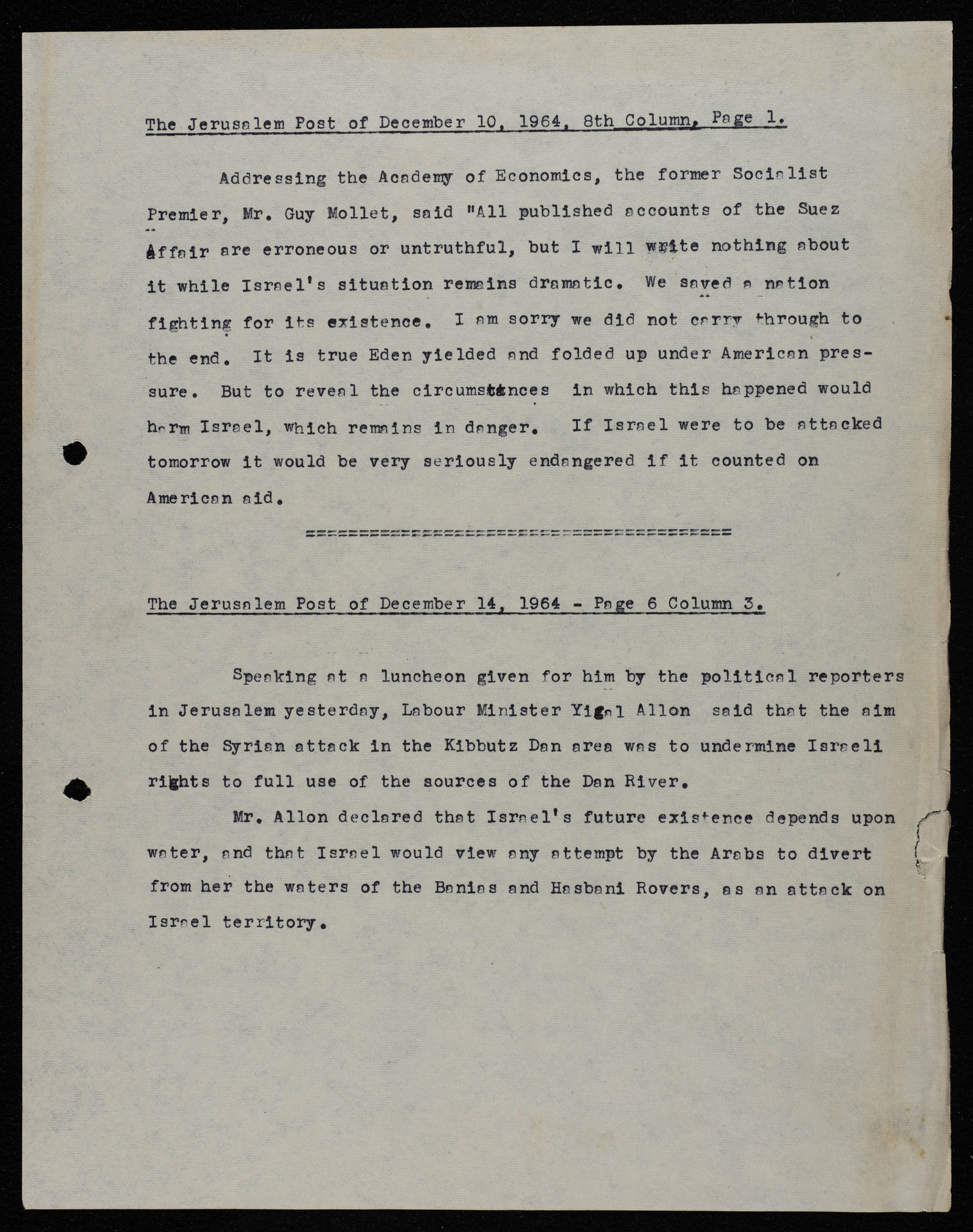 Published in December 1064, this document contains two articles from the Jerusalem Post, the first of which addresses the American aid Israel received in its attack on the Suez Canal, and the second discusses the Israeli attack on the Dan River area in Jordan as its future is dependant on water supplies.