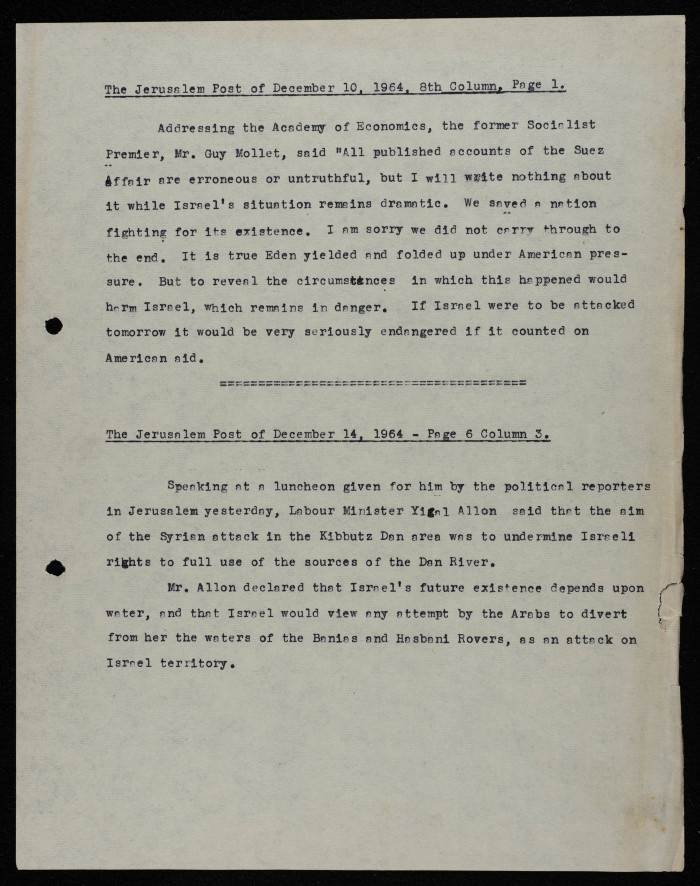 "U.S. Support of Israel", "Israel's Attack on the Dan River", News Articles from the Jerusalem Post, December 1964