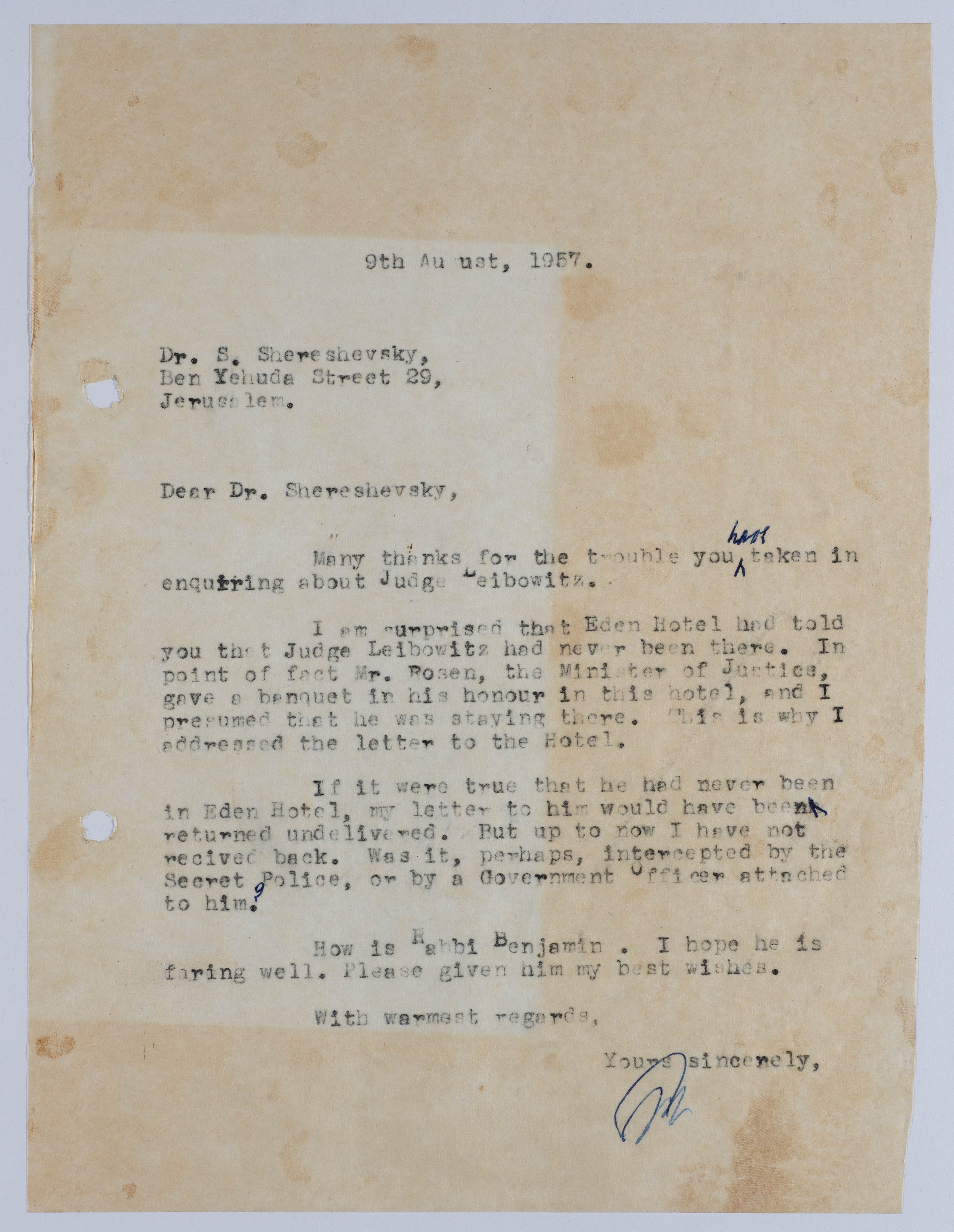 رسالة مطبوعة باللغة الانجليزية من إلياس كوسا إلى سيمون شيريفسكي بتاريخ 9 آب 1957 بخصوص رسالته إلى القاضي ليبويتز.