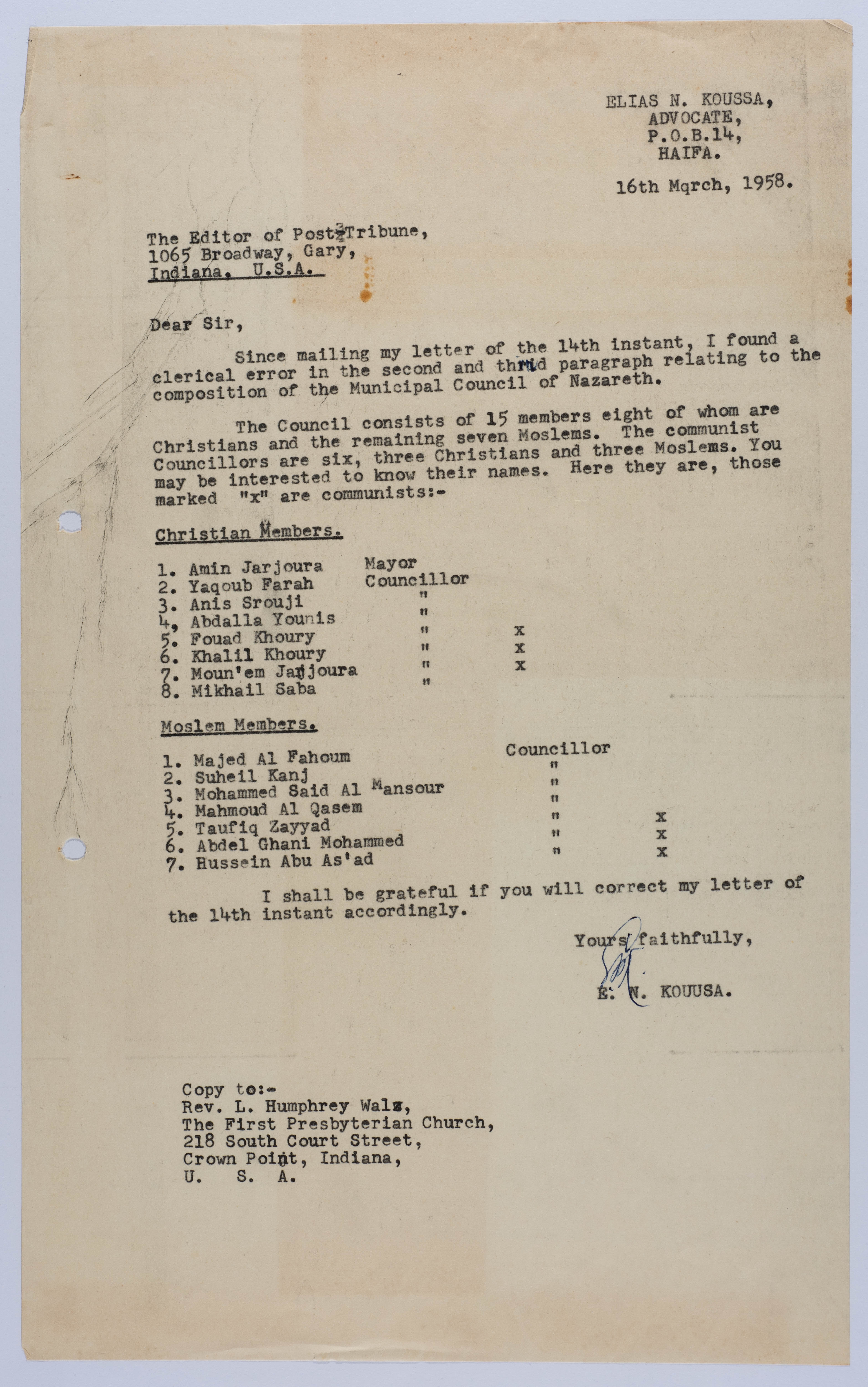 رسالة مطبوعة باللغة الانجليزية من إلياس كوسا إلى محرر صحيفة بوست تريبيون بتاريخ 16 آذار من سنة 1958، تتضمن معلومات حول بلدية الناصرة وعدد أعضاءها، وعدد الأعضاء الشيوعيين في البلدية.