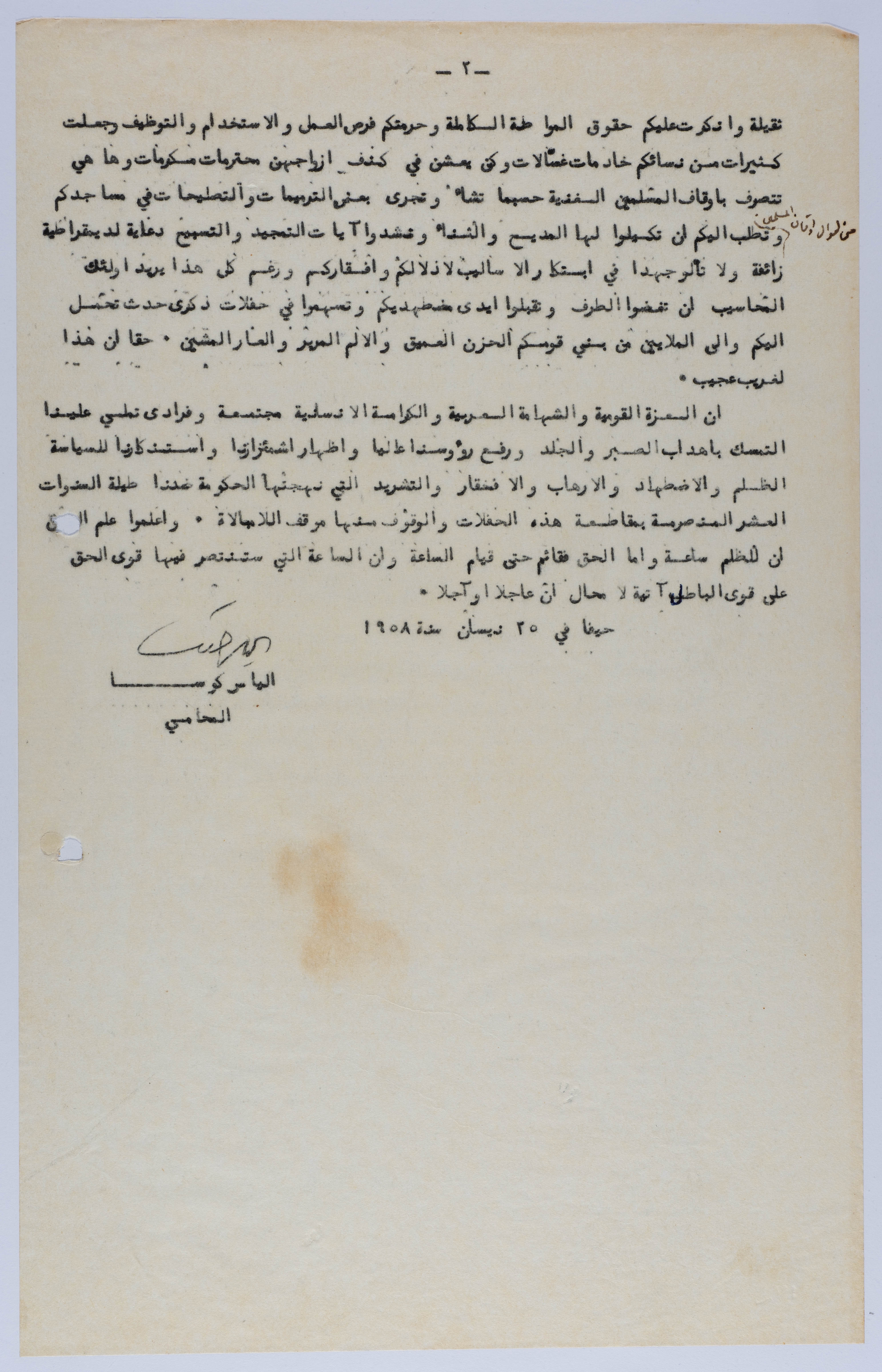 وثيقة مطبوعة باللغة العربية تتضمن بيان موقع من إلياس كوسا إلى المواطنين العرب في اسرائيل بتاريخ 25 نيسان 1958، بخصوص بيان "أبناء الجليل" أو ما كانت تُعرف "اللجنة المسيحية لأجل الاندماج الكامل في اسرائيل" بخصوص رسالته إلى مجلس بلدي كفر ياسيف للثناء عليهم للإعتذار عن المشاركة في احتفالات "إقامة اسرائيل".