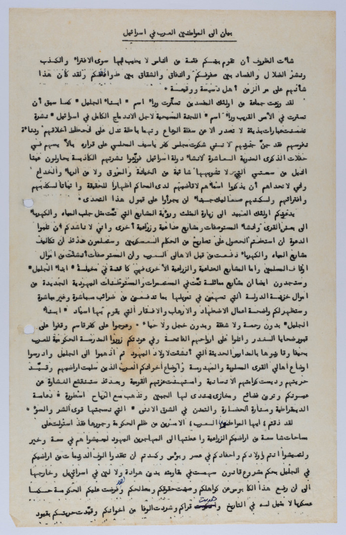 "بيان إلى المواطنين العرب في اسرائيل"، وثيقة من مجموعة إلياس كوسا، نيسان 1958