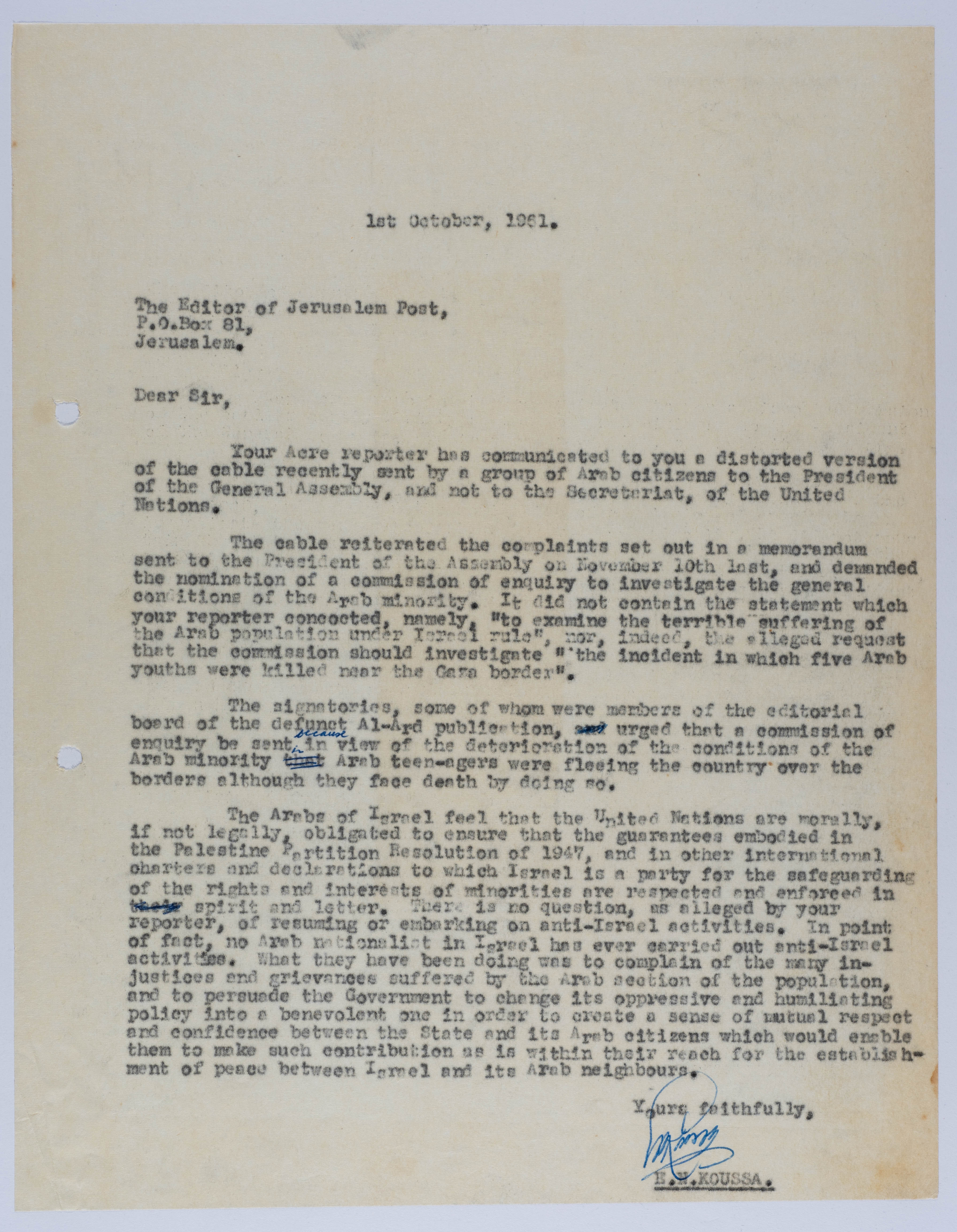 رسالة من إلياس كوسا إلى محرر صحيفة جيروسالم بوست، تشرين أول 1961