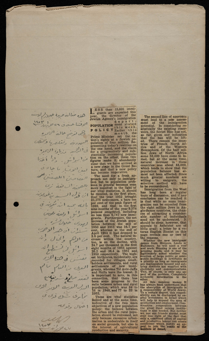 قصاصة من صحيفة جيروسالم بوست تتضمن مقال منشور بتاريخ 26 حزيران 1953 حول الهجرة اليهودية إلى فلسطينوتقلصها وزيادة العجرة العكسية، وتصريح بن غوريون بأن عدد المهاجرين اليهود سيصل خلال عشر سنوات إلى 4 مليون يهودي في فلسطين.
