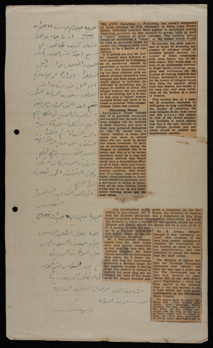 قصاصات من صحيفة جيروسالم بوست منشورة بتاريخ 11 و 14 حزيران 1953 حول قضية اللاجئين الفلسطينيين وتعامل اسرائيل معها، وربطها بادعاءات حول أعمال تهدد سلامة اسرائيل.
