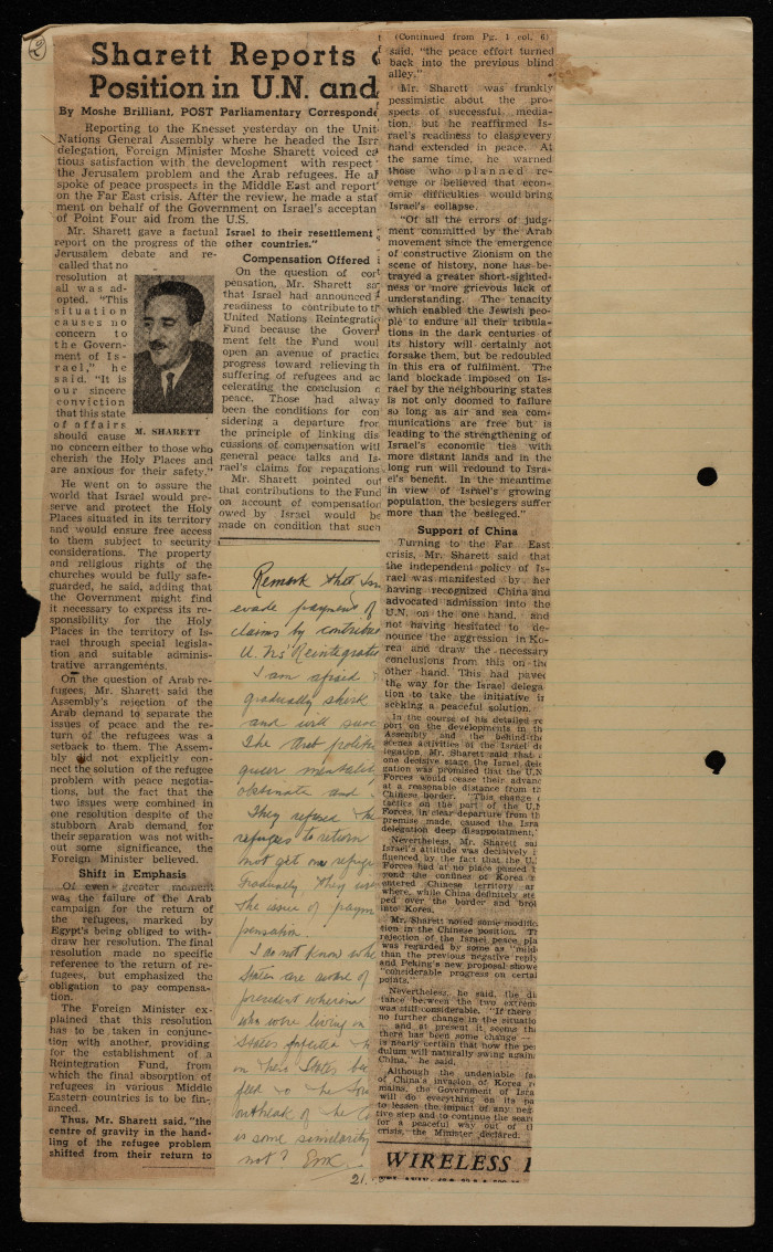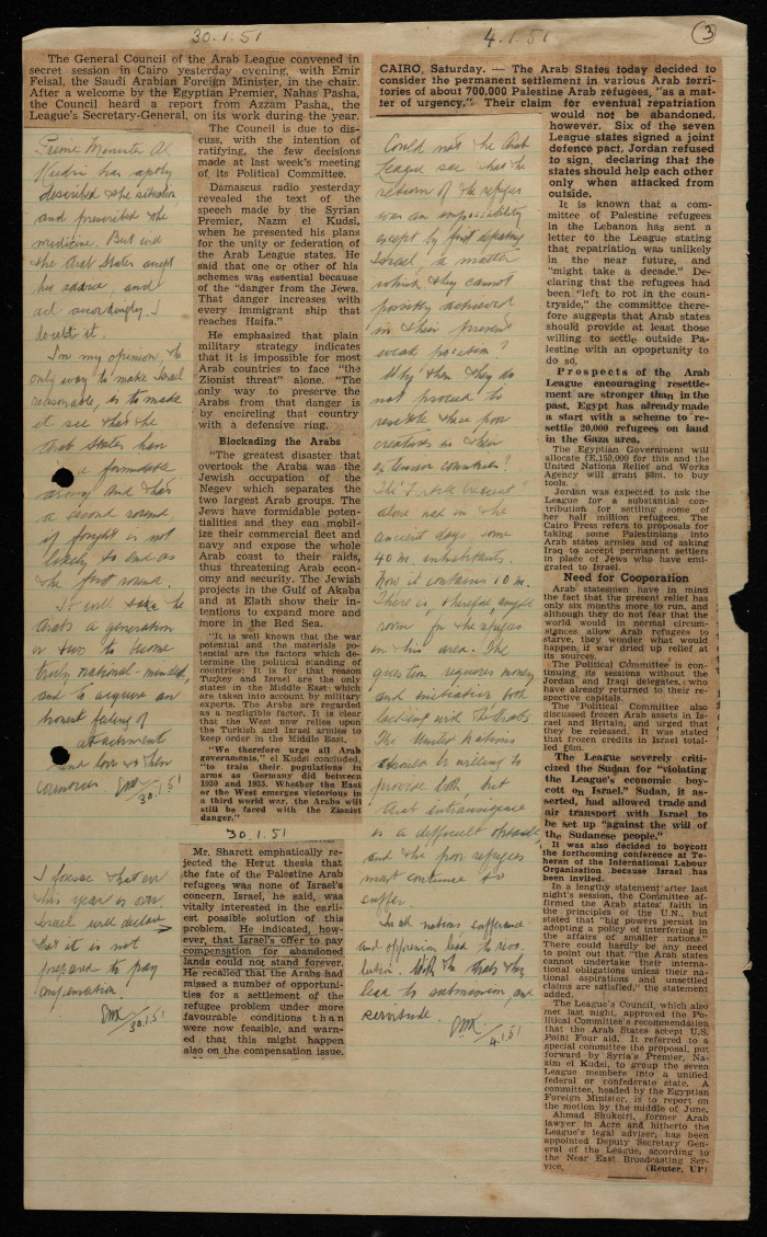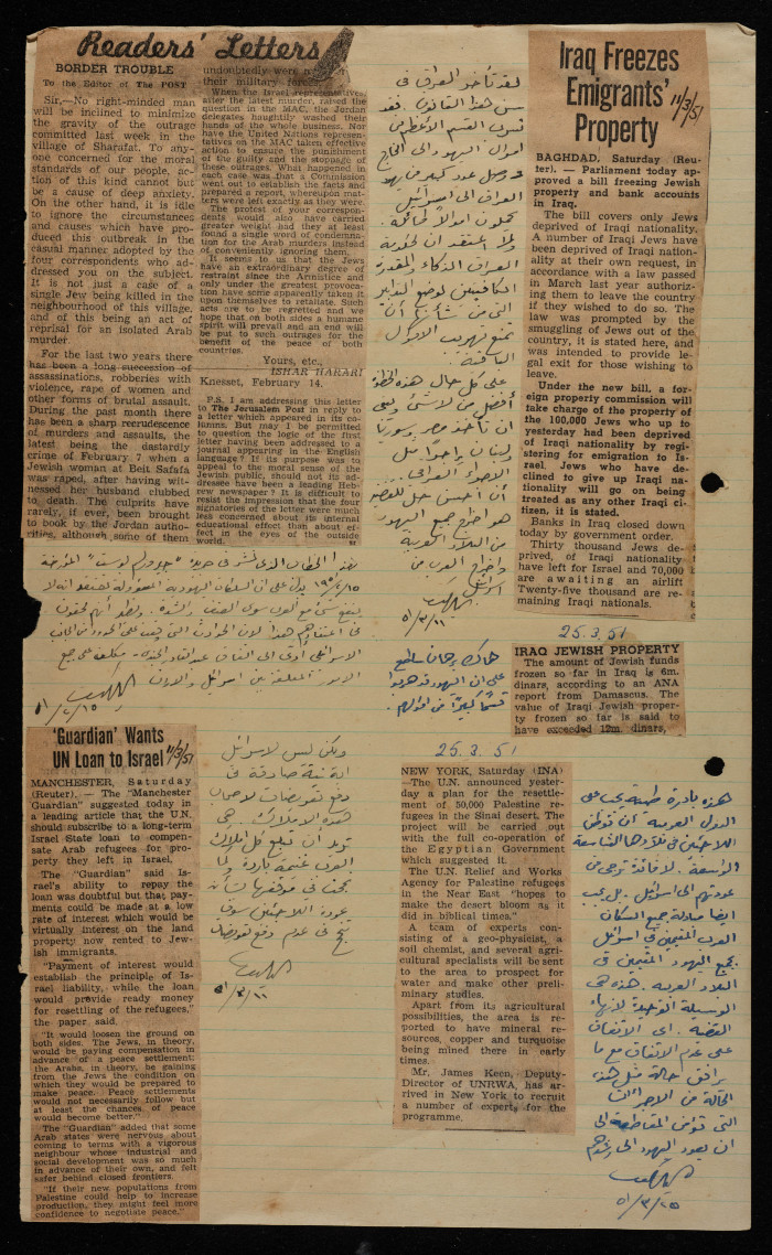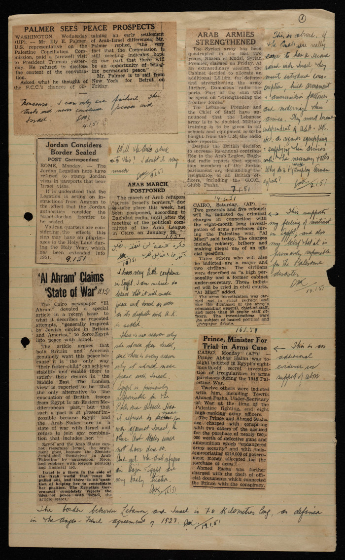 مجموعة من قصاصات الجرائد تتضمن أخبار ومقالات منشورة خلال سنة 1951 حول مجموعة من القضايا:حالة السلم والحرب بين الدول العربية وبالأخص مصر والأردن واسرائيل منذ سنة 1948، يهود العراق وتهريب الأموال والممتلكات من العراق، السياسية الاسرائيلية تجاه الفلسطينيين في الأراضي الفلسطينية المحتلة سنة 1948.