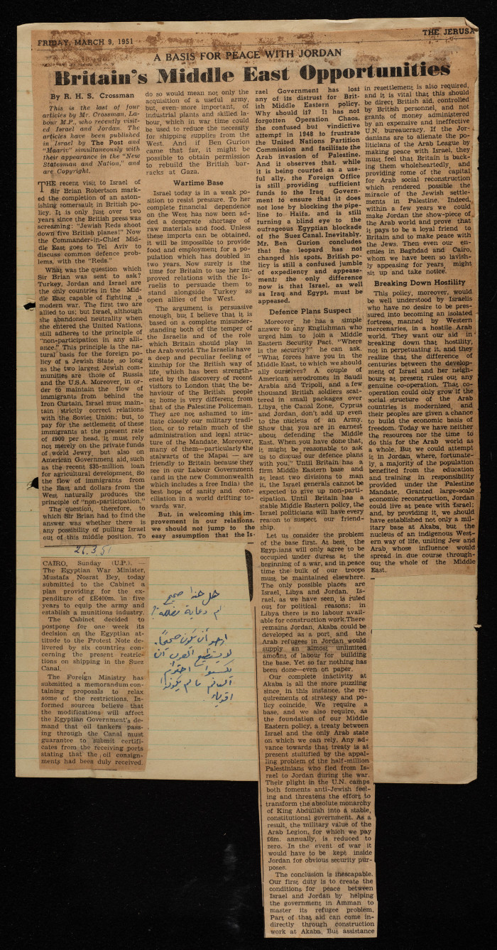 قصاصة من صحيفة جيروسالم بوست تتضمن مقال "فرص بريطانيا للشرق الأوسط" منشورة بتاريخ 9 آذار 1951، يتحدث المقال عن أسس السلام مع الأردن من وجهة نظر بريطانيا بعد زيارة بريان روبرتسون، المبعوث البريطاني إلى الشرق الأوسط في حينها.
