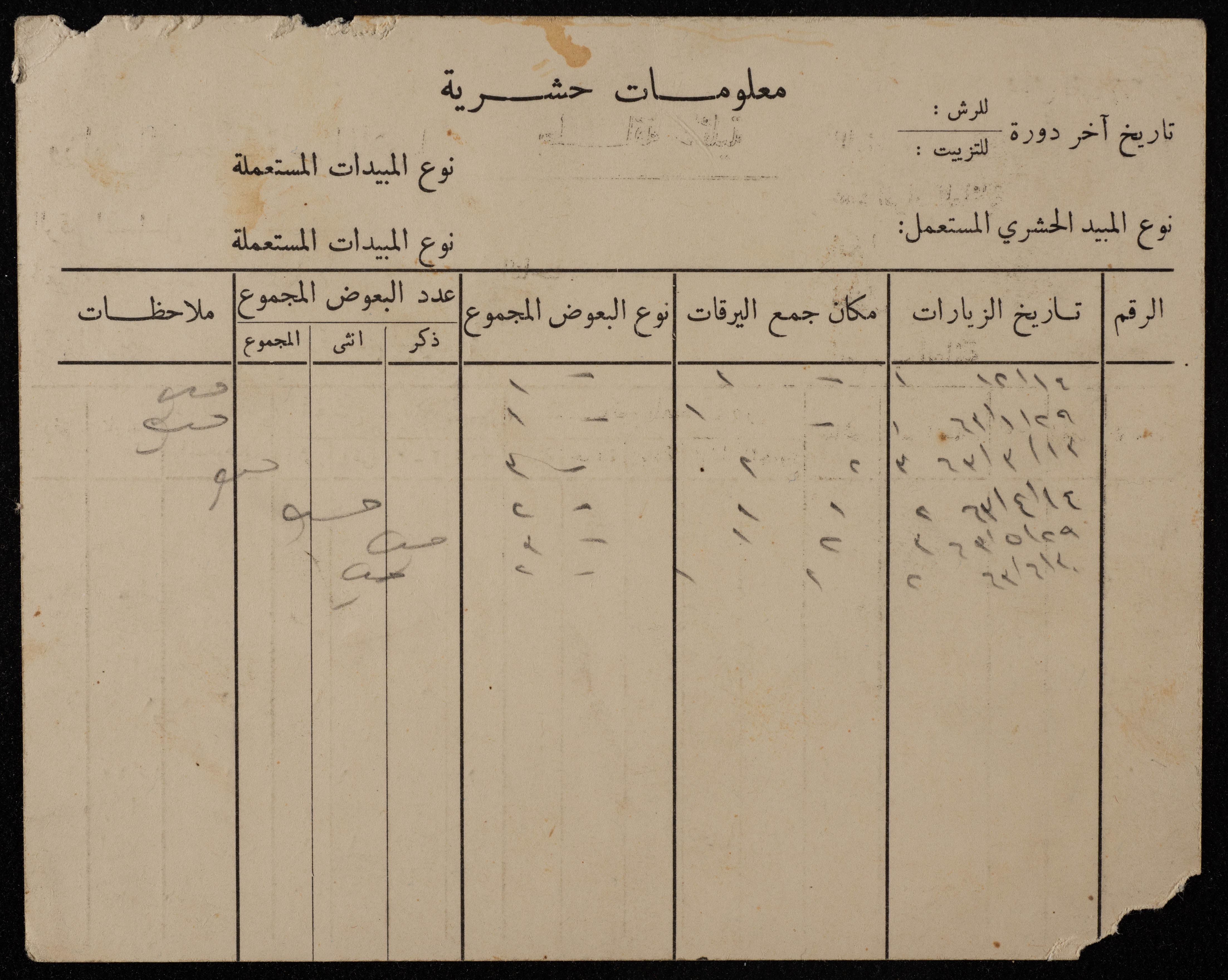 بطاقة عائلية صادرة عن قسم الملاريا في وزارة الصحة عن عائلة راسم سليم الريماوي فيها تسجيل تواريخ فحص أفراد العائلة. ومرفق بها وثيقة المعلومات عن المبيدات الحشرية.