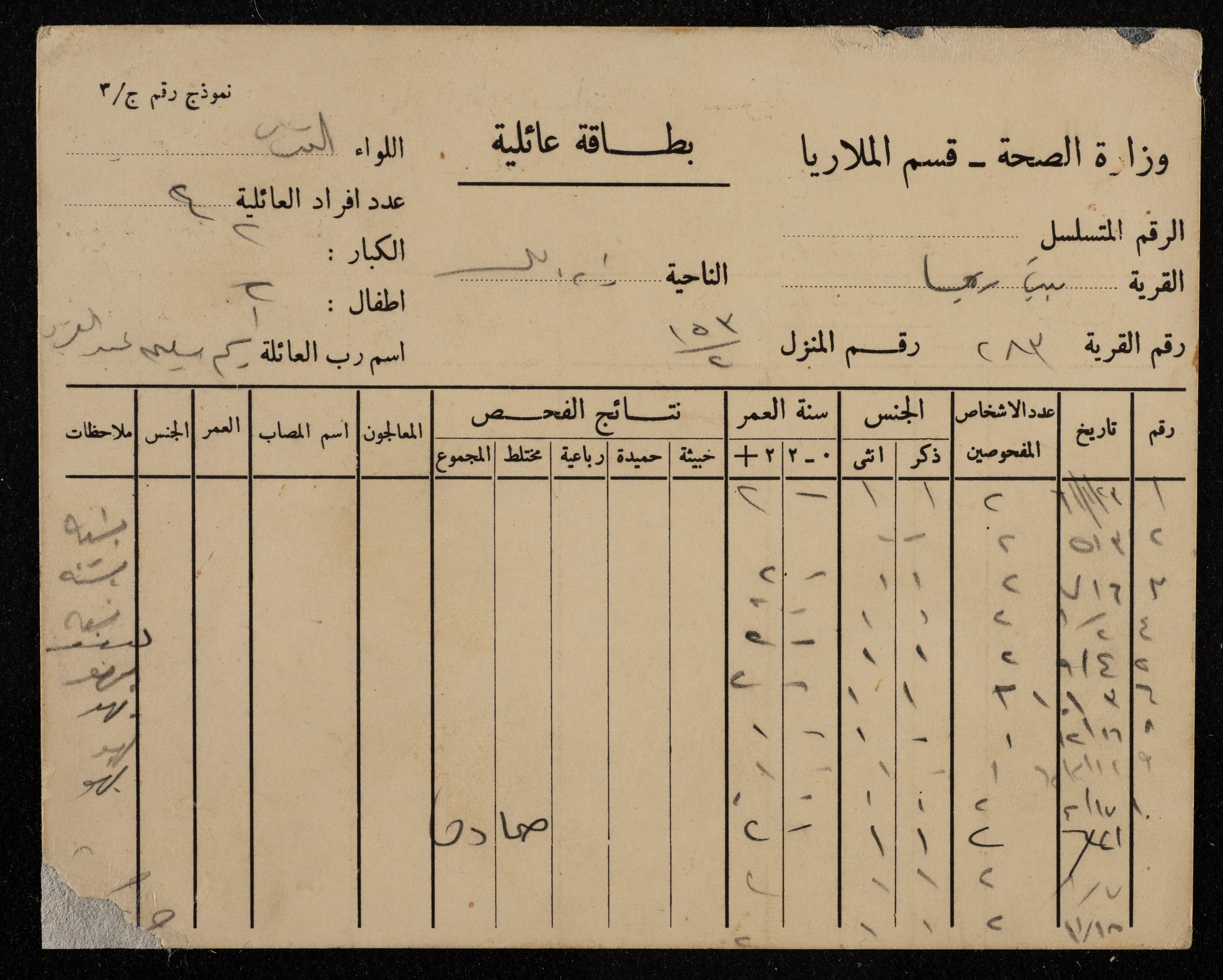 بطاقة عائلية صادرة عن قسم الملاريا في وزارة الصحة عن عائلة راسم سليم الريماوي