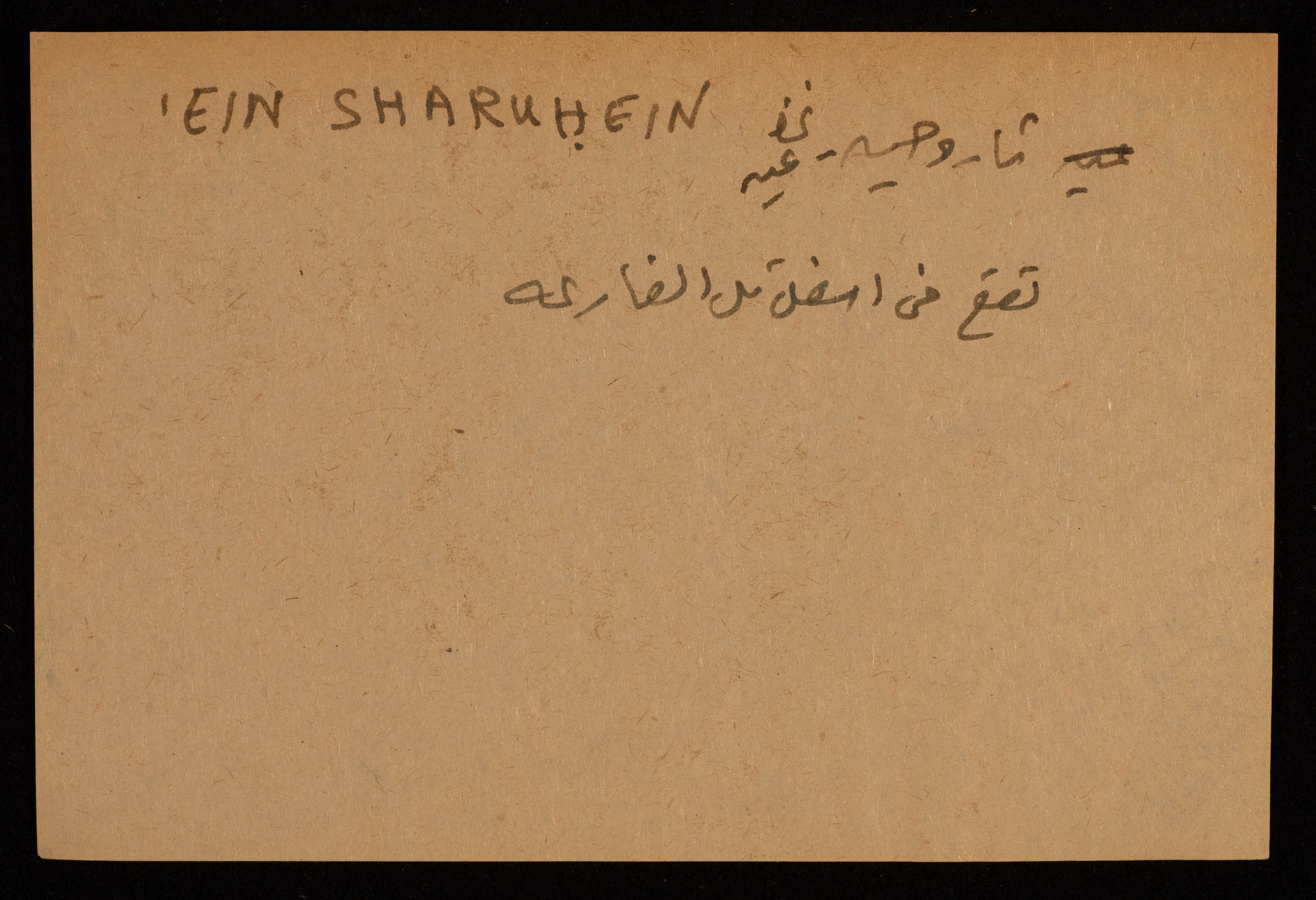 توثق هذه القصاصة، المكتوبة بخط اليد، "عين شاروحين" وهي التسمية العبرية للعين الواقعة أسفل تل الفارعة.