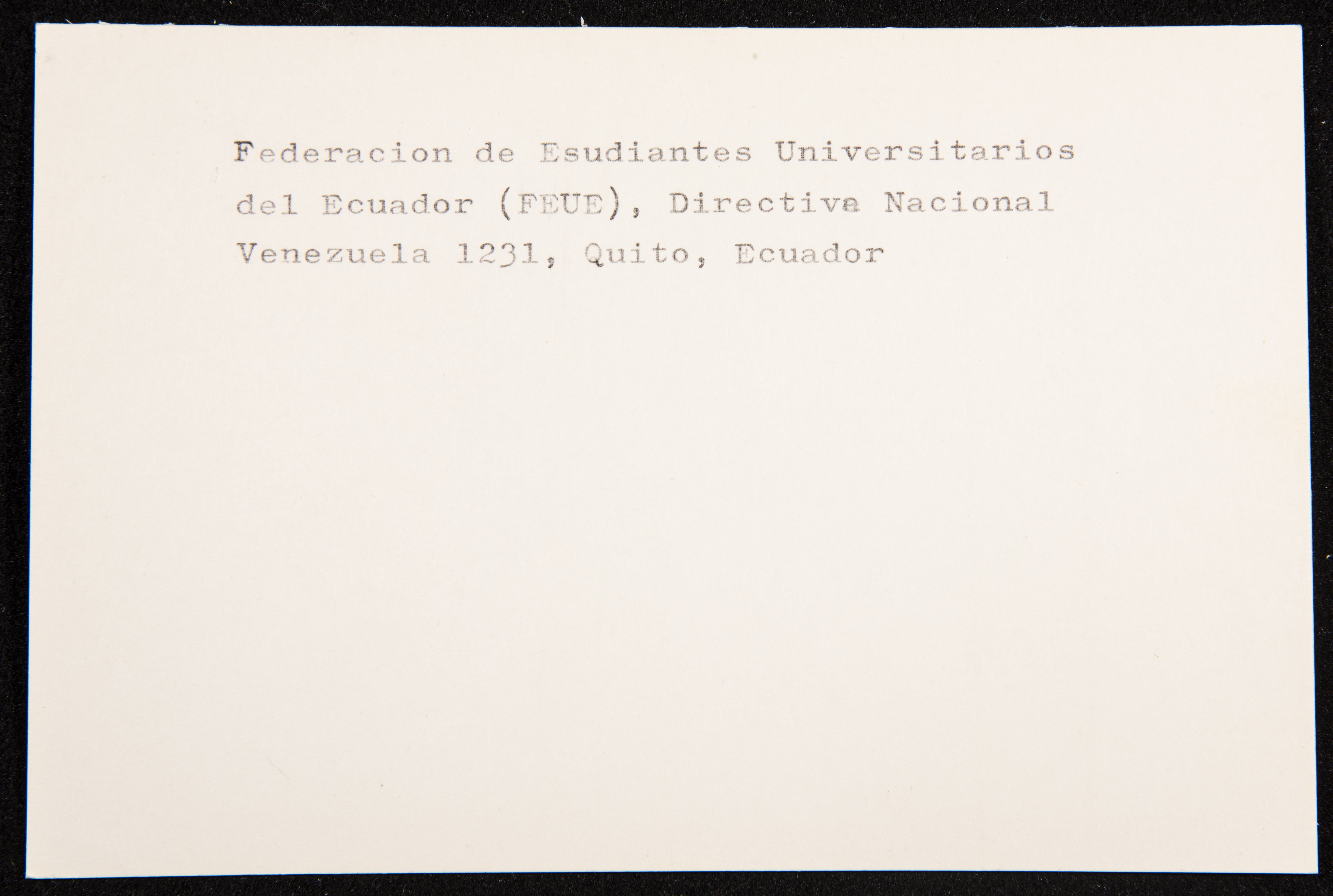توثق هذه القصاصة، المكتوبة بخط اليد، عنوان "اتحاد طلبة الجامعات الإكوادورية"، الإكوادور. من غير المعلوم إن كانت هذه القصاصة بغرض العمل البحثي أم لأغراض أخرى.
