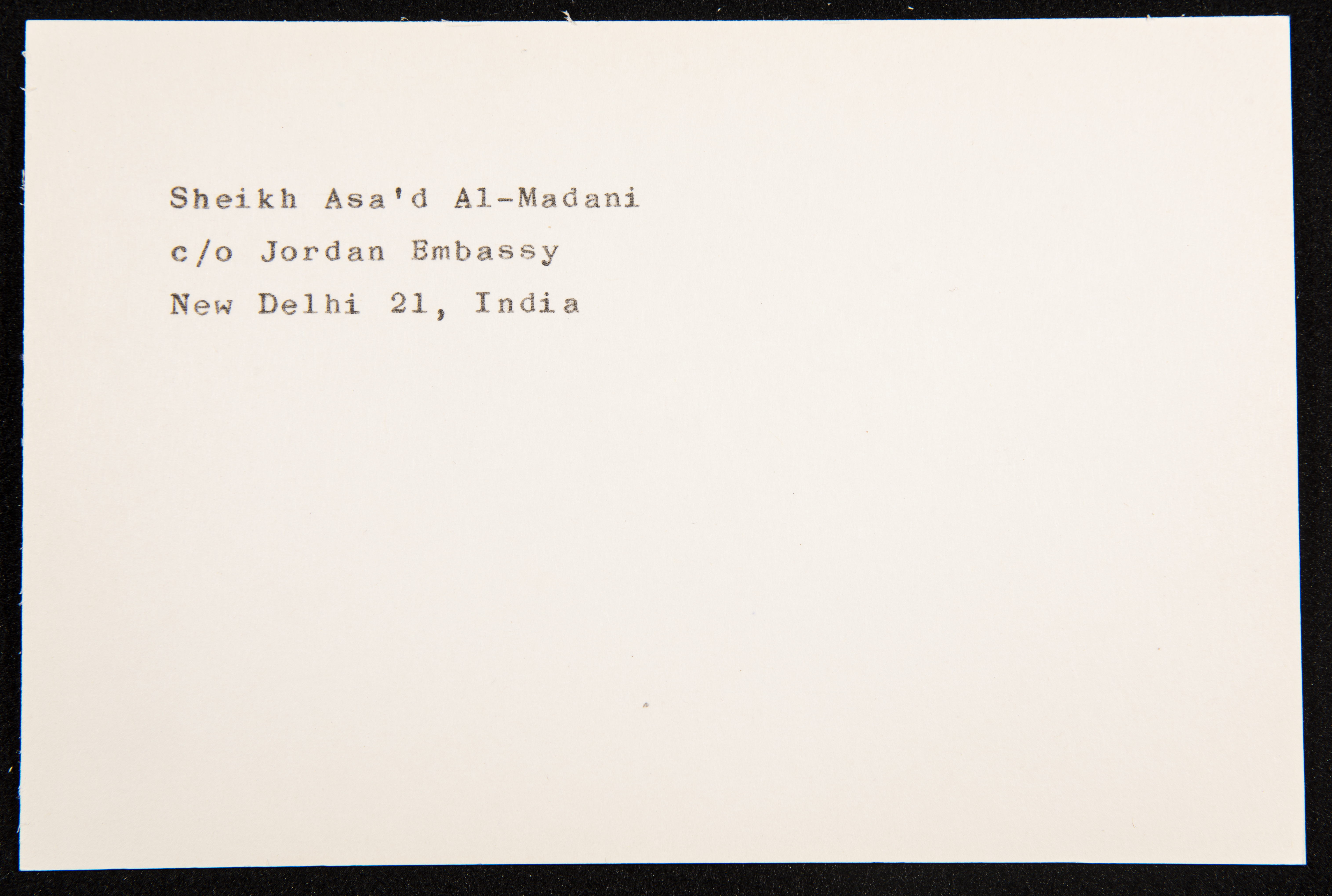 توثق هذه القصاصة، المطبوعة بالآلة الكاتبة، عنوان أسعد المدني من السفارة الأردنية في نيودلهي في الهند. من غير الواضح اذا ما كانت القصاصة عبارة عن رسالة بريدية أم قصاصة توثيقية بحثية.