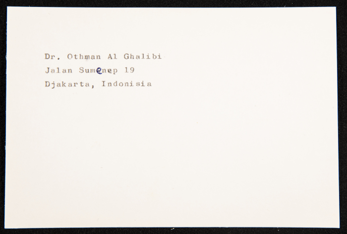 Typewritten in Arabic, this paper clipping documents the address of Dr ʿOthman al-Ghalibi, Jalan Sumenep 19, Djakarta Indonesia. The clipping could be a letter or a clipping for research purposes.