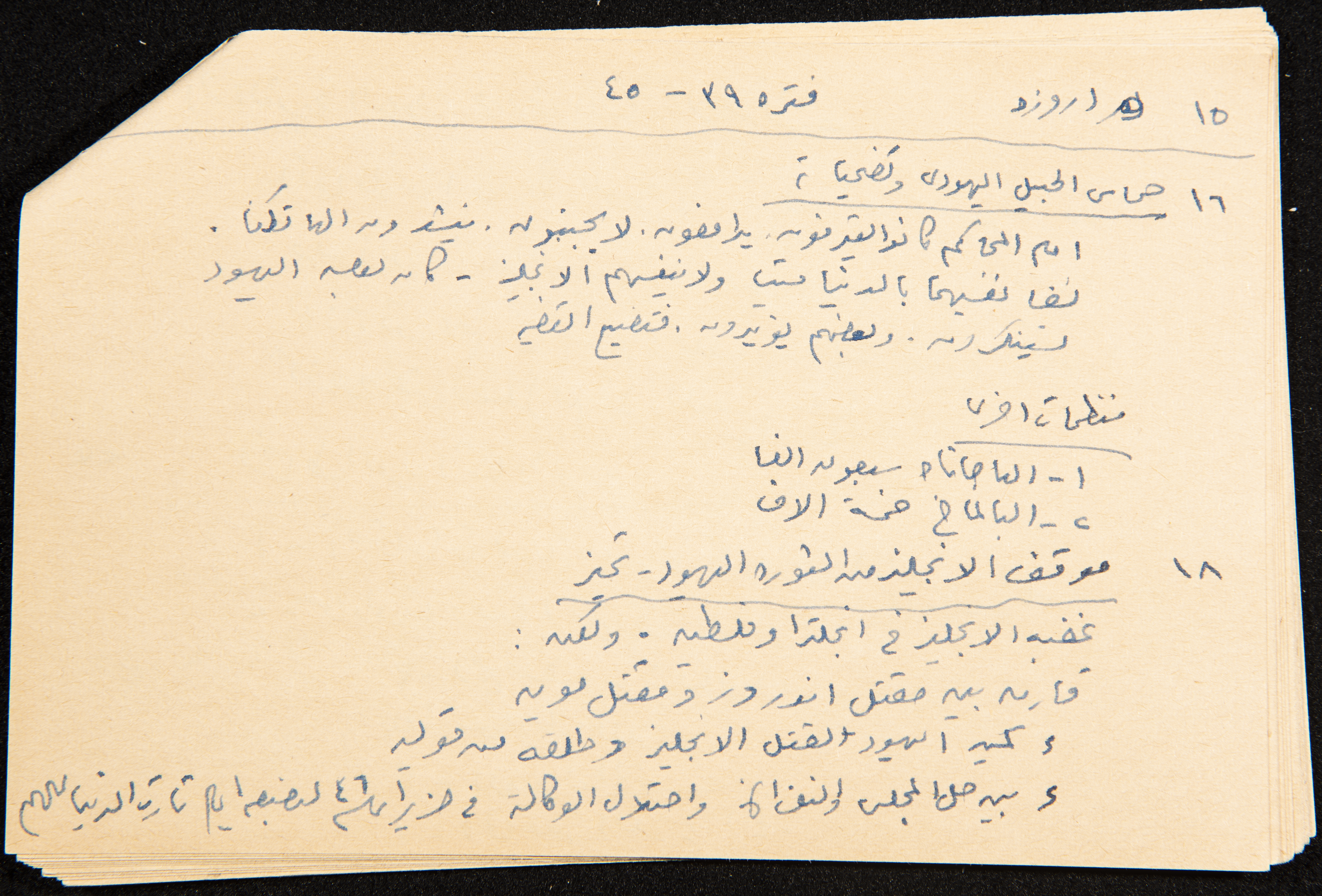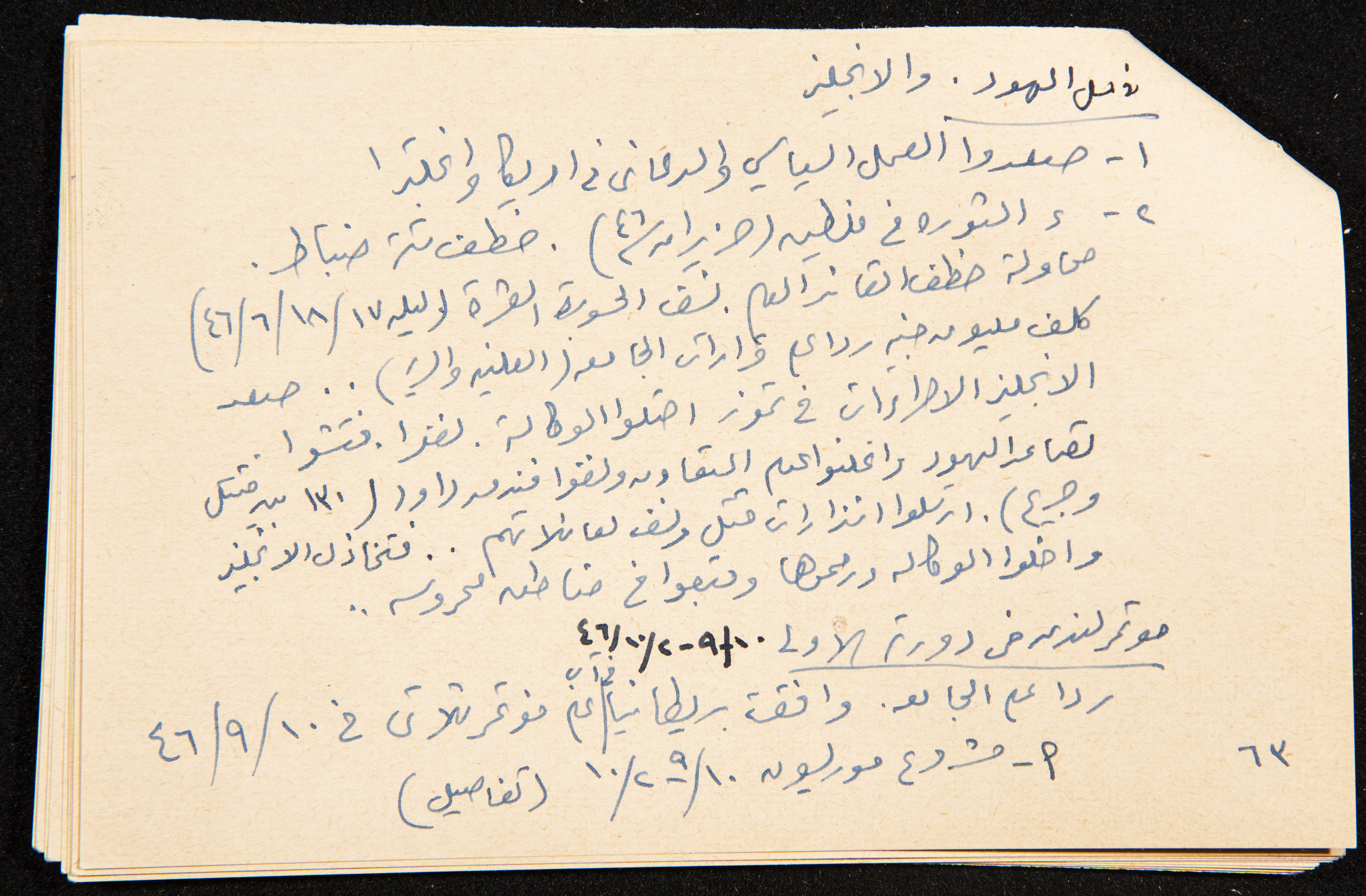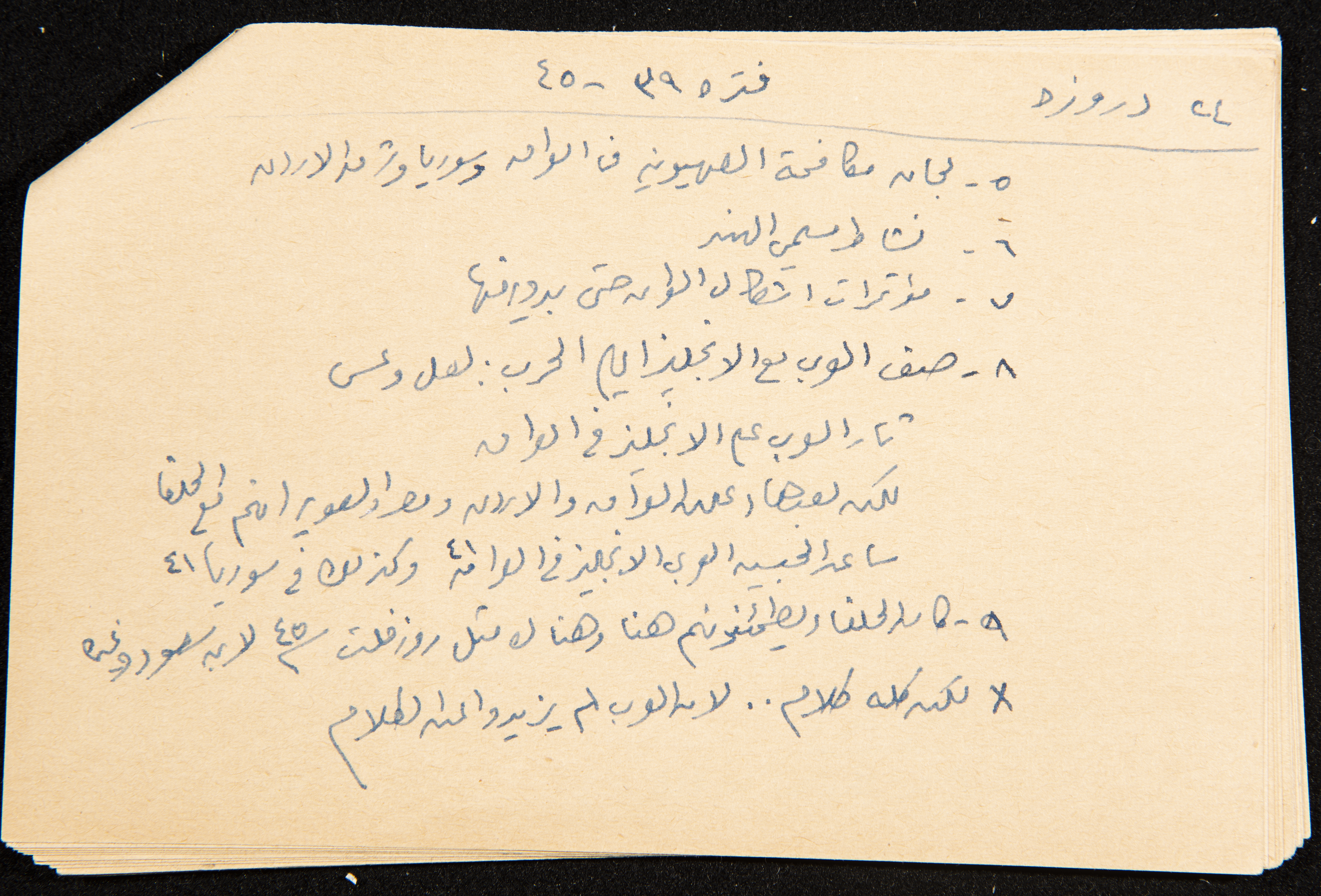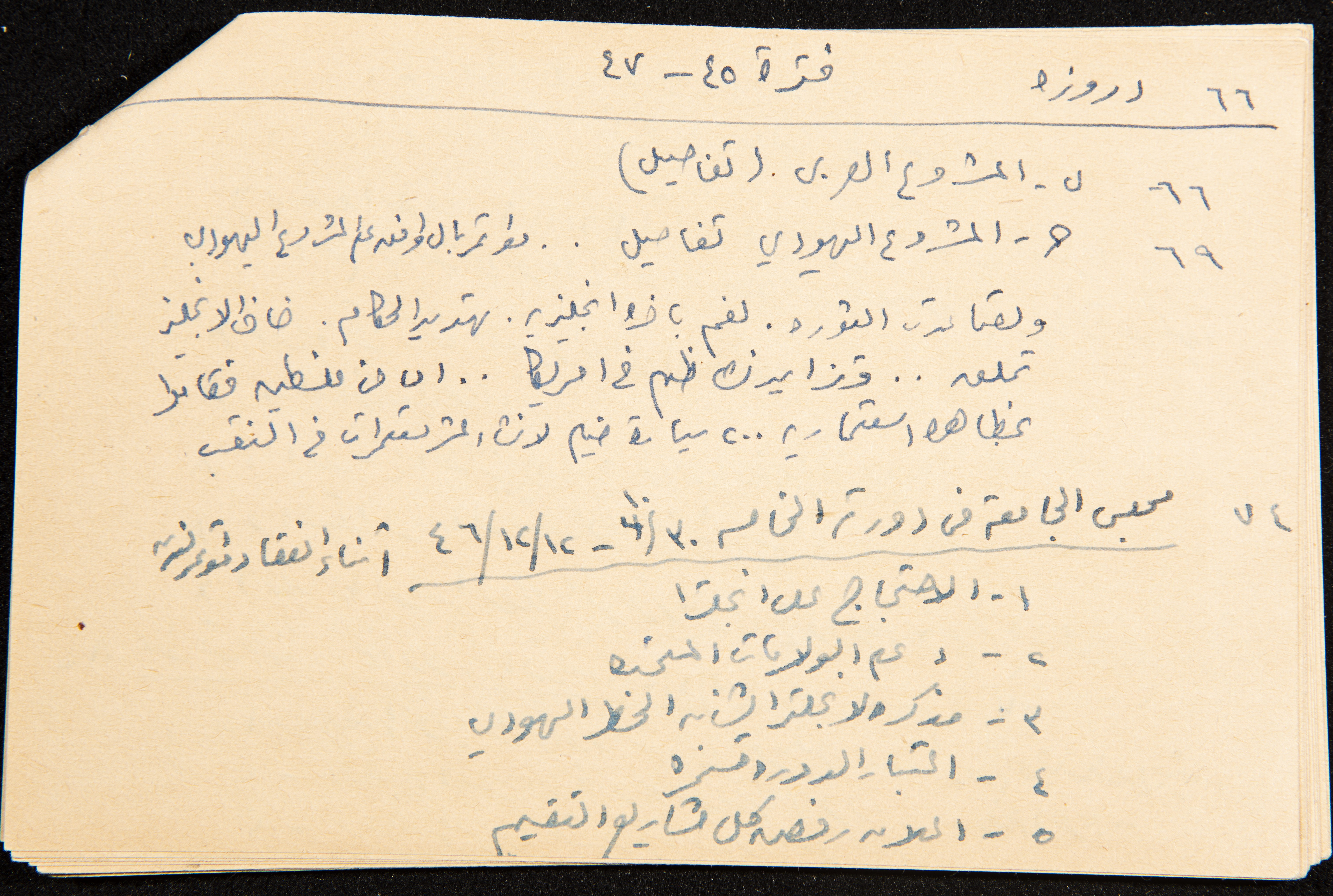 توثق هذه القصاصة، المكتوبة بخط اليد، ملاحظات كتبها الزواتي من كتاب عزة دروزة وكان هدفه جمع المعلومات حتى سنة 1954 إلا أنه يشير إلى أنه جمع لغاية 22/7/1947. بلغ مجموعة هذه القصاصات 30 قصاصة مجموعة كملف واحد.