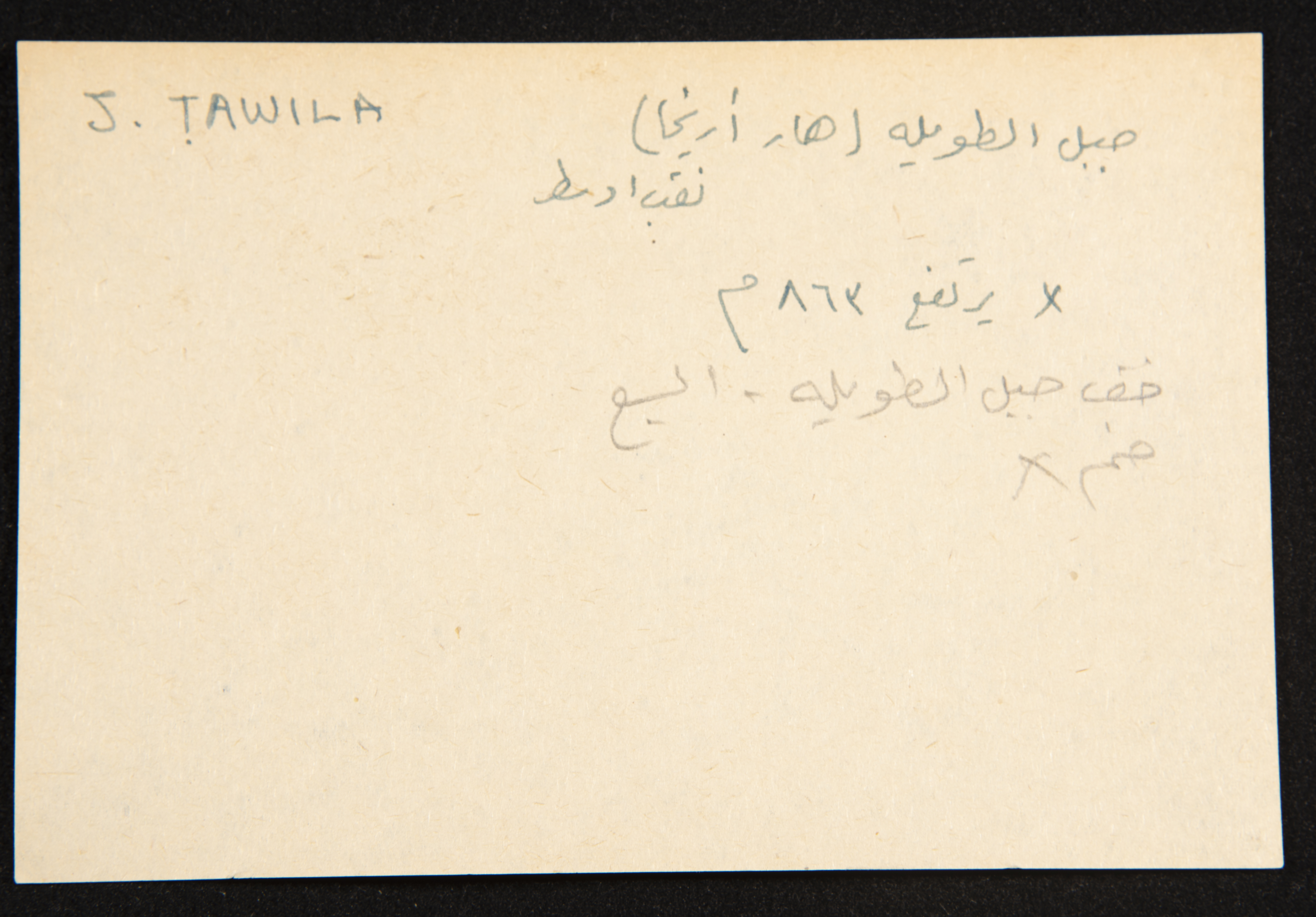 Handwritten in Arabic, this paper clipping documents the name of "Jabal Tawila (Har Arikha in Hebrew)", a mountain set at 863 meters above sea level in the Negev.
