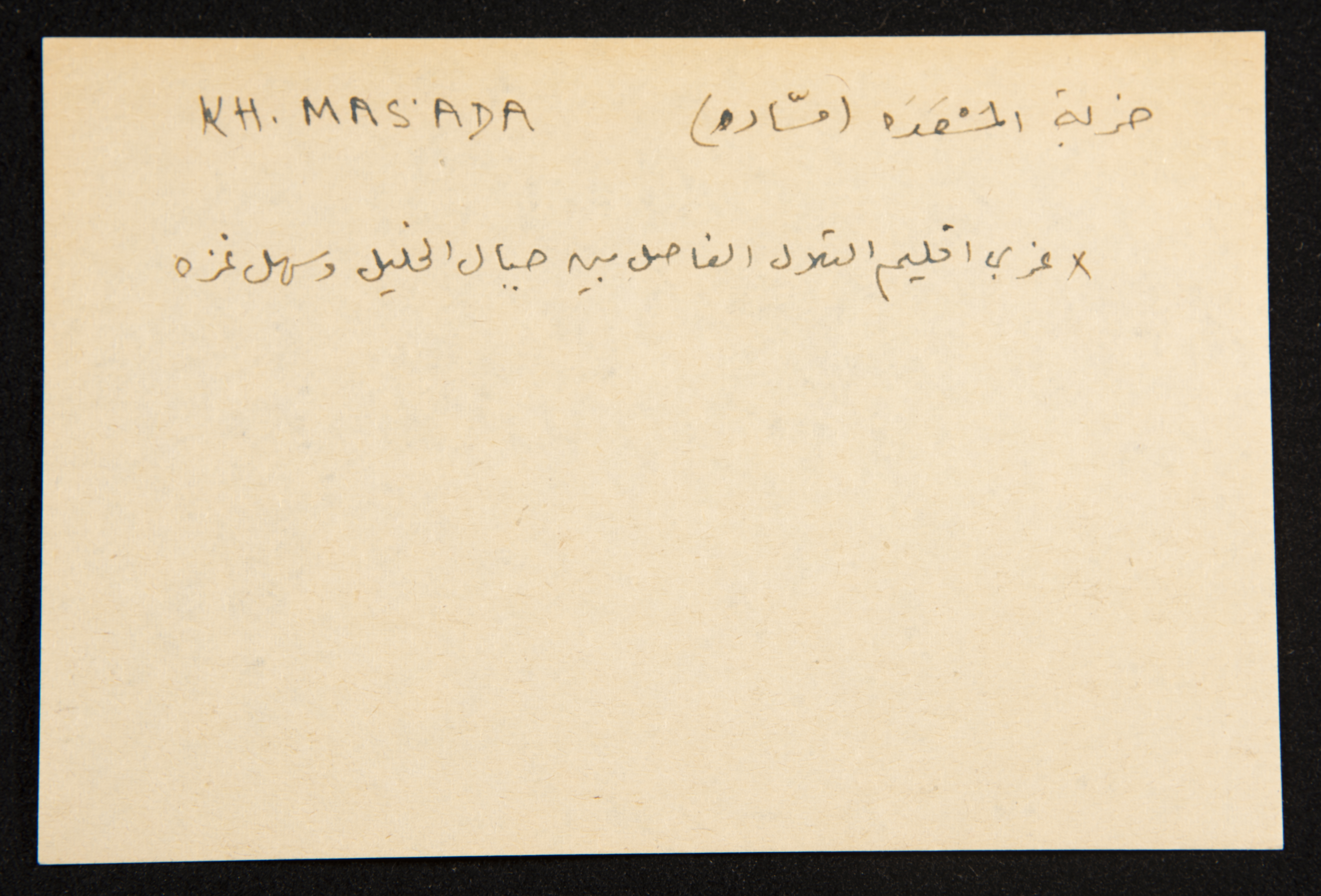 Handwritten in Arabic, this paper clipping documents the name of "Khirbet Mas'ada (Masadah in Hebrew)", a Khirbet (helmet) west of Iqlim al-Tilal separating the Hebron hills and Gaza's costline.