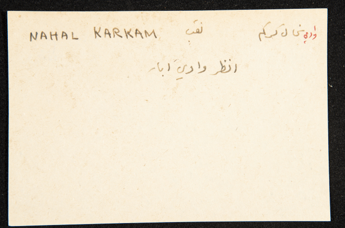 Handwritten in Arabic, this paper clipping documents the name of "Wadi Abar (Wadi Karkam in Hebrew)", a valley in the Negev.
