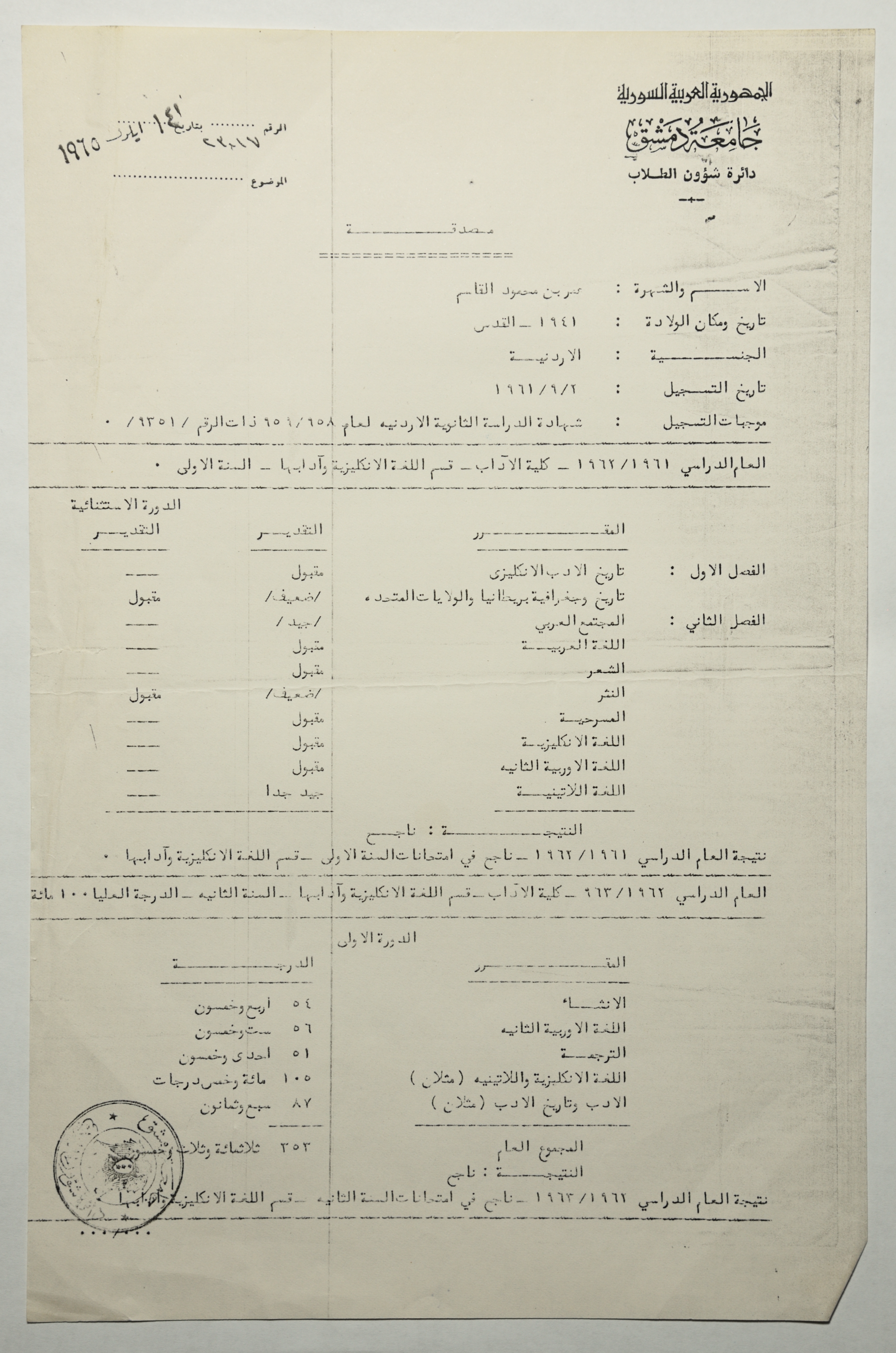 Dated 14 September 1965, this document shows a copy of the first-year results of the 1961-1962 academic year for Omar al-Qasim while studying at Damascus University.