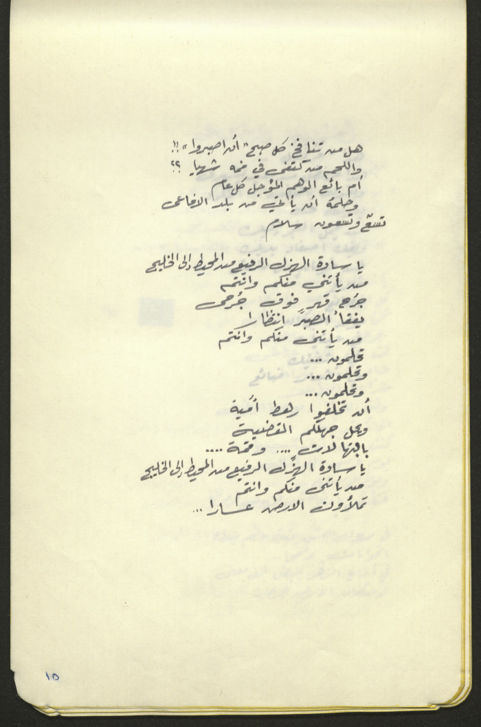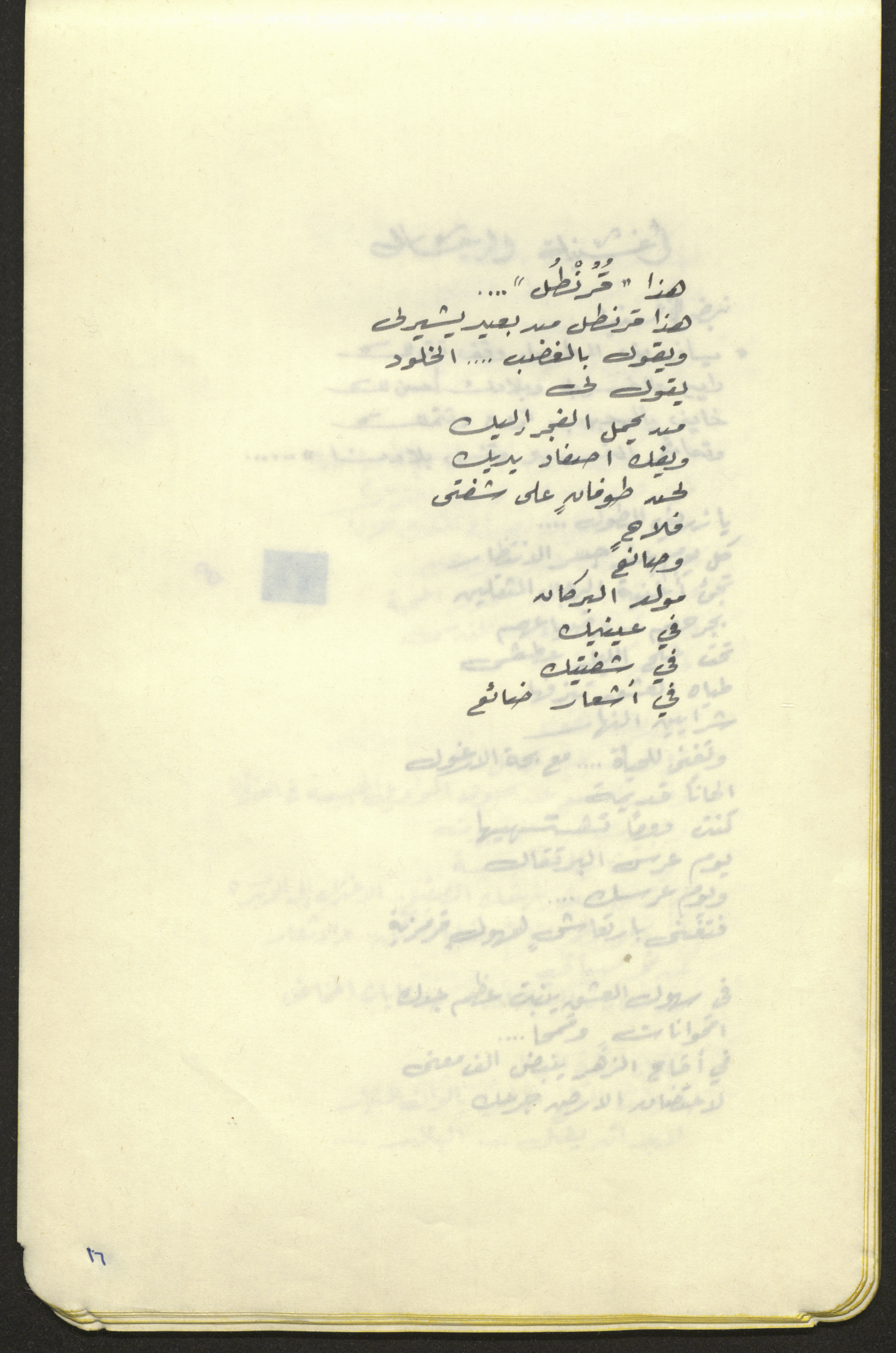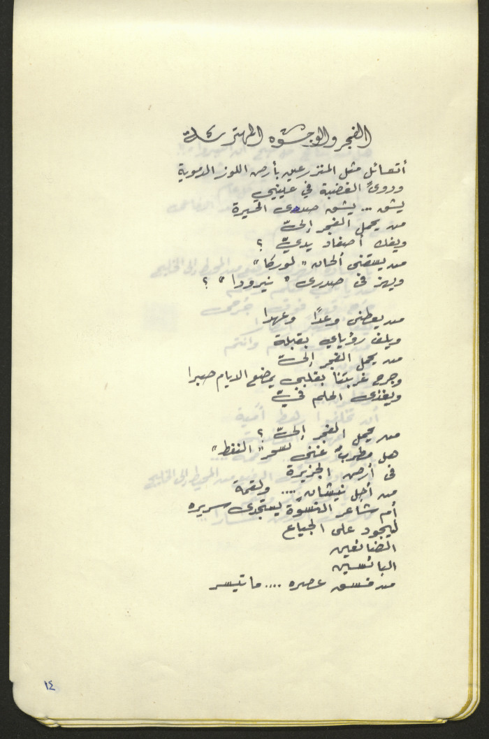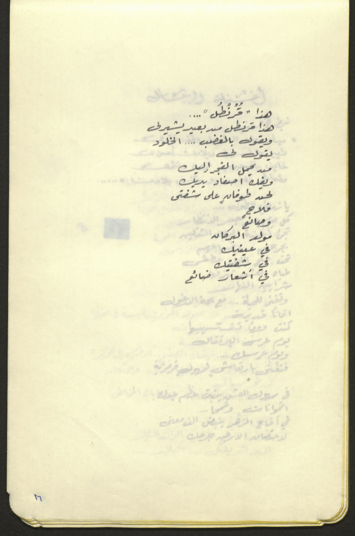 Found in the Mohammad Batrawi Collection, this document shows a poem by poet Tawfiq al-Haj entitled "Dawn and Worn Out Faces" featured in his diwan entitled "Spikes of Love". This advance copy features fonts sketched by Mohammad Batrawi.