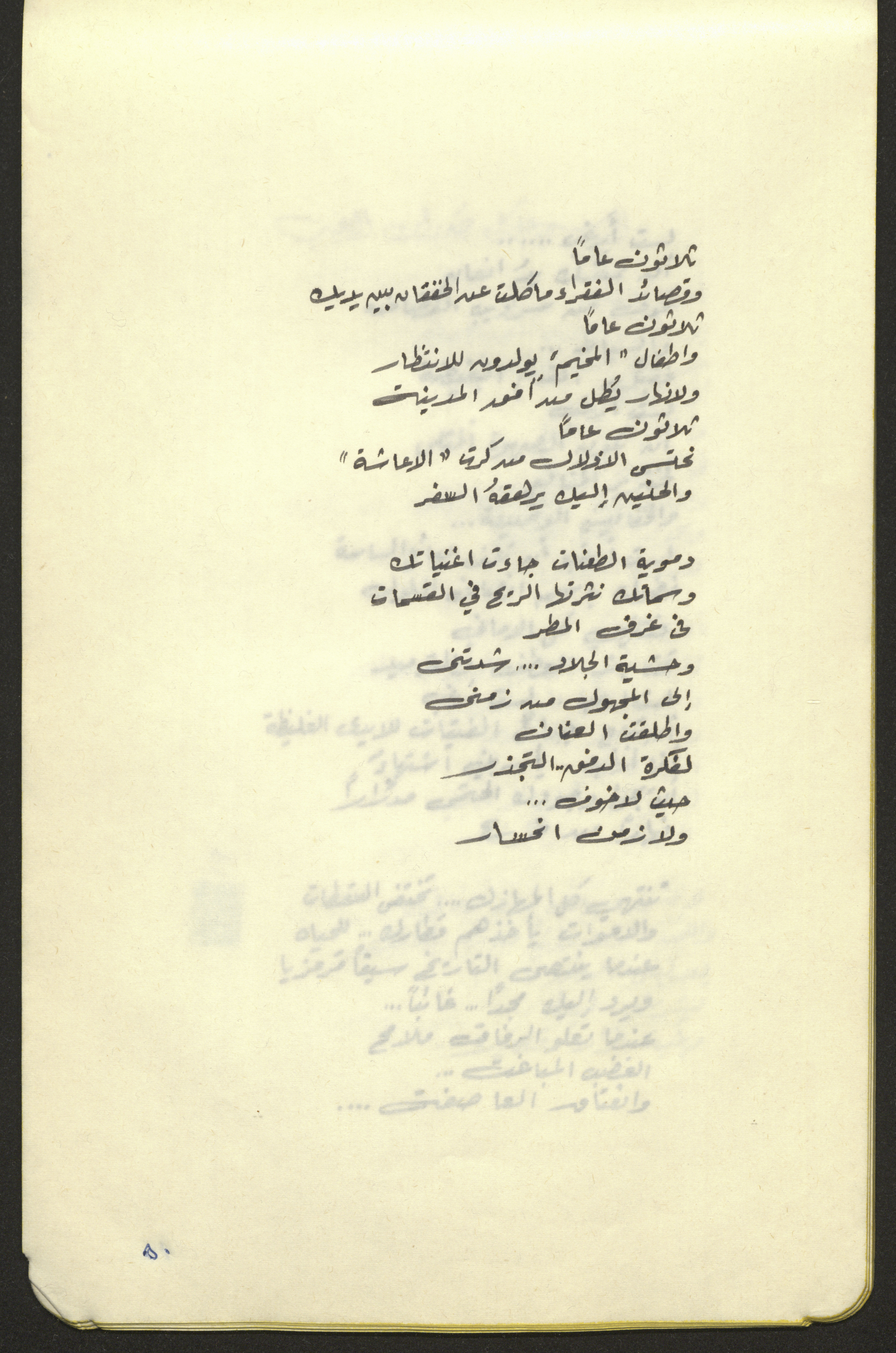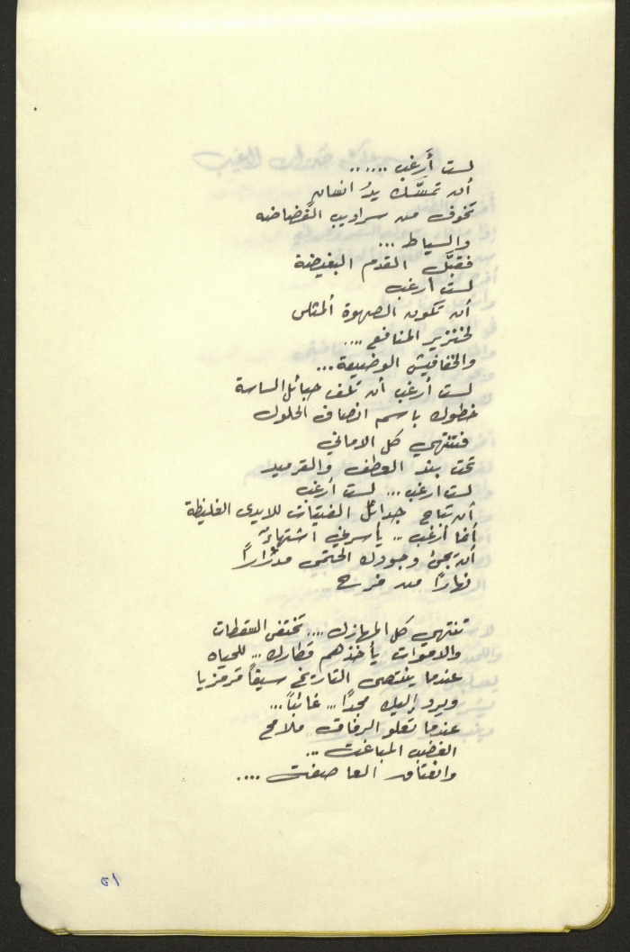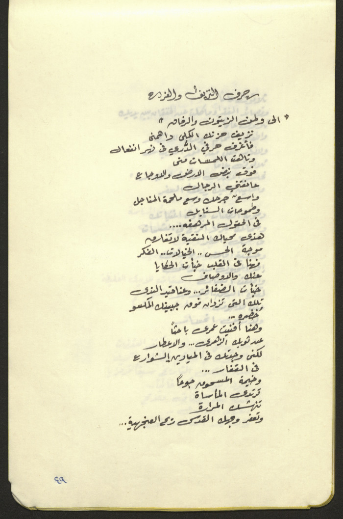 Found in the Mohammad Batrawi Collection, this document shows a poem by poet Tawfiq al-Haj entitled "The Character of Bleeding and Joy" featured in his diwan entitled "Spikes of Love". This advance copy features fonts sketched by Mohammad Batrawi.