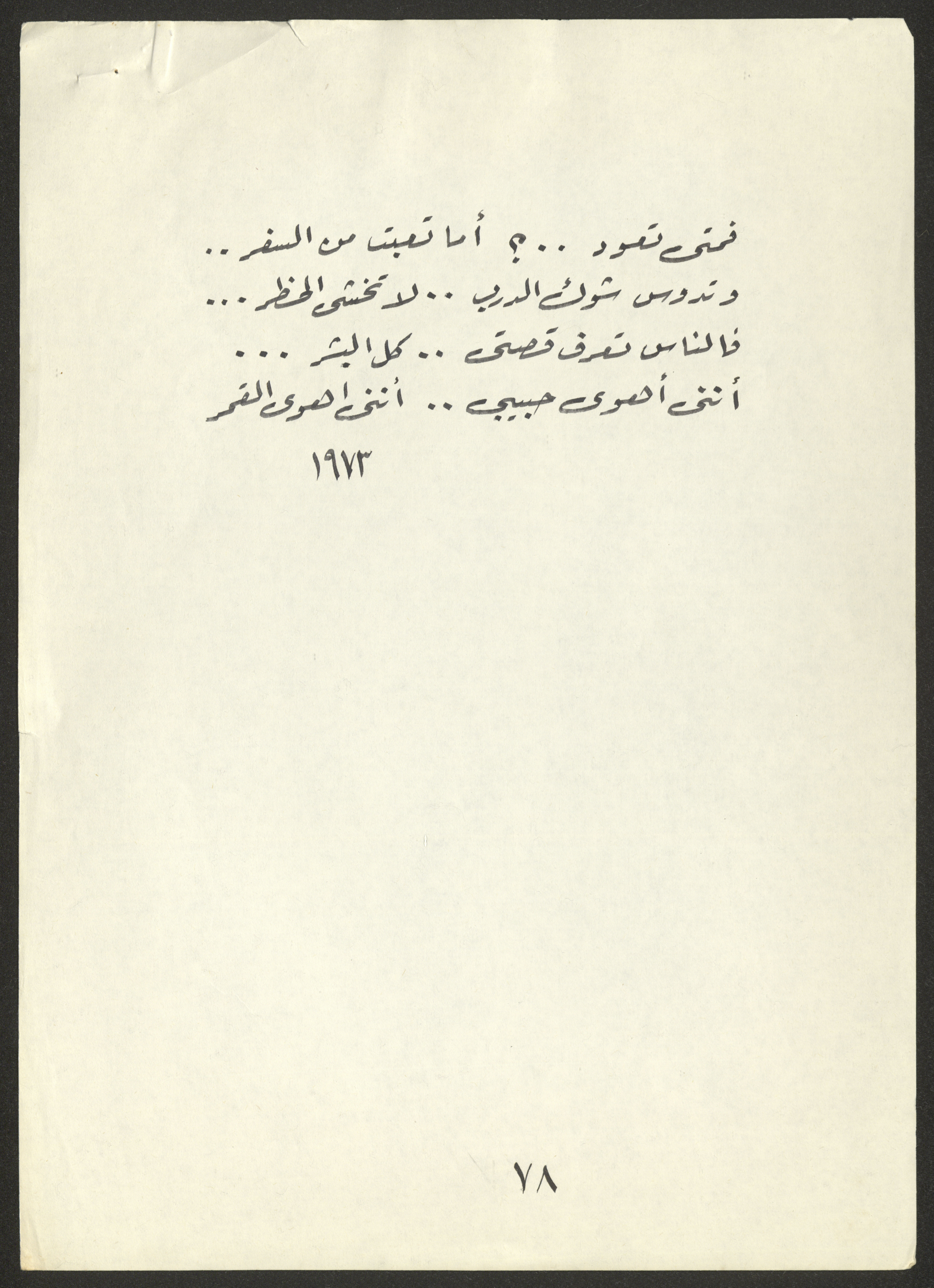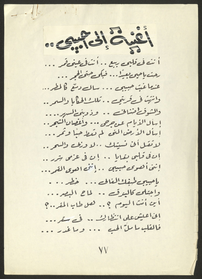 Found in the Mohammad Batrawi Collection, this document shows a poem by poet Ali Khalil Labad entitled "A Song to My Beloved" featured in his diwan entitled "I Grow Up Under the Sun's Shadow". This advance copy features fonts, illustrations, and a cover sketched by Palestinian artist Ismaʿil ʿĀshur.