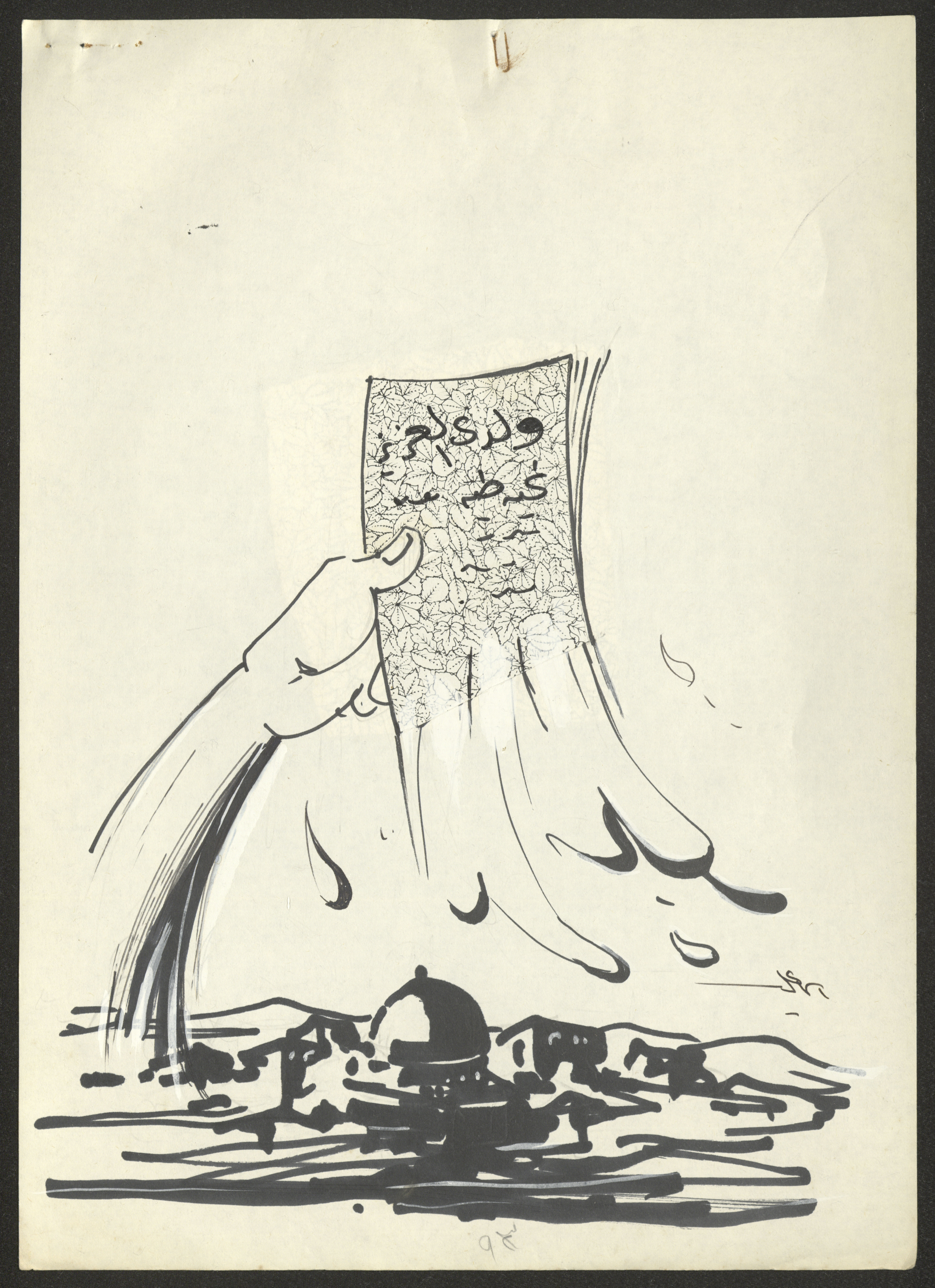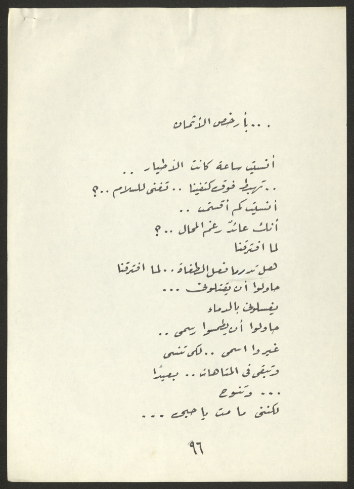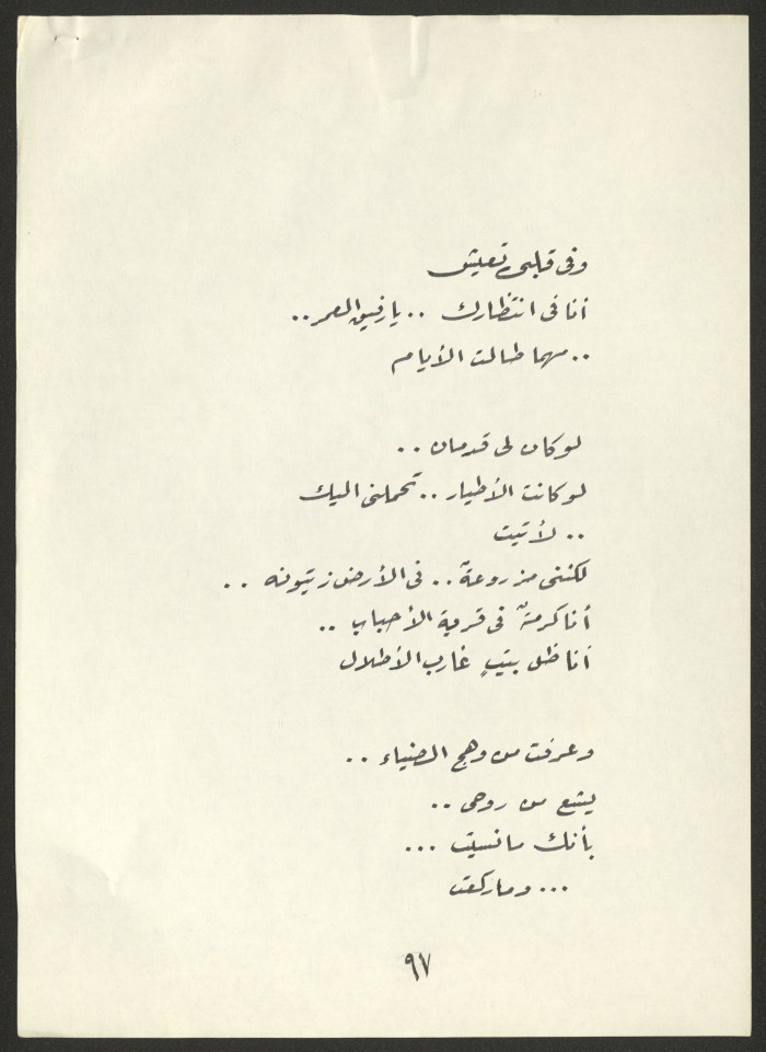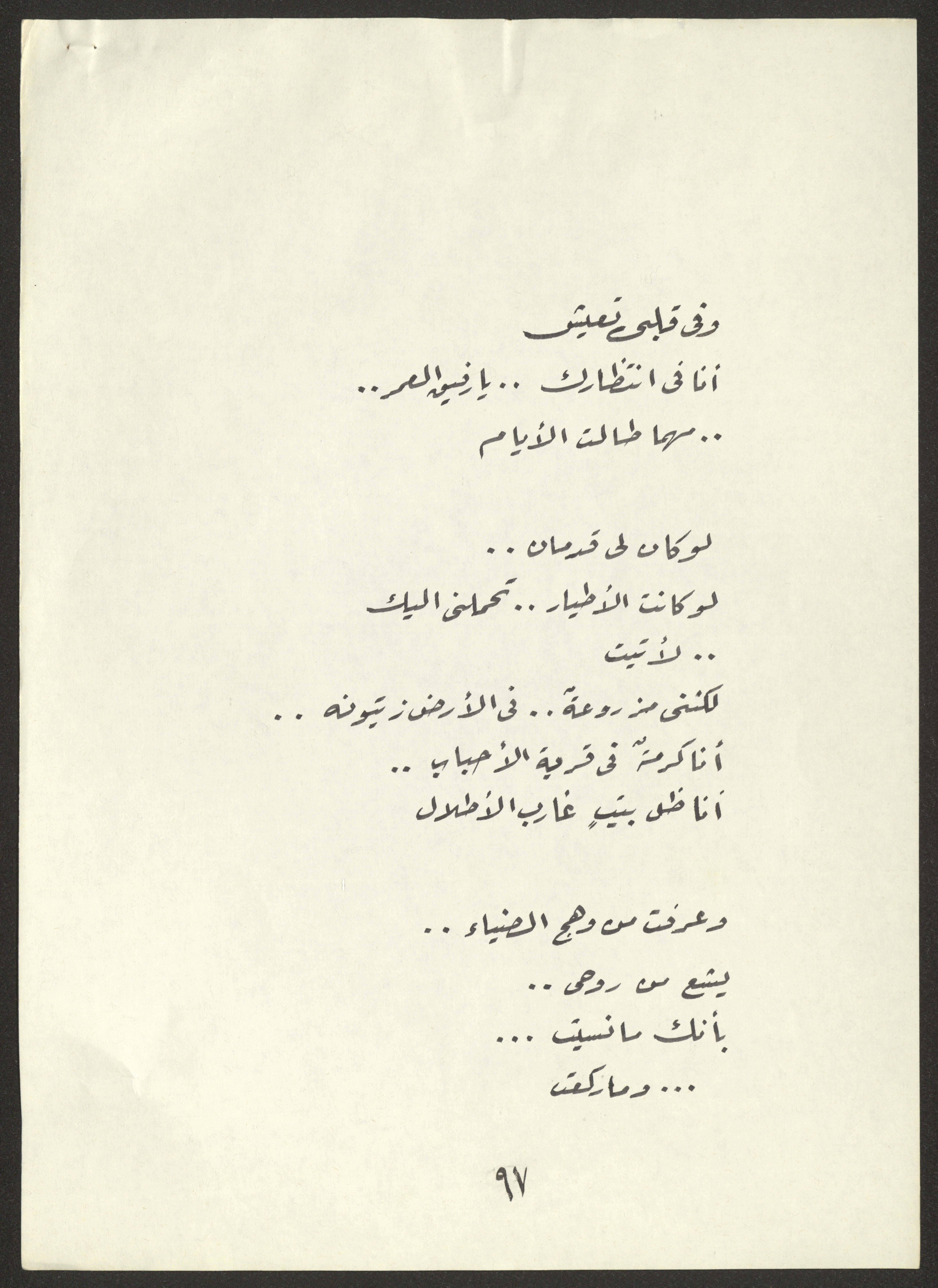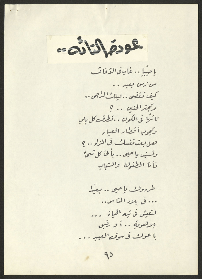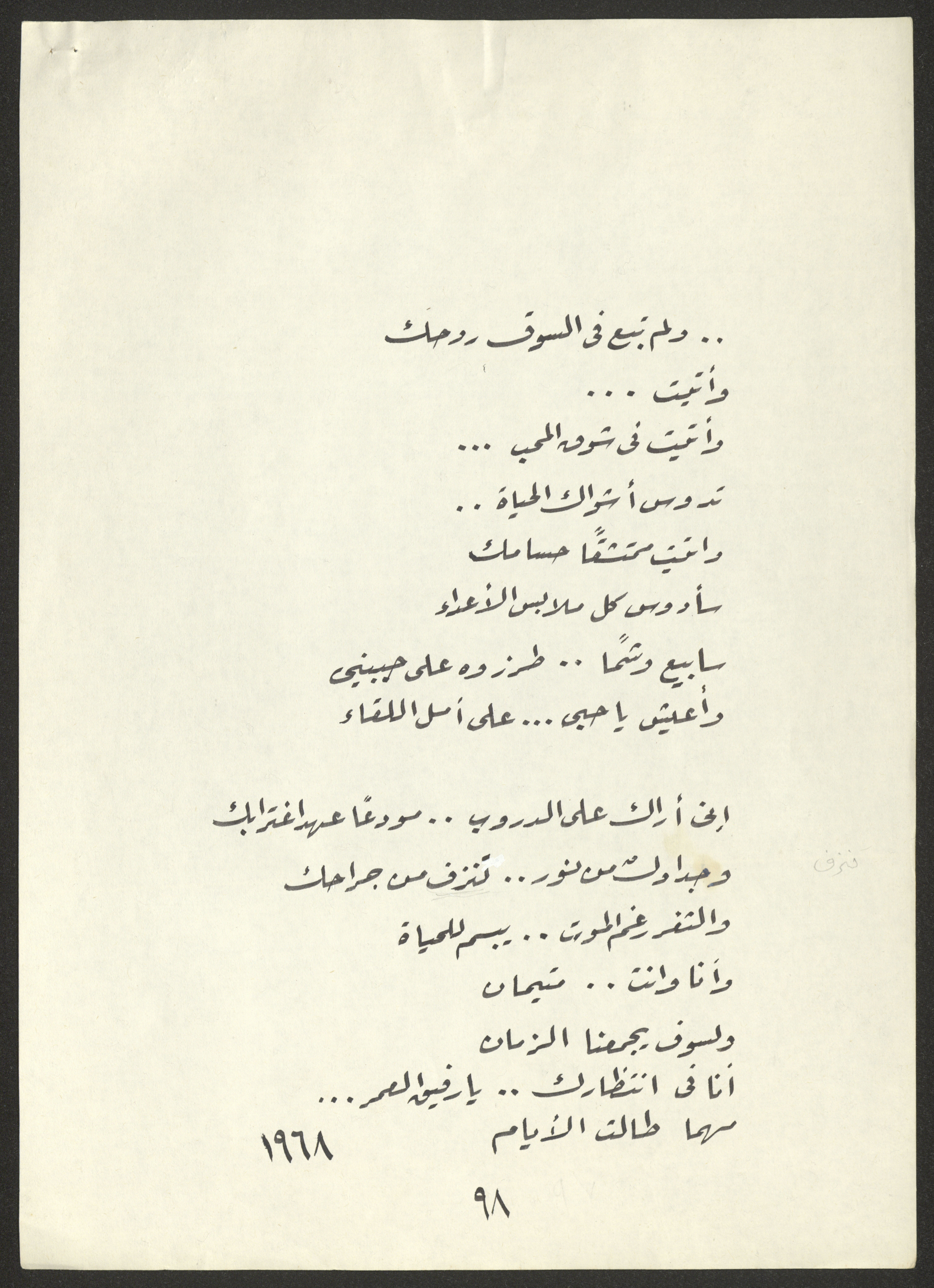 Found in the Mohammad Batrawi Collection, this document shows a poem by poet Ali Khalil Labad entitled "The Return of the Astray" featured in his diwan entitled "I Grow Up Under the Sun's Shadow". This advance copy features fonts, illustrations, and a cover sketched by Palestinian artist Ismaʿil ʿĀshur.