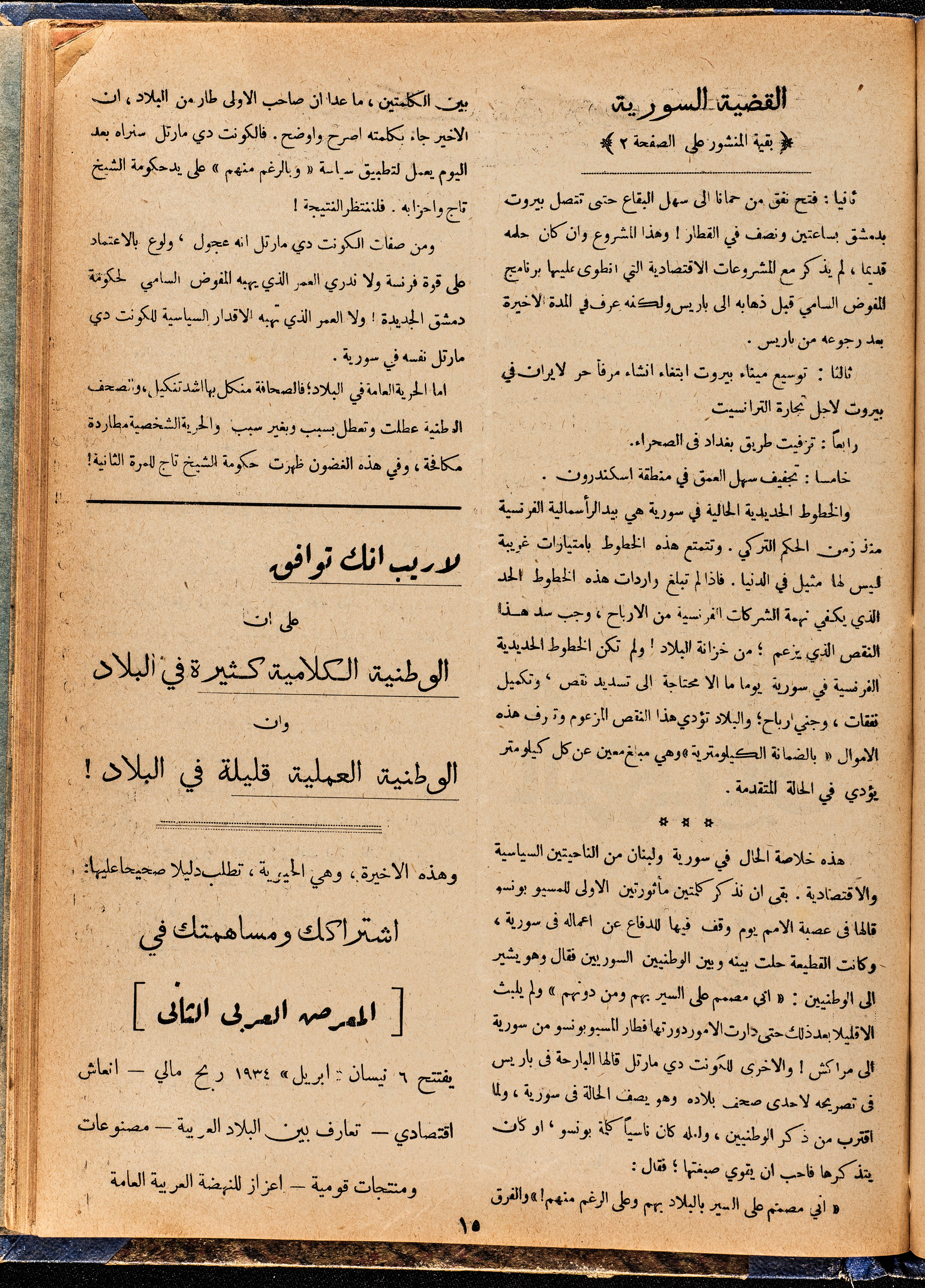 Issued in Arabic on 31 March 1934, this 16-page periodical features the 72nd issue of al-Arab Magazine. The issue embraces variegated articles and news including: 1. Portatif Parliament, 2. The late Musa Kaẓem Basha al-Husseiny, 3. The Parliamentary Committee Statement, 4. The photographs from the opening of the first exhibition on 6 Jul 1933, 5. The Situation in Sudan, since the Arab conquest till this day, 6. The political speech about the Syrian cause, that was held in the Ummayad Mosque in Aleppo.