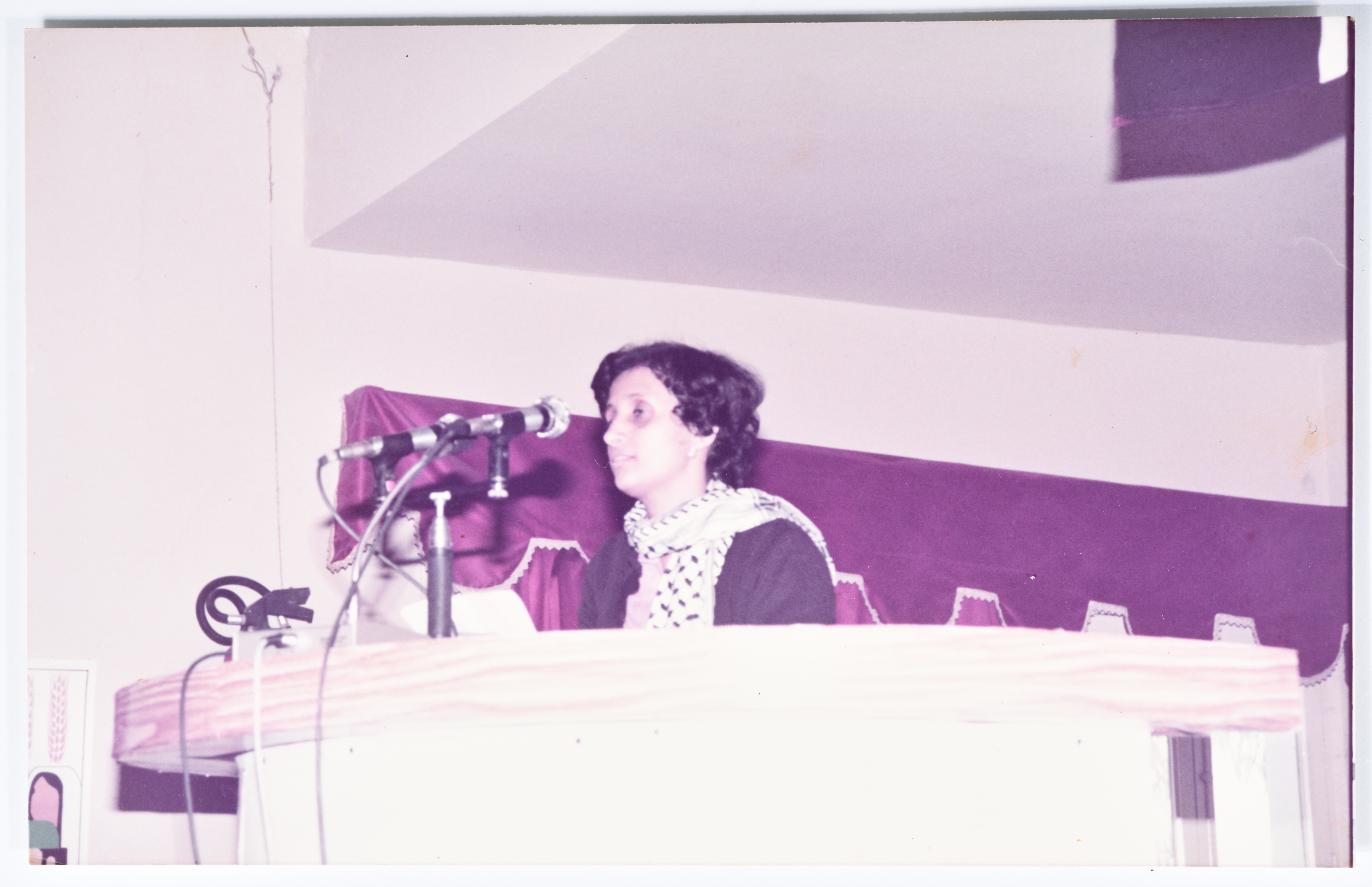 صورة ملونة لممثلة الجمهورية اليمنية وهي تلقي كلمة بلادها عن الاتحاد النسائي العربي العام في مؤتمر الاتحاد العام للمرأة الفلسطينية في تونس