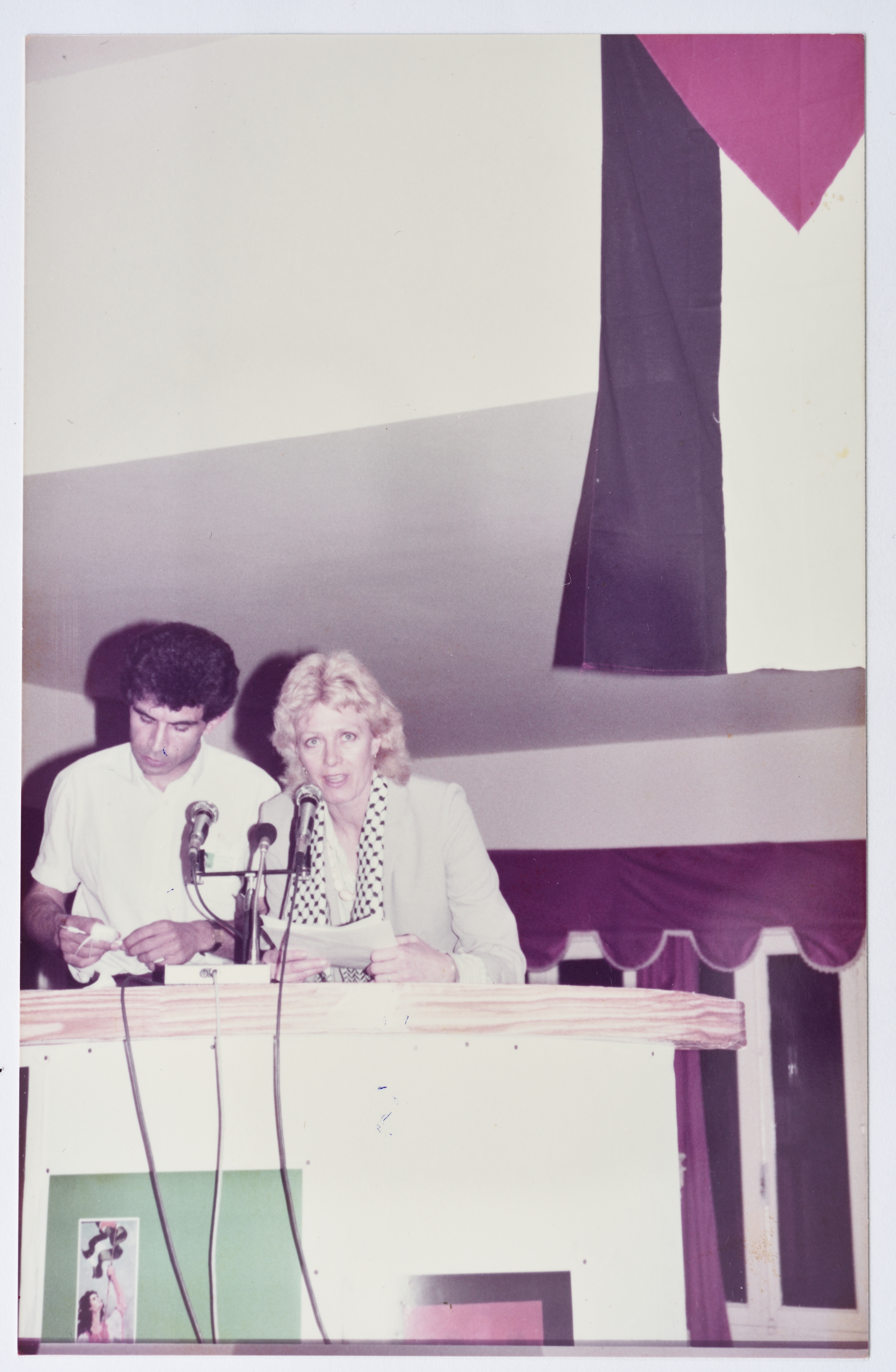 صورة ملونة لممثلة لجنة نساء السوفيات وهي تلقي كلمة بلادها في مؤتمر الاتحاد العام للمرأة الفلسطينية في تونس