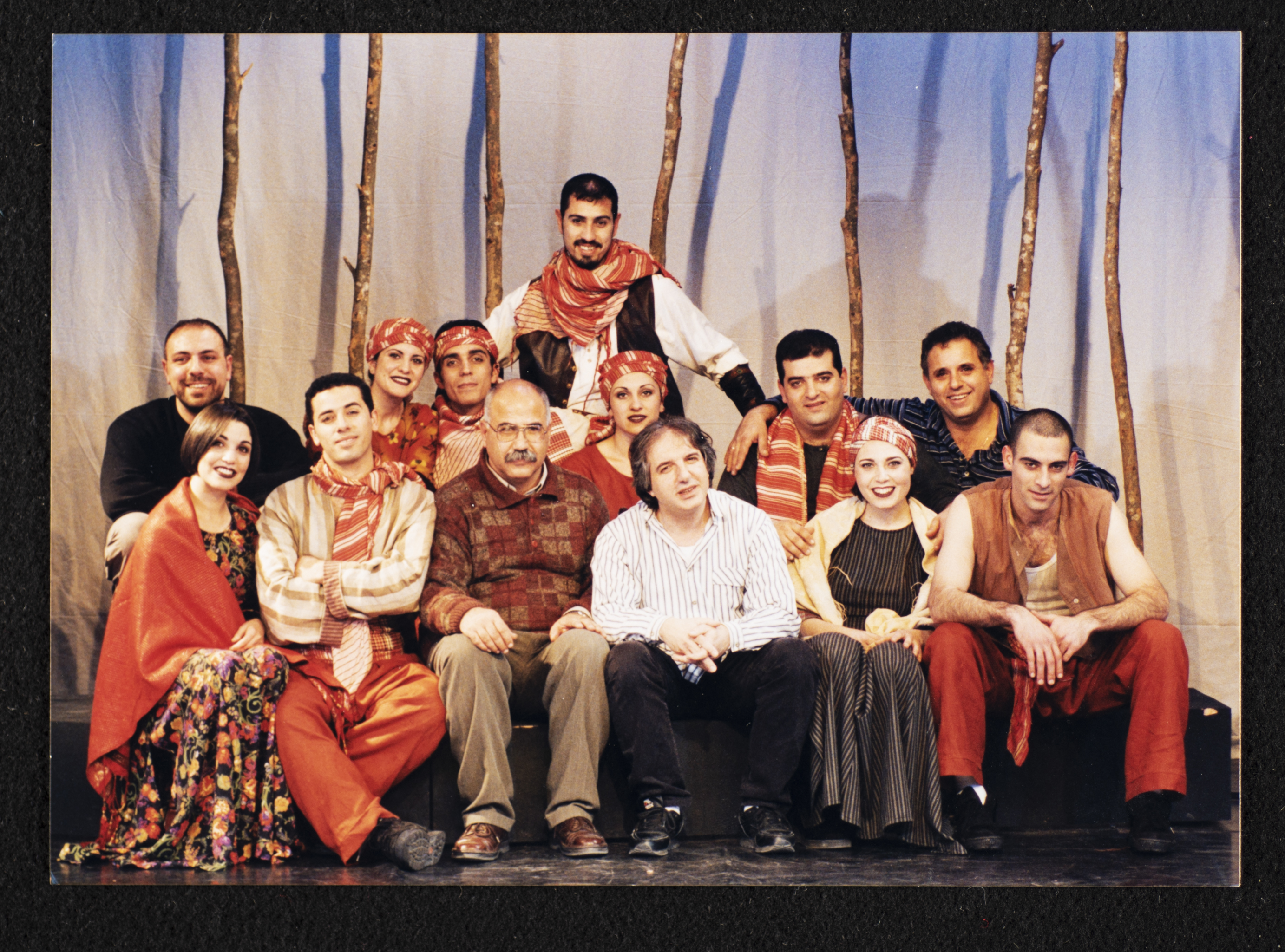 صورة ملونة يظهر فيها عدد من الفنانين الاستعراضيين المشاركين في غناية "أذكر" خلال عرضها على المسرح أمام الجمهور. يذكر أن غنائية "أذكر" من انتاج مسرح الميدان عام 2000، وهي للشاعر شكيب جهشان، والمسرحية من ألحان واخراج نبيل عازر، المسرحية الغنائية هذه تشكل لوحة فنية غنائية راقصة من الذاكرة الجماعية وتعكس واقع الحال الفلسطيني قبل وقوع النكبة عام 1948.