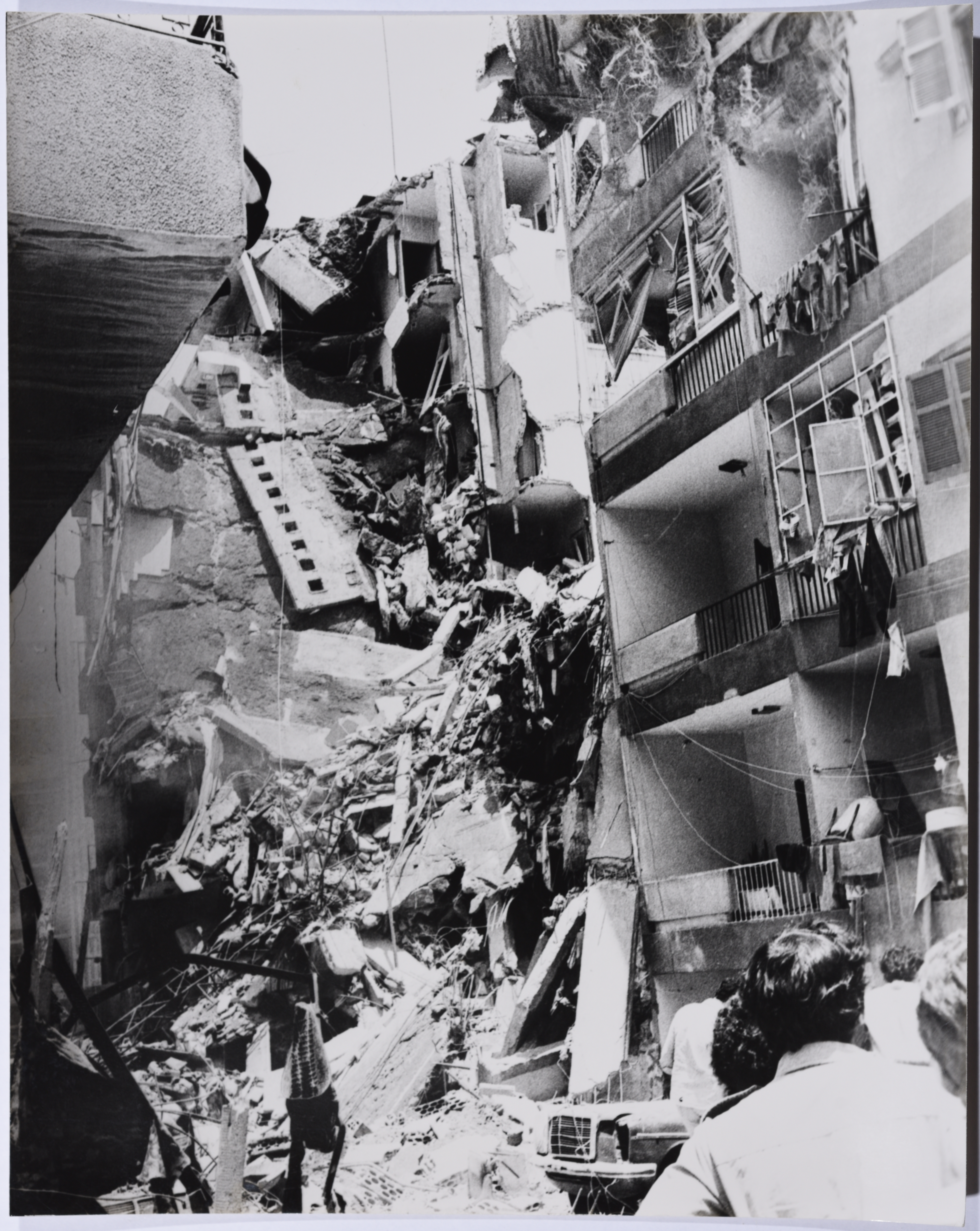 A black-and-white photograph showing a side of the destruction caused by the Israeli war on Lebanon (1982-1985)