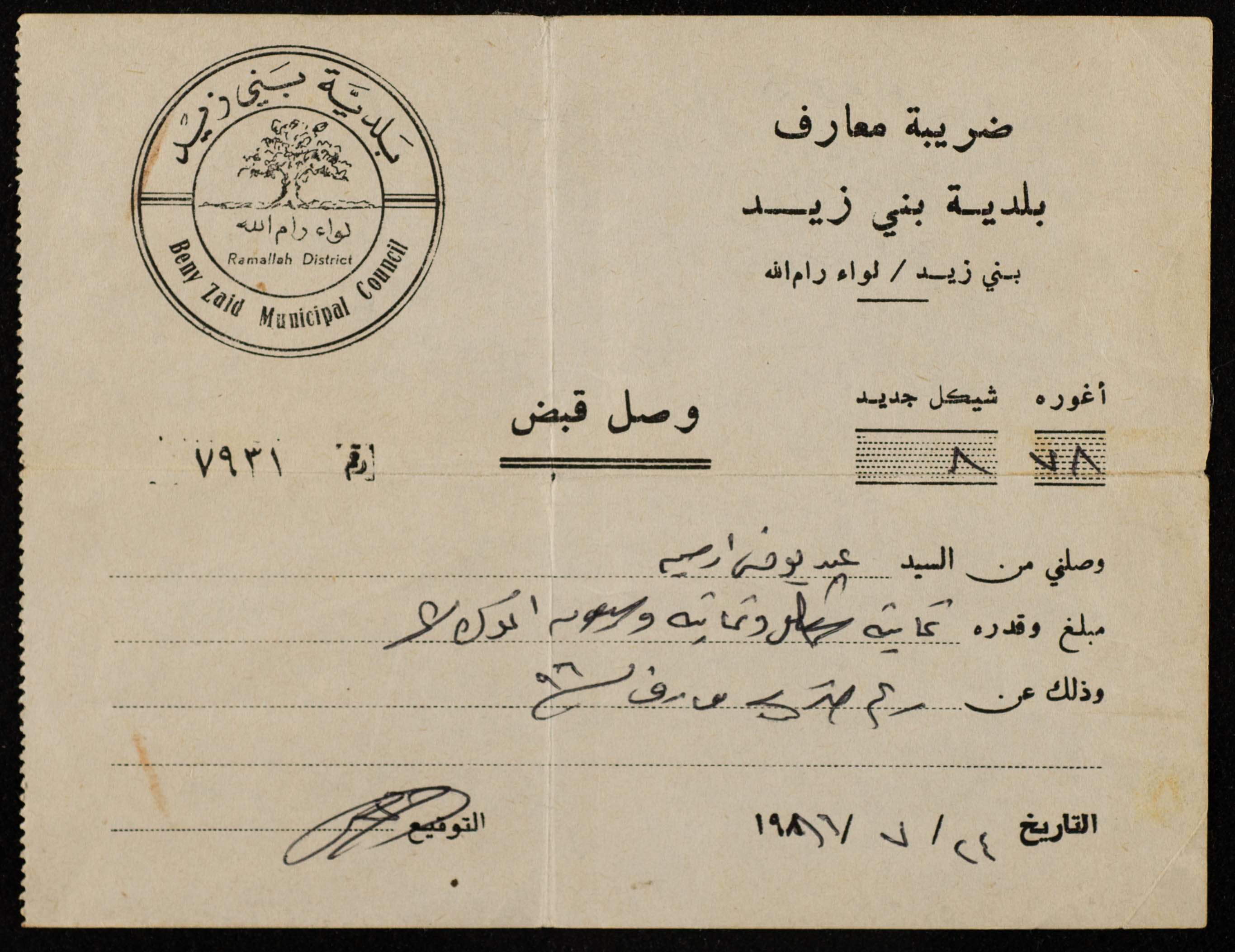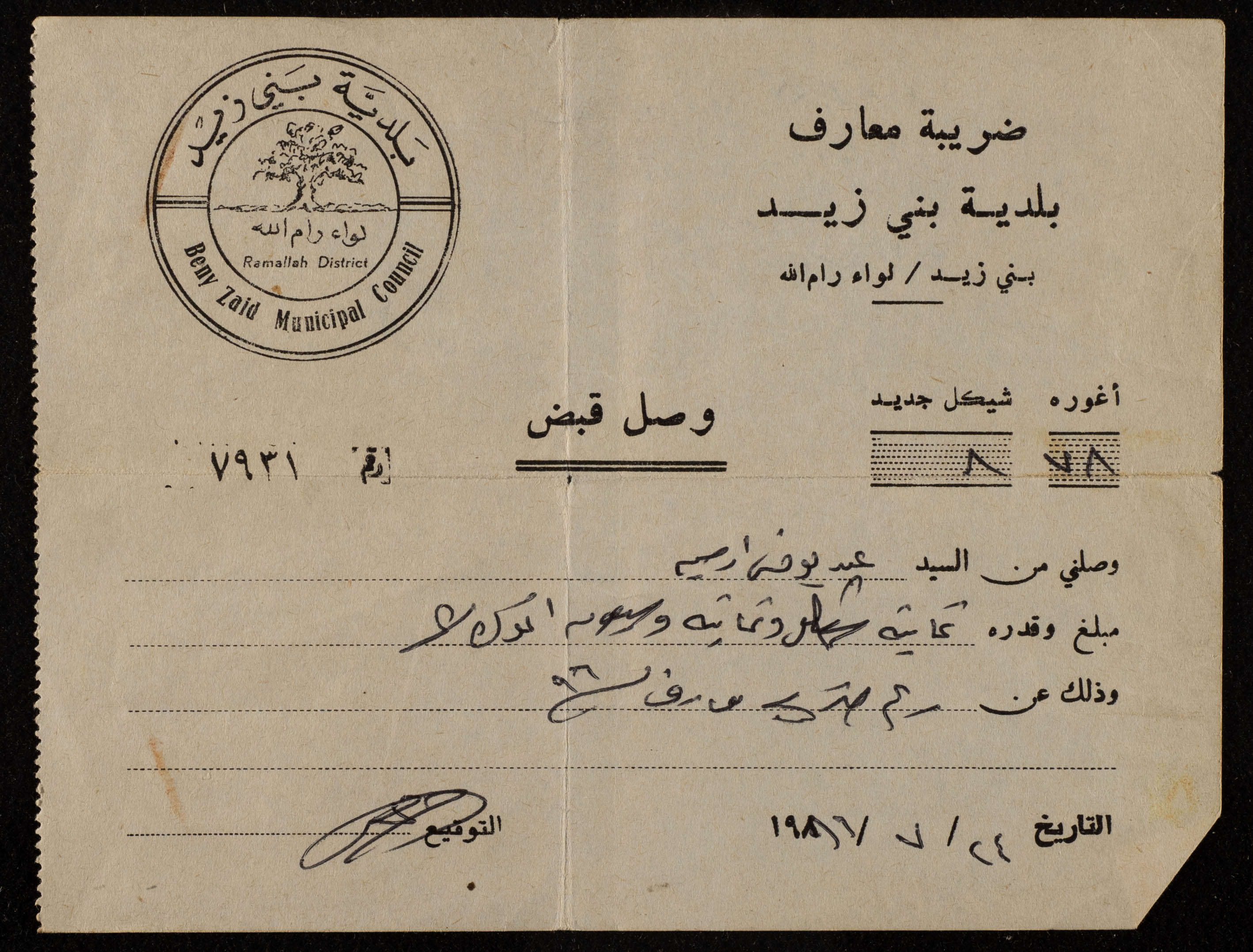 وثيقة مطبوعة باللغة العربية، تتضمن وصل قبض من عبد يونس ارجيمه من قرية بيت ريما الى ضريبة معارف بلدية بني زيد بقيمة ثمانية شيكل و ثمانية وسبعون اغوره وذلك عن رسم ضريبة معارف سنة 1996 بتاريخ 24 تموز 1996. وجدت في مجموعة عمر شفيق الريماوي