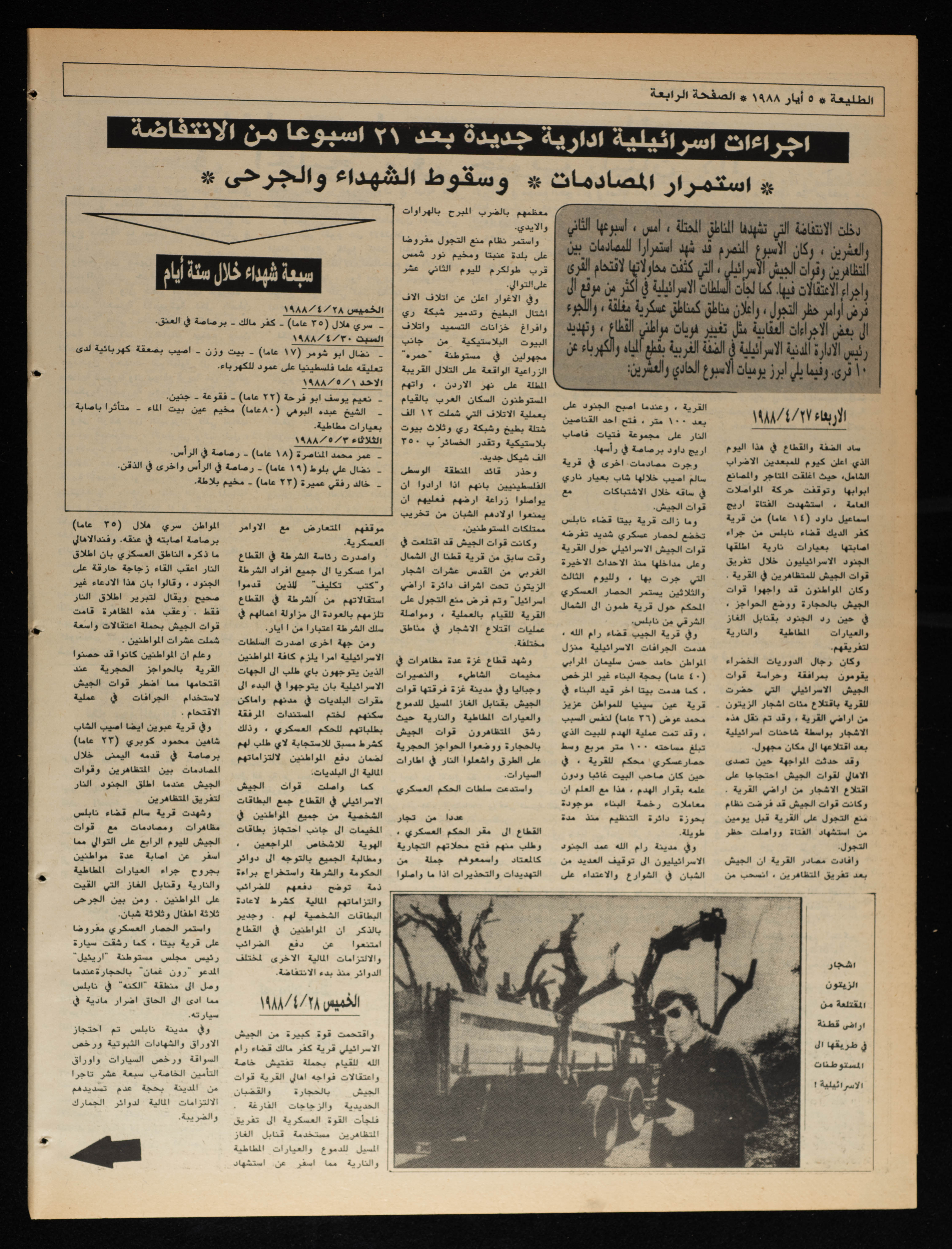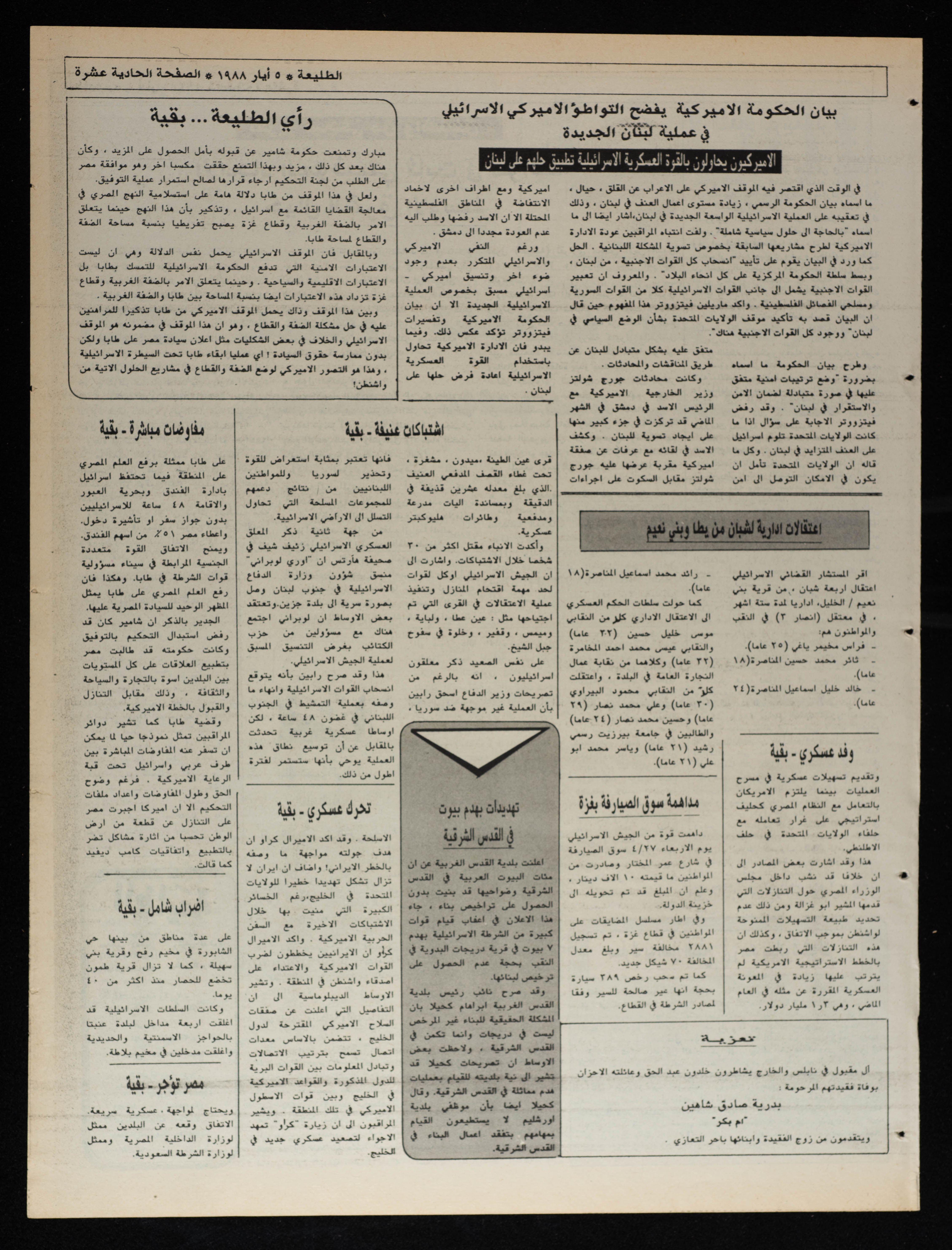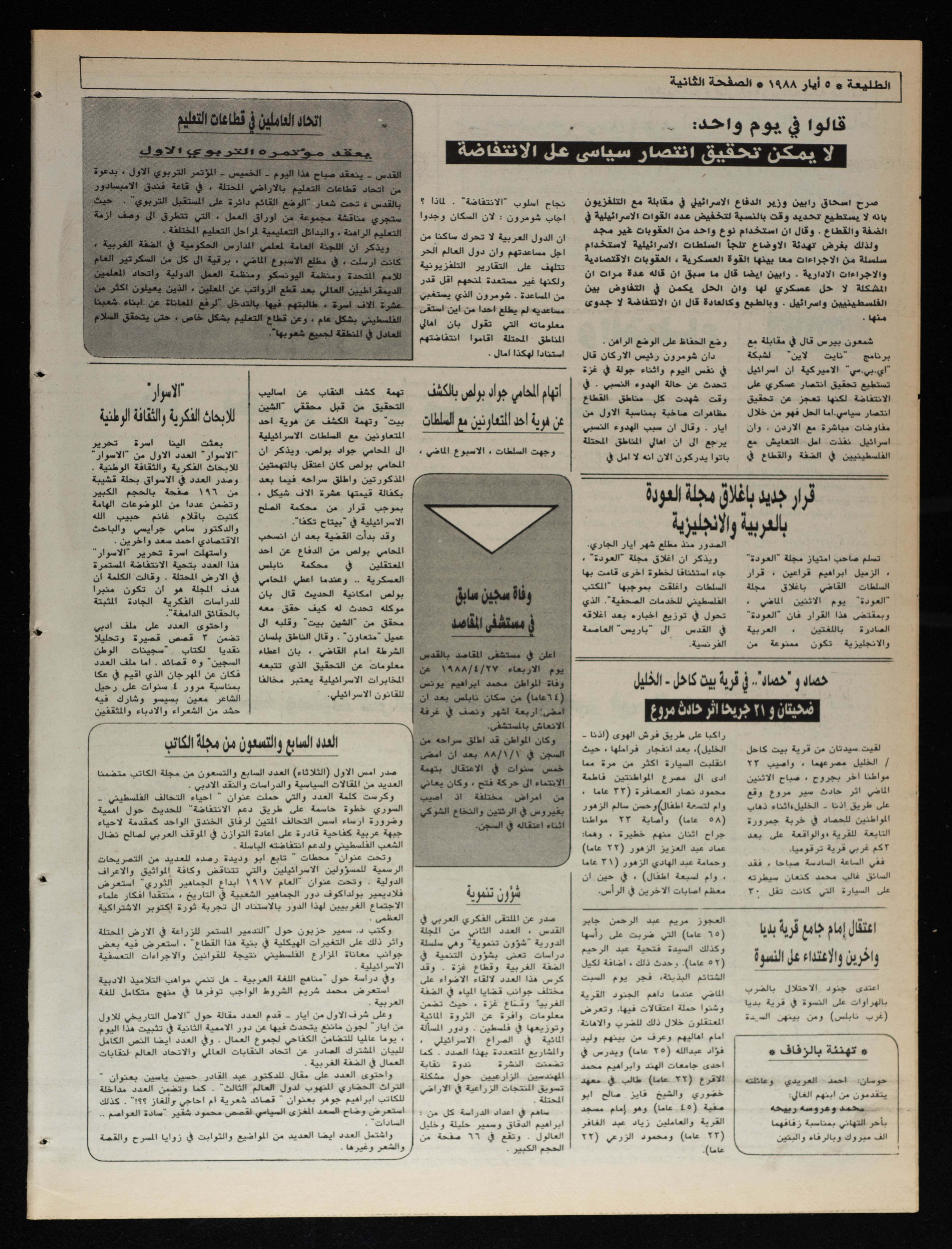 Printed in Salah ad-Din Press with Bashir al-Barghuthy as the managing editor, this 12-page issue no. 531 of Attaliʾah Newspaper was issued on 5 May 1987 and features the following news pieces: A shaheed and injuries at the labour day demonstrations. A full strike in the West Bank and Gaza Strip, curfew and blocking outlets with concrete. A U.S. military group in Cairo to continue with the memorandum of agreement. Violent confrontations and the death and injury of tens of individuals in the south. Egypt rents police and special forces for Saudi Arabia. A U.S. military movement to escalate the situation in the Gulf. Direct negotiations between Egypt and Israel to implement the U.S. resolution regarding Taba. In one day they said: There cannot be a political victory over the Intifada. An article by Bashir al-Barghuthy titled, "What lies behind raising the tension in the Gulf and Sothern Lebanon?" New Israeli administrative procedures following 21 weeks of the Intifada. Seven shuhadaʾ in six days. Security precautions in al-Quds (Jerusalem) on Friday. A significant deficit in revenues on Israeli products. The U.S. support of Israel ends when it no longer plays the protector of the U.S. interests. Public demonstrations and walkouts on 1 May. Tammun, the village that knows how to maintain its "life cycle" despite the blockades. Washington wanted a "Soviet Vietnam" Afghanistan but agreed to a solution it had refused for 6 years. The statement of the U.S. Government exposes the U.S.-Israeli collusion in the new Lebanon operation. Administrative detention against youth from the Bani Naʿim and Yatta. A press report from Washington: The Soviet Union stands with its stance on the Middle East.